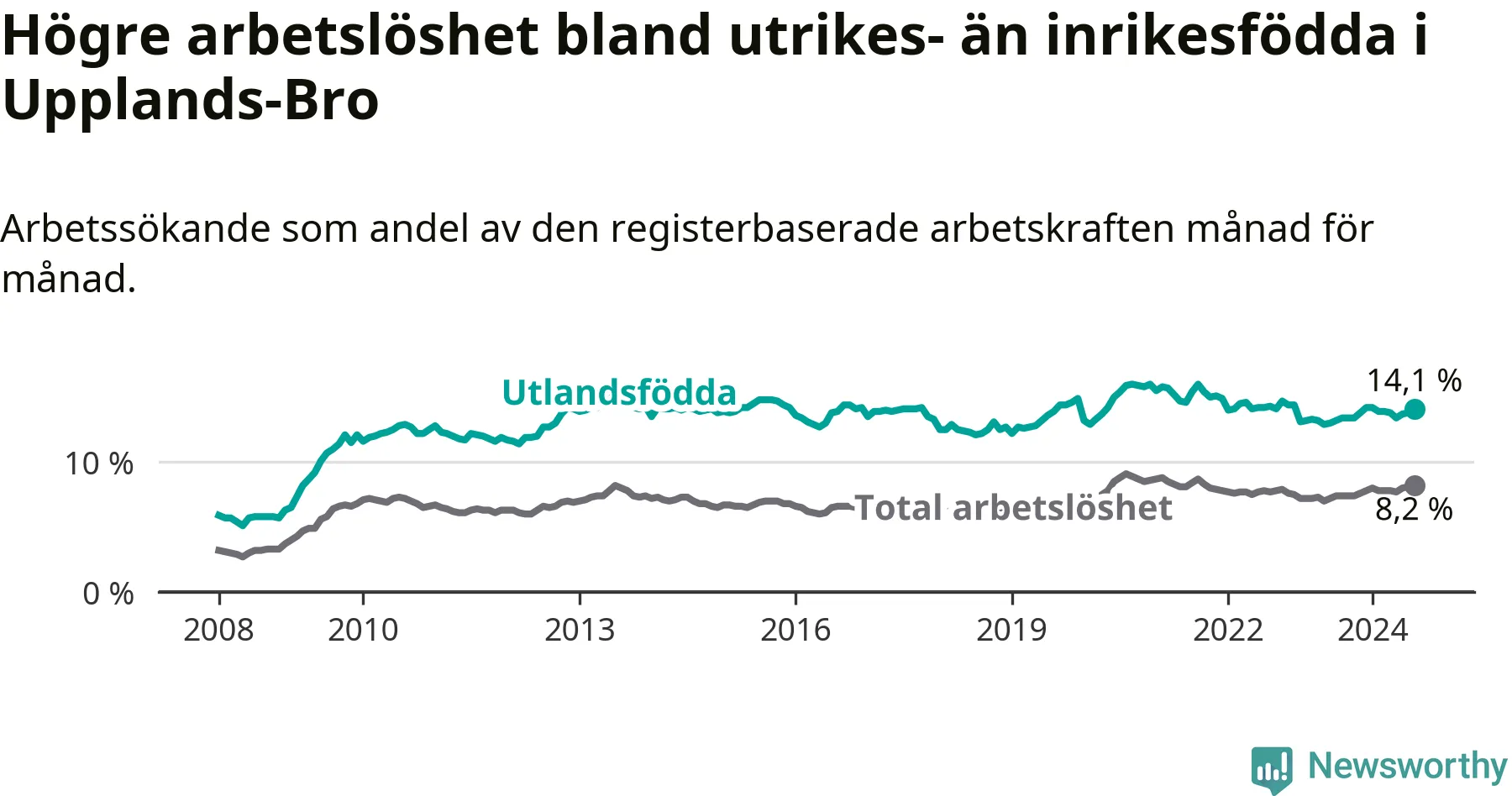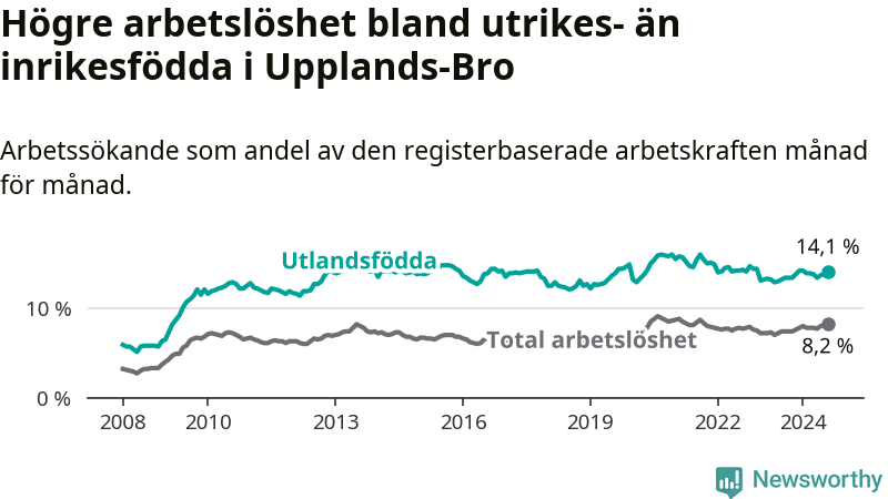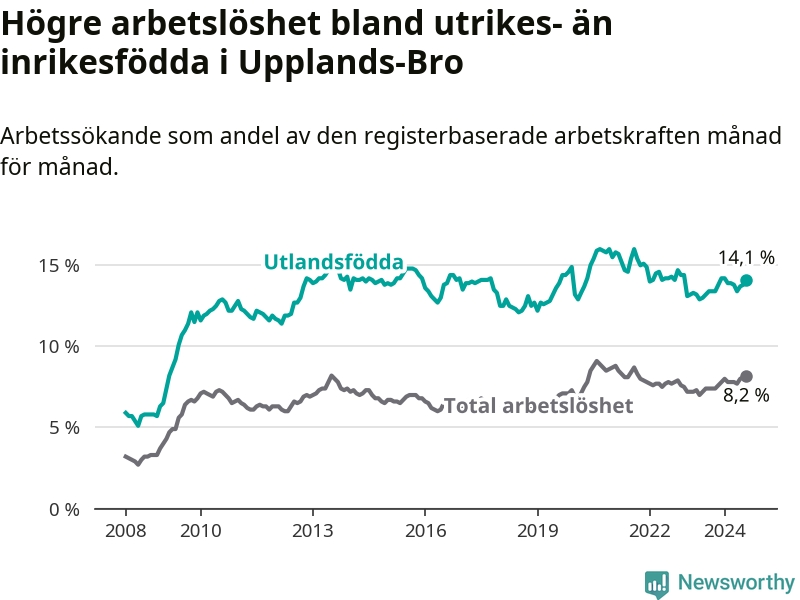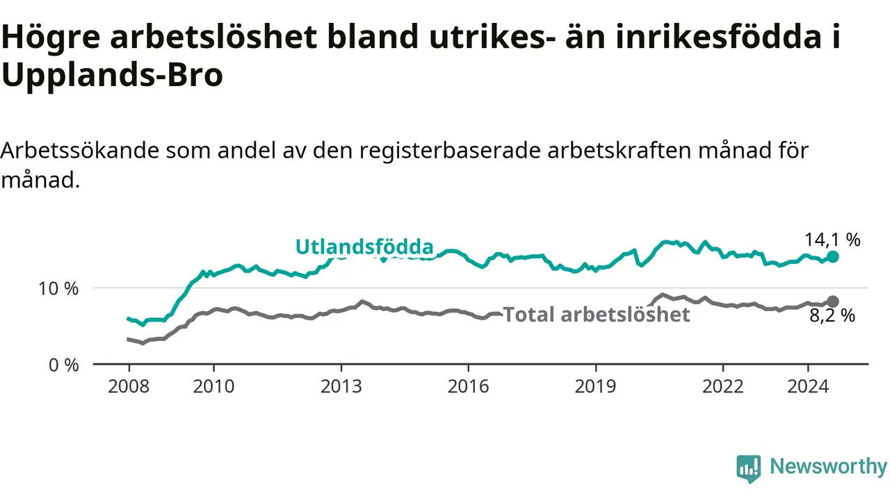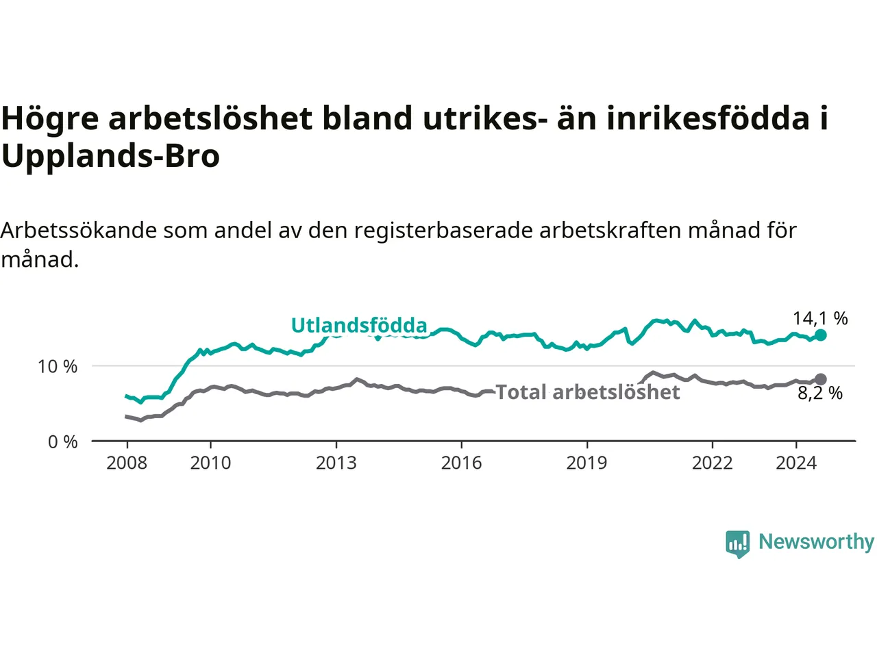 Arbetslösheten bland utlandsfödda var 14,1 procent i Upplands-Bro under augusti månad, motsvarande 976 av 6 922 personer. Det är 0,7 procentenheter fler än vid samma tidpunkt i fjol (+120 om man räknar personer). Därmed är de utlandsföddas arbetslöshet högre än vid samma tidpunkt i fjol för åttonde månaden i följd.