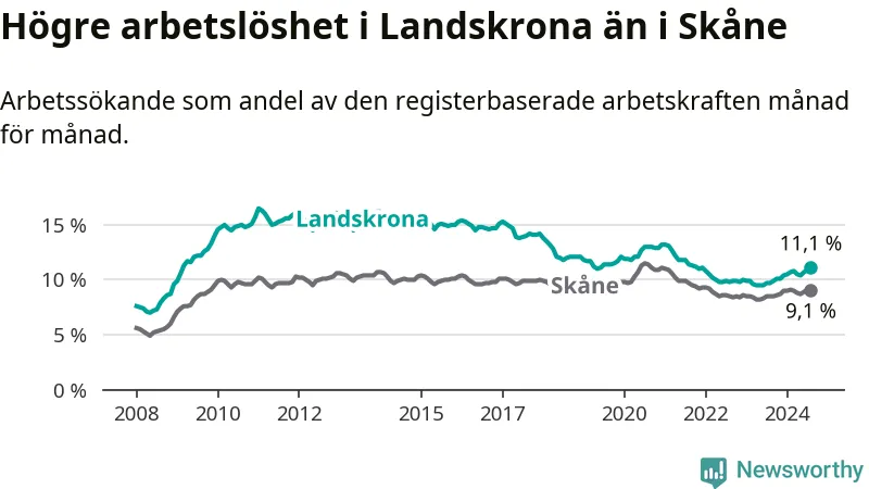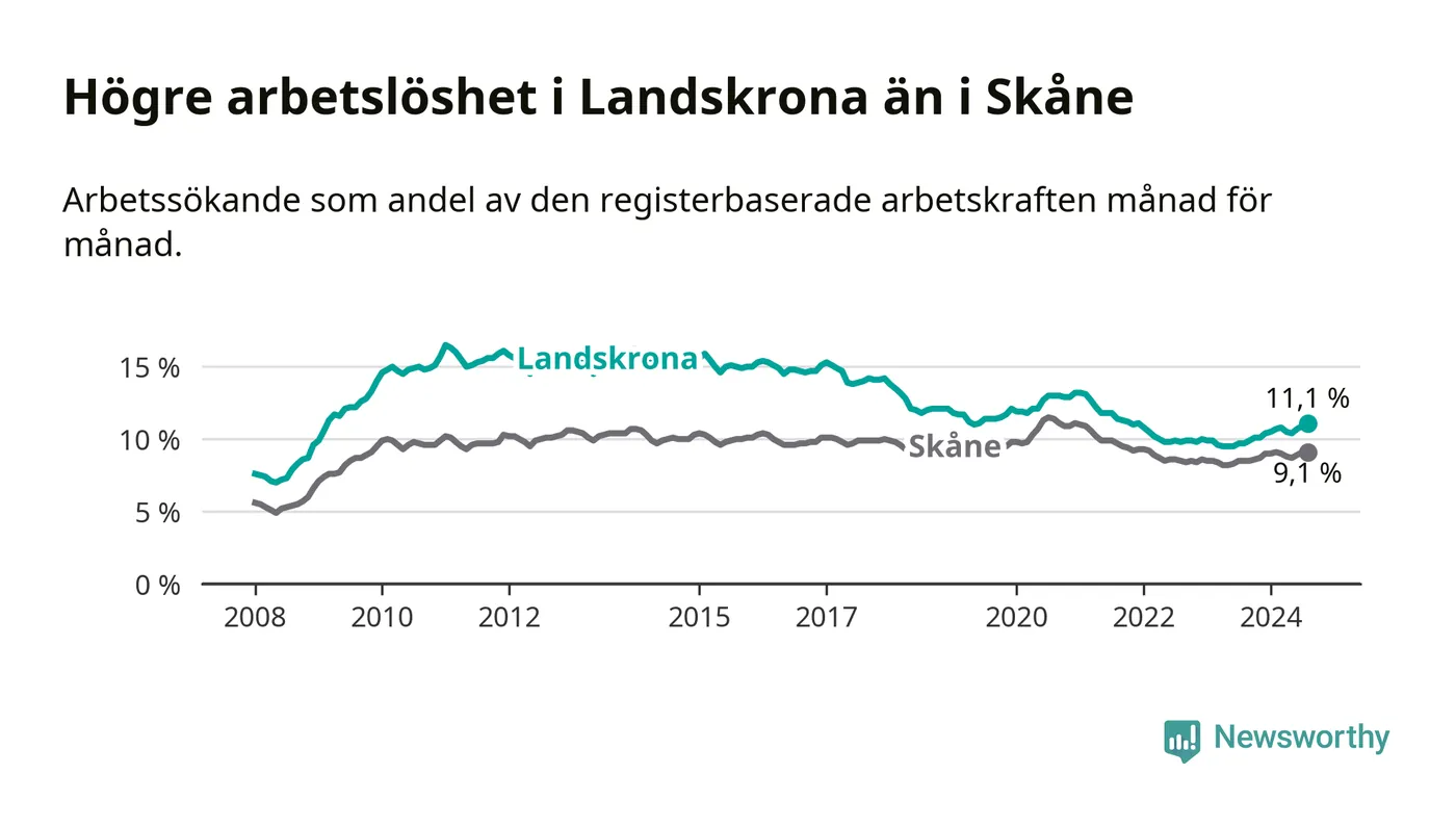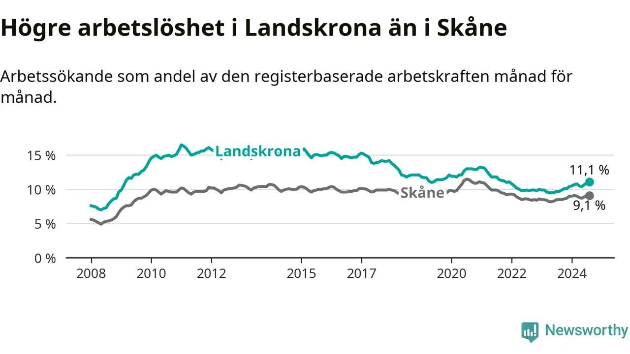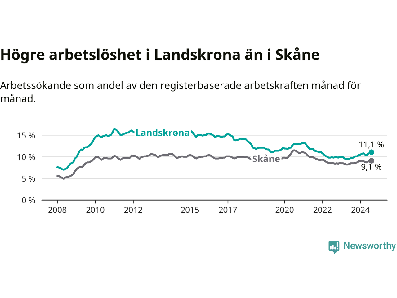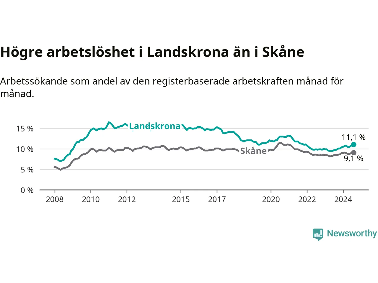 Det är elfte månaden i följd som arbetslösheten i Landskrona är högre än den var under samma tidpunkt året innan. Sedan september 2023 har arbetslösheten gått upp från 9,9 till 11,1 procent. Den nuvarande arbetslöshetsnivån är därmed den högsta sedan december 2021.