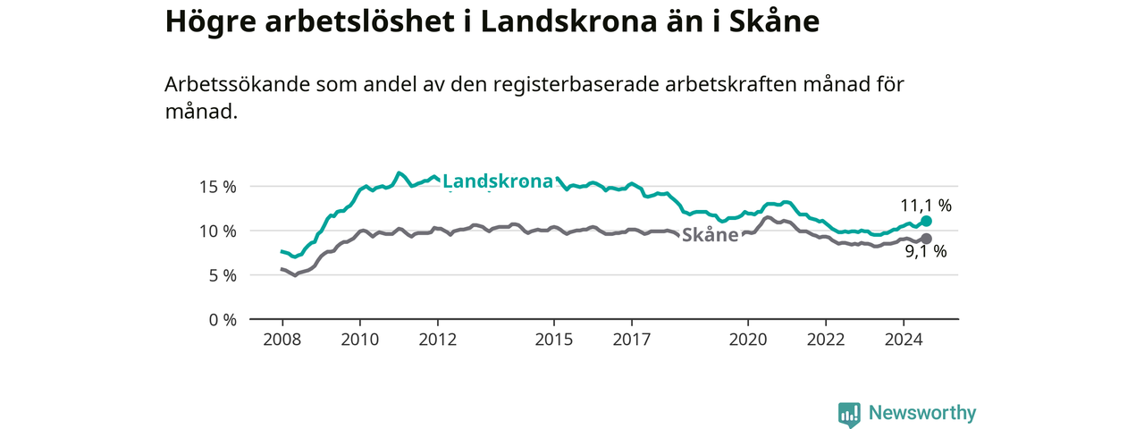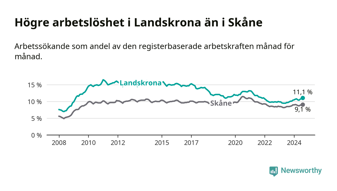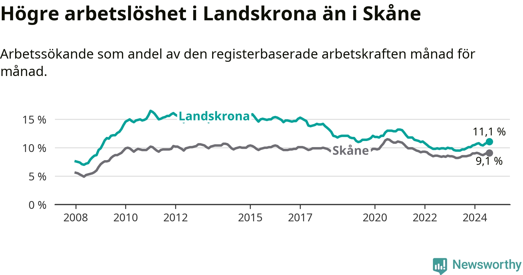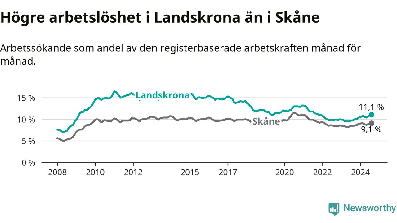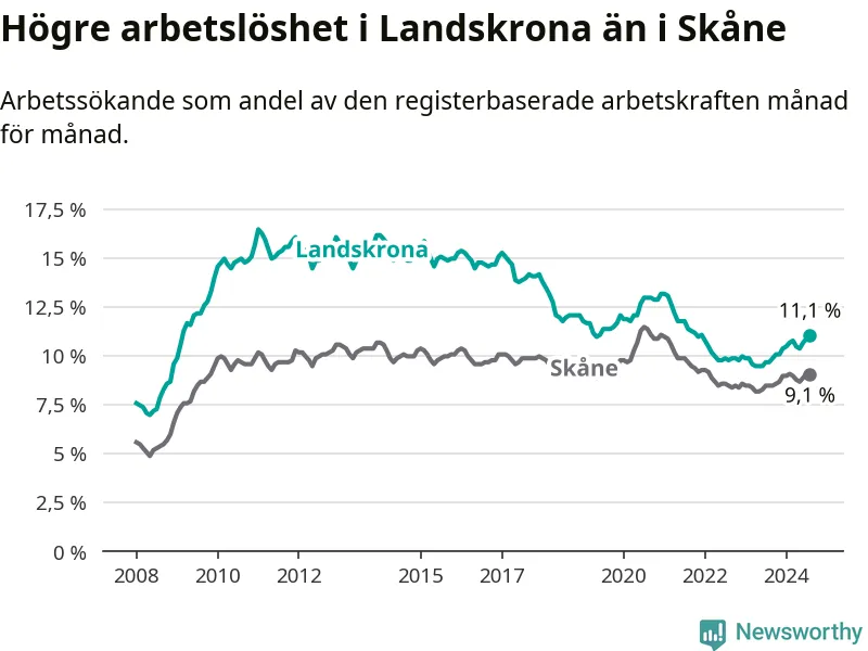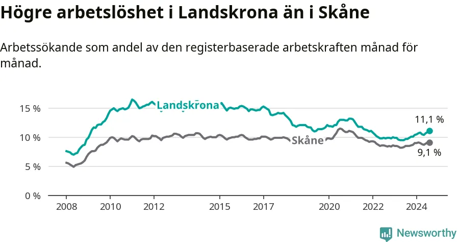Det är elfte månaden i följd som arbetslösheten i Landskrona är högre än den var under samma tidpunkt året innan. Sedan september 2023 har arbetslösheten gått upp från 9,9 till 11,1 procent. Den nuvarande arbetslöshetsnivån är därmed den högsta sedan december 2021.