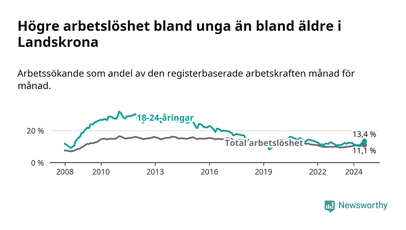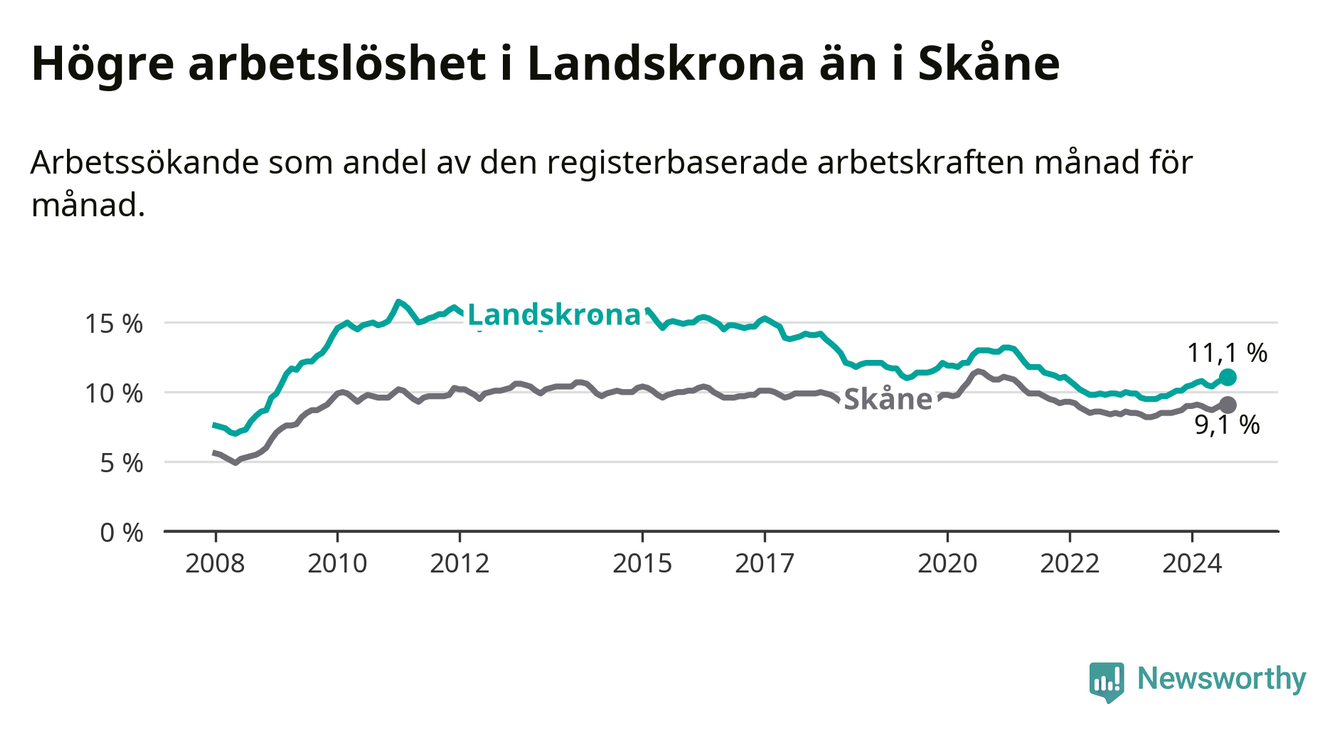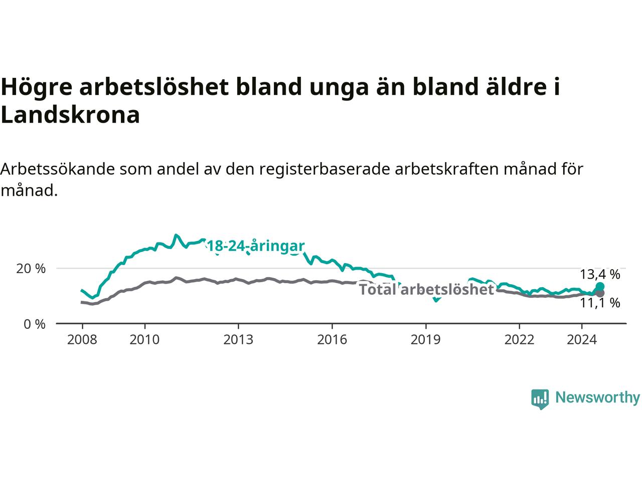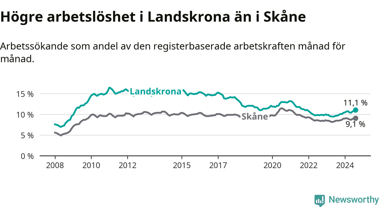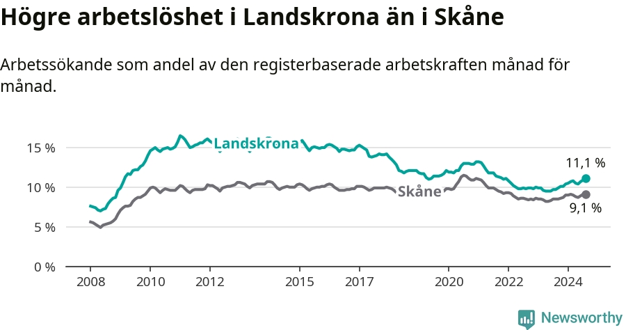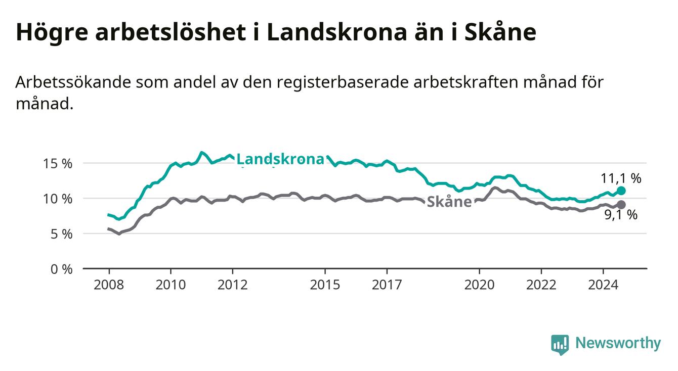 Det är elfte månaden i följd som arbetslösheten i Landskrona är högre än den var under samma tidpunkt året innan. Sedan september 2023 har arbetslösheten gått upp från 9,9 till 11,1 procent. Den nuvarande arbetslöshetsnivån är därmed den högsta sedan december 2021.
