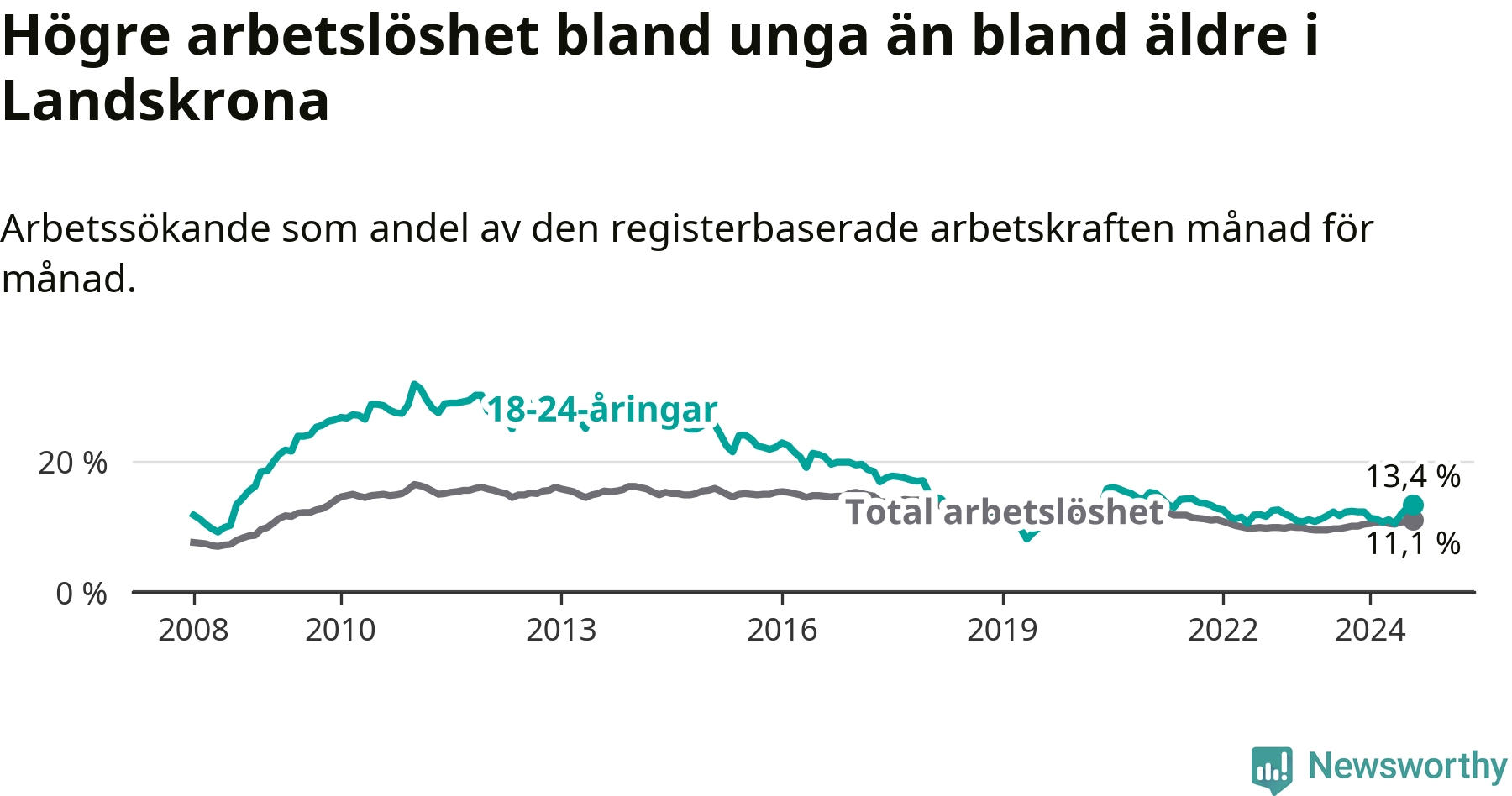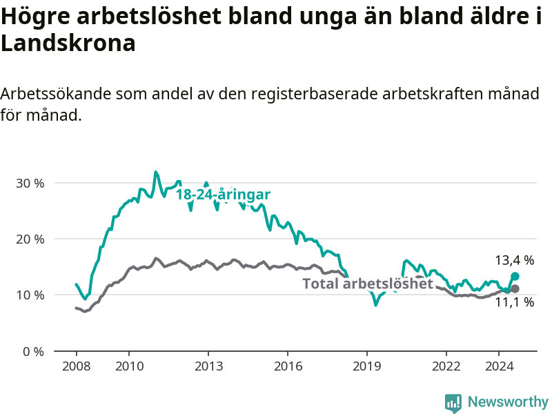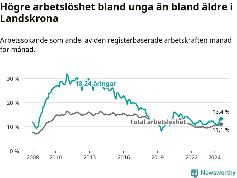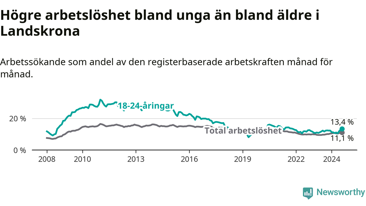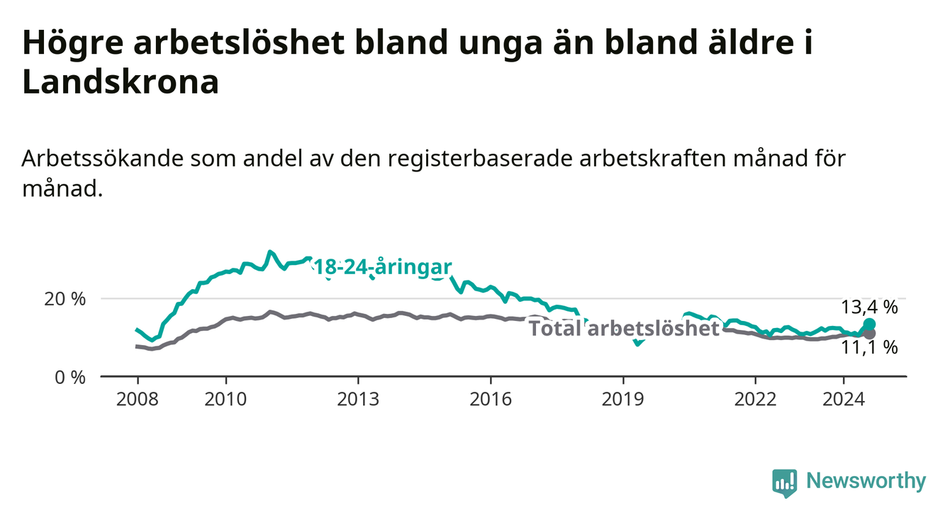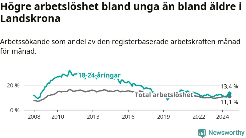 Det är elfte månaden i följd som arbetslösheten i Landskrona är högre än den var under samma tidpunkt året innan. Sedan september 2023 har arbetslösheten gått upp från 9,9 till 11,1 procent. Den nuvarande arbetslöshetsnivån är därmed den högsta sedan december 2021.
