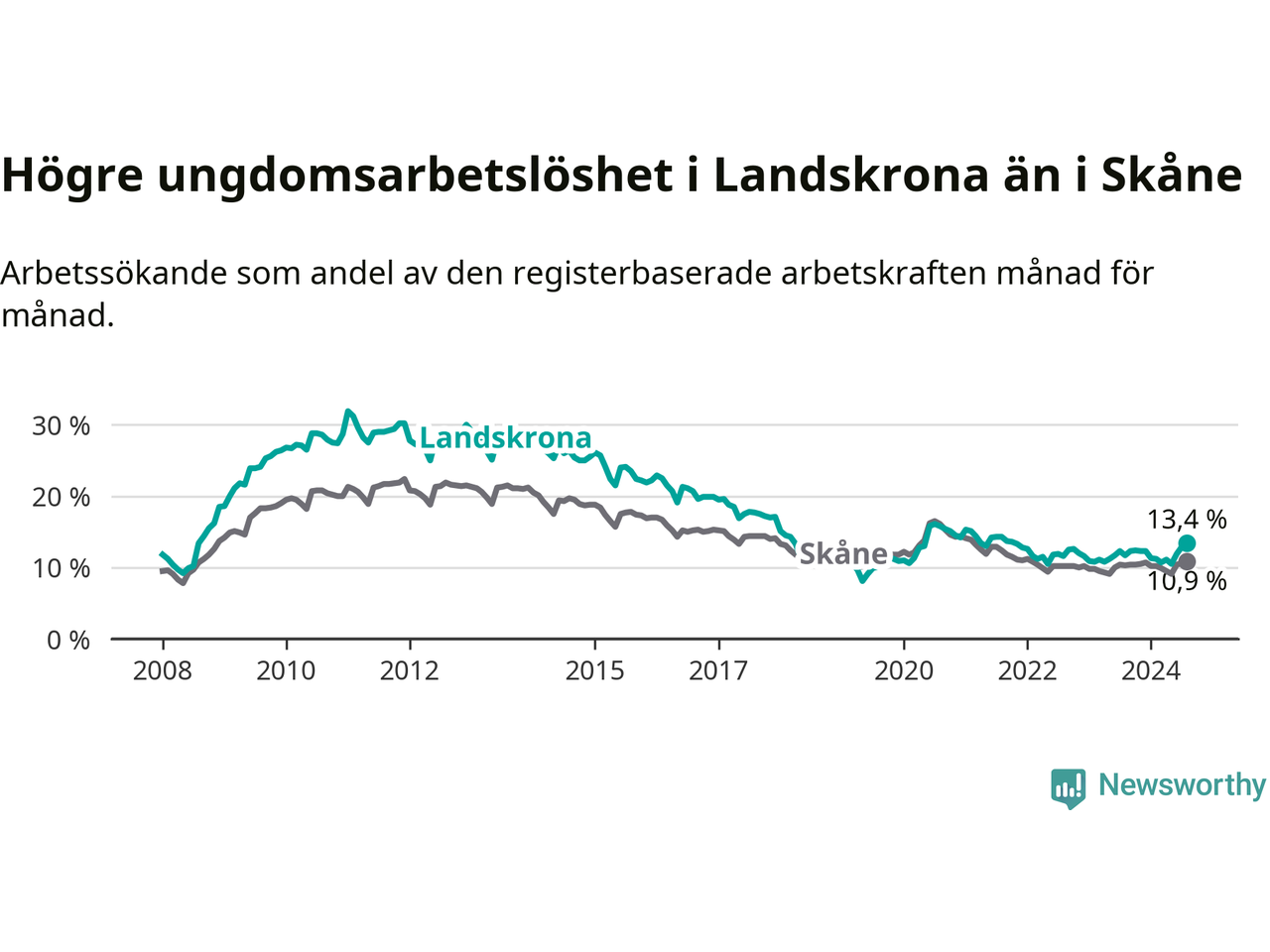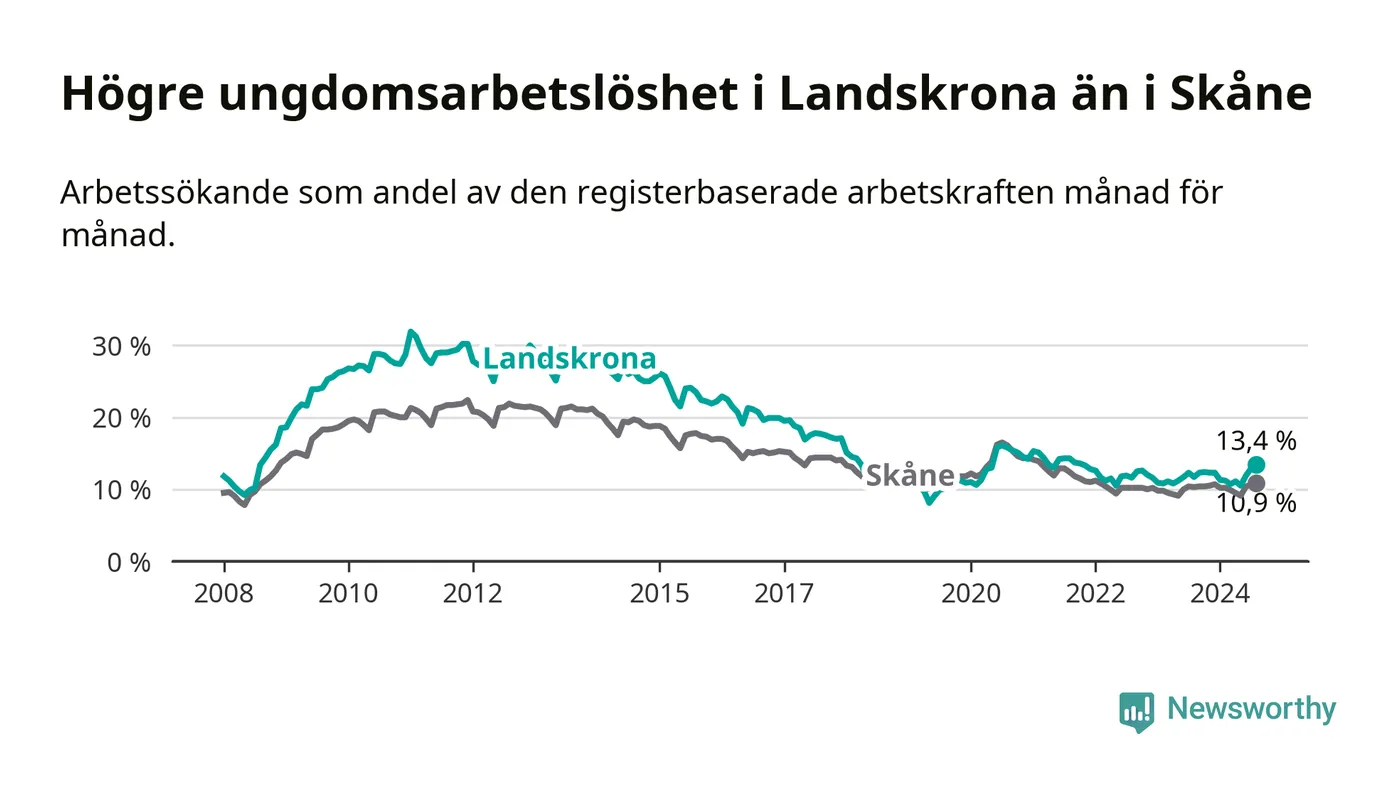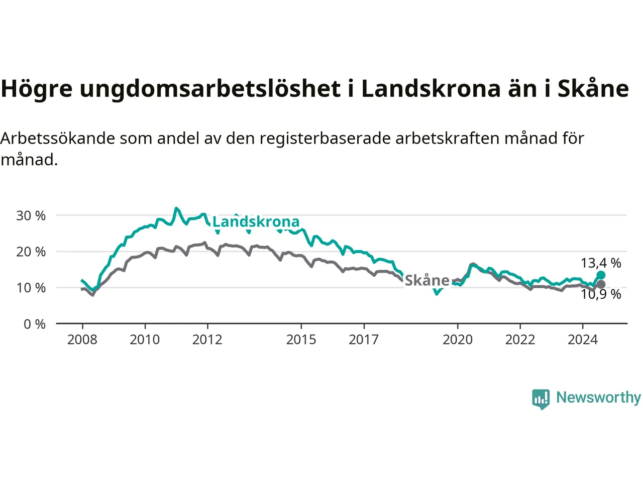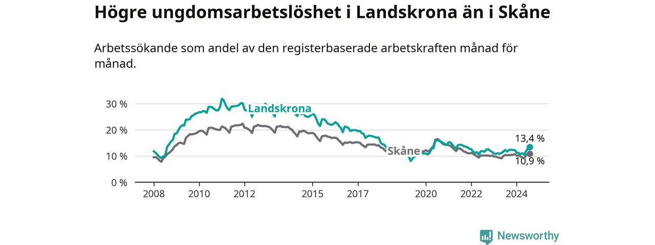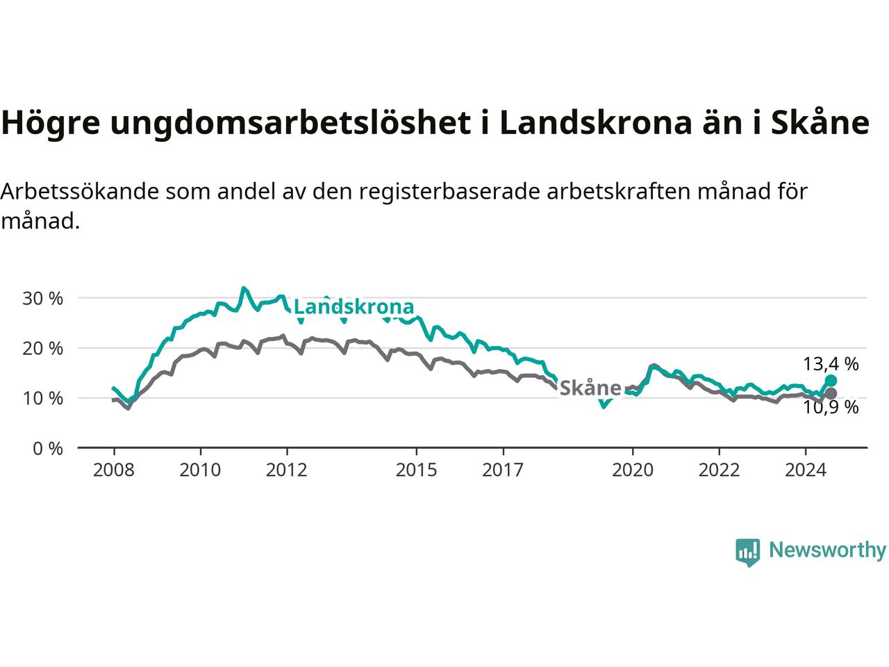 Precis som den totala arbetslösheten ligger ungdomsarbetslösheten i Landskrona högre än i Skåne som helhet. Skillnaden mellan kommunen och länet är 2,5 procentenheter.