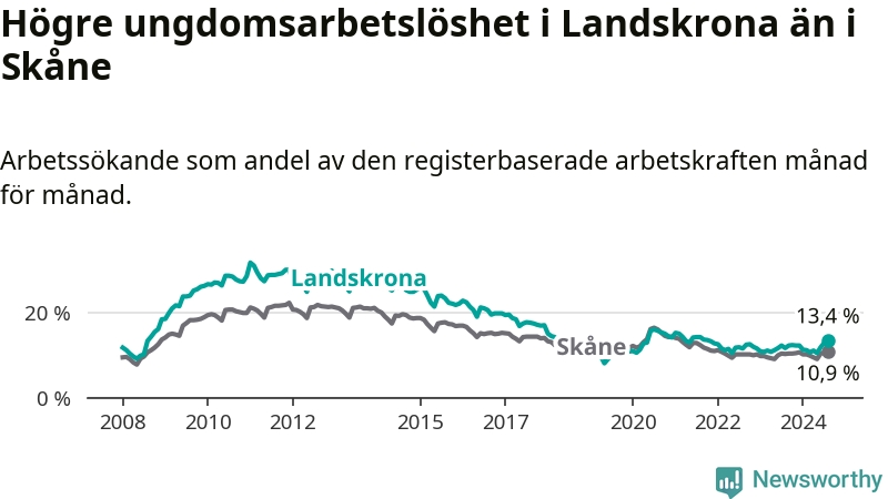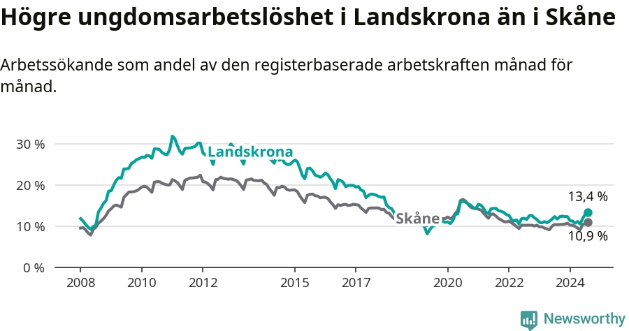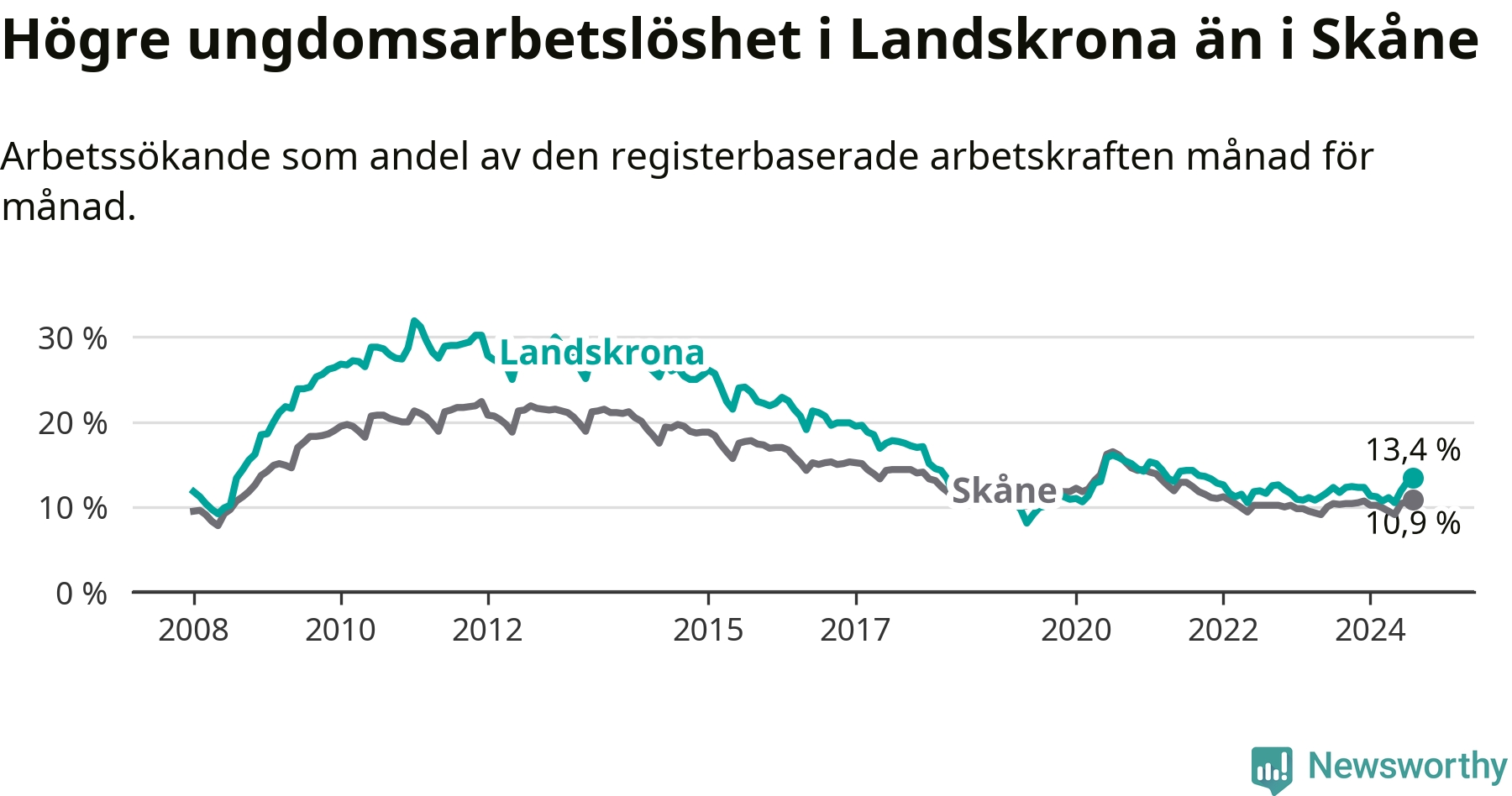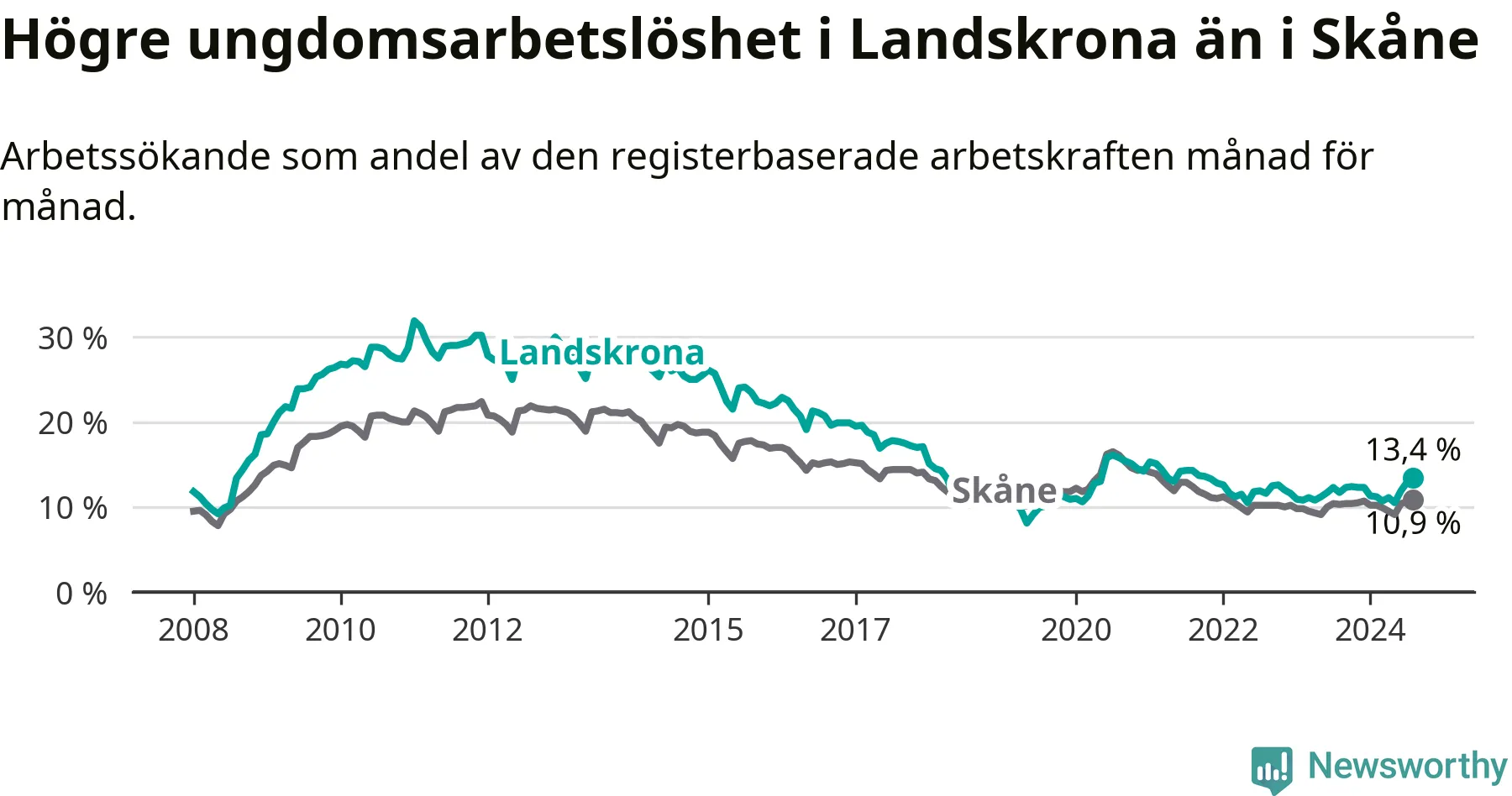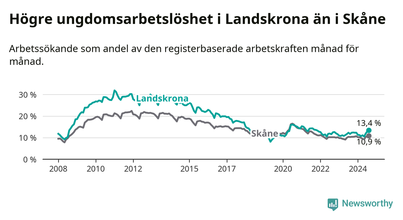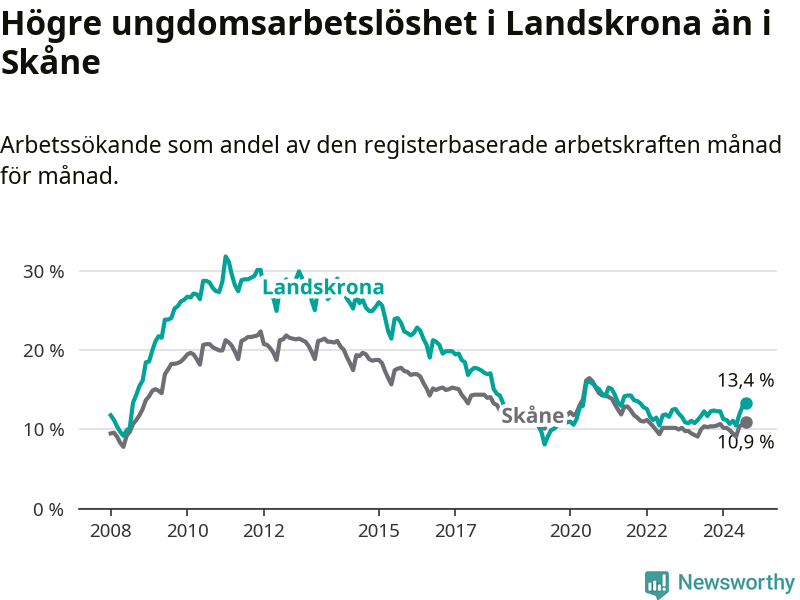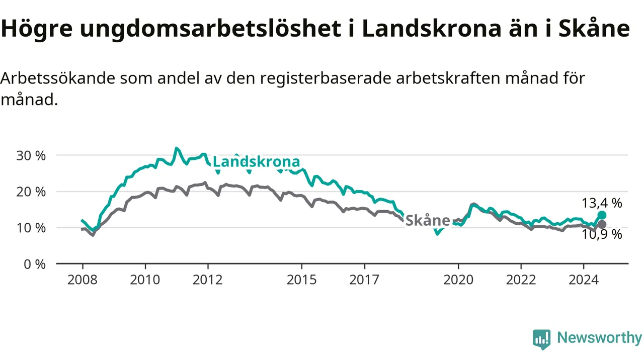 Precis som den totala arbetslösheten ligger ungdomsarbetslösheten i Landskrona högre än i Skåne som helhet. Skillnaden mellan kommunen och länet är 2,5 procentenheter.