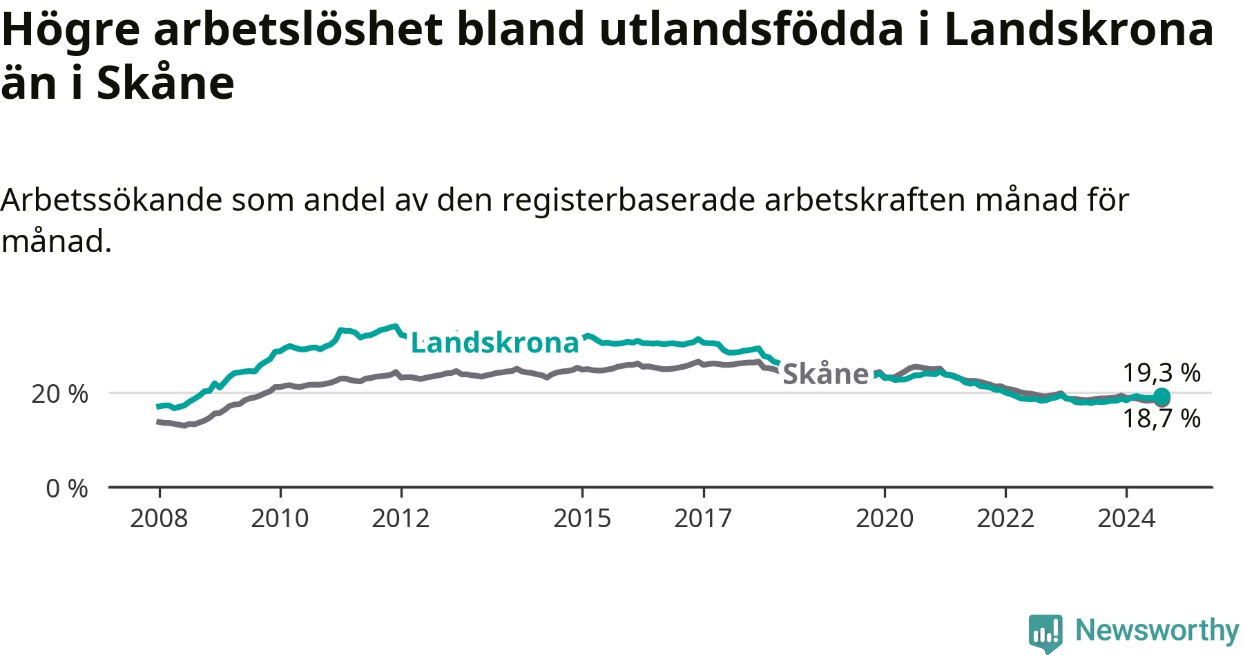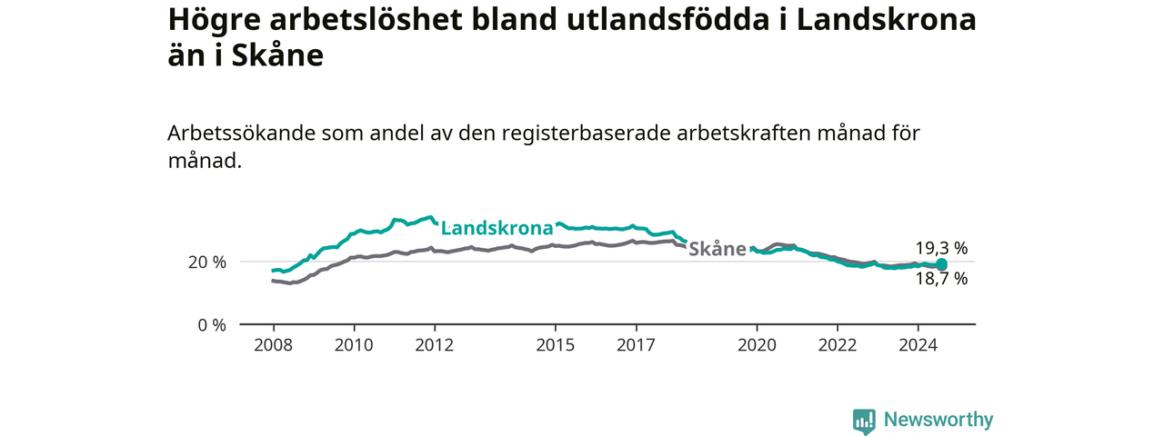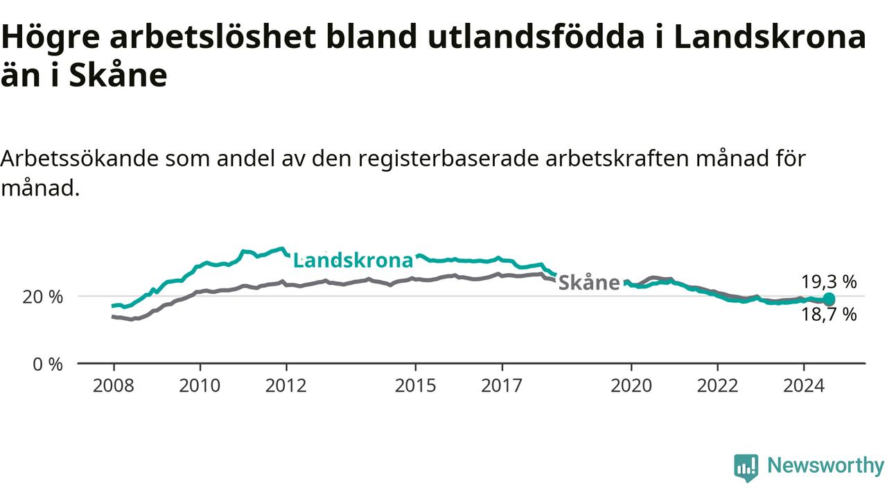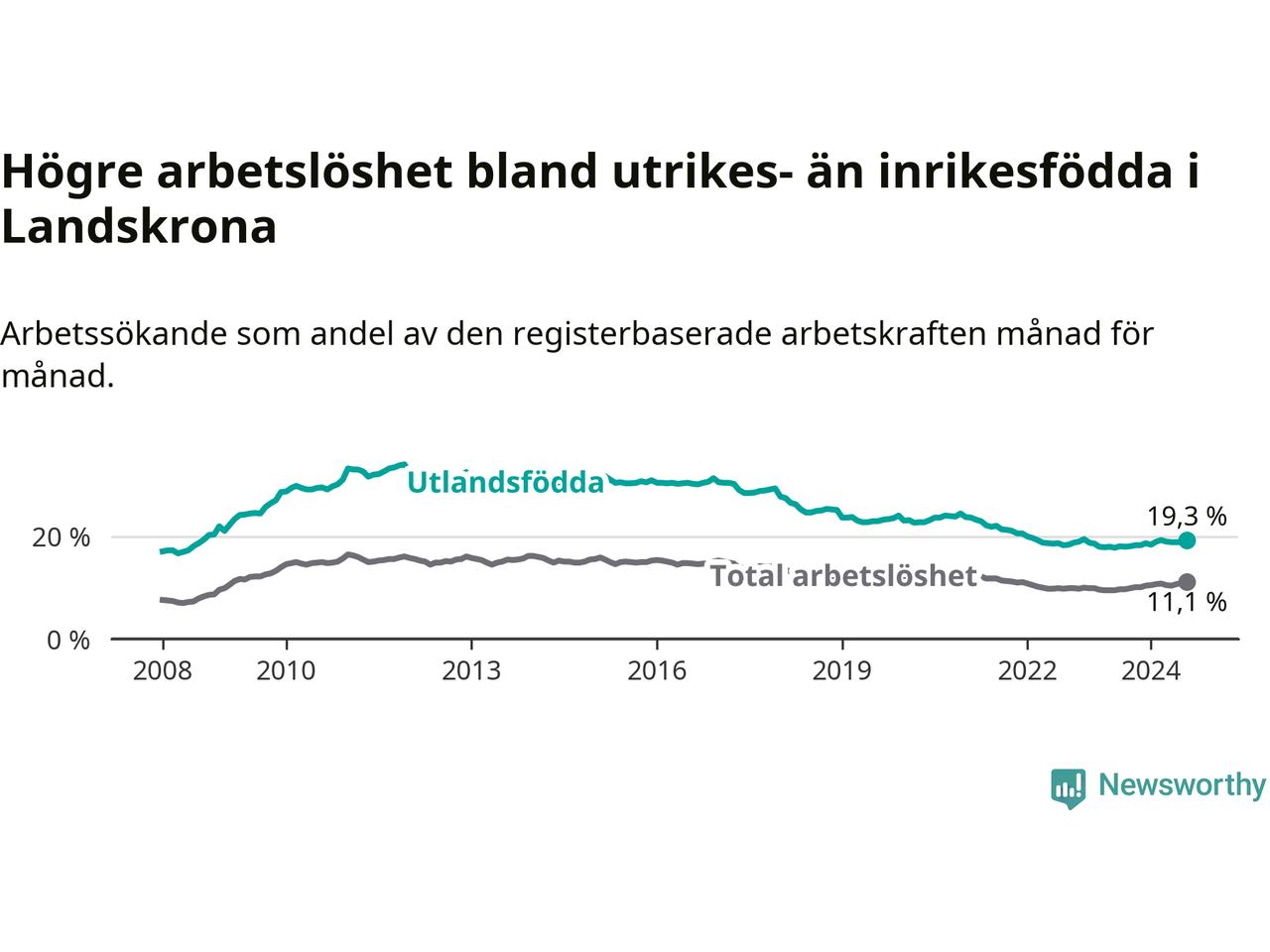 Arbetslösheten bland utlandsfödda var 19,3 procent i Landskrona under augusti månad, motsvarande 1 450 av 7 513 personer. Det är 1,3 procentenheter fler än vid samma tidpunkt i fjol (+156 om man räknar personer). Därmed är de utlandsföddas arbetslöshet högre än vid samma tidpunkt i fjol för sjunde månaden i följd.