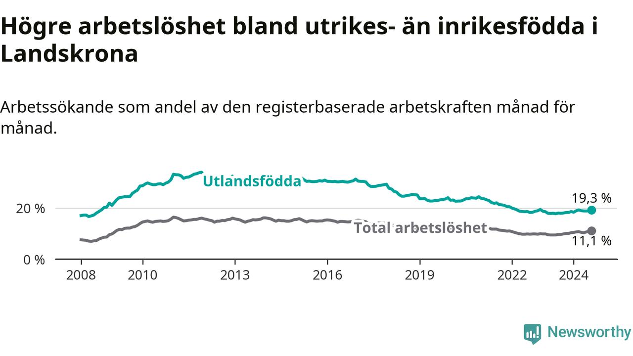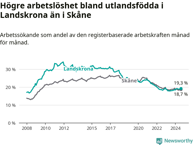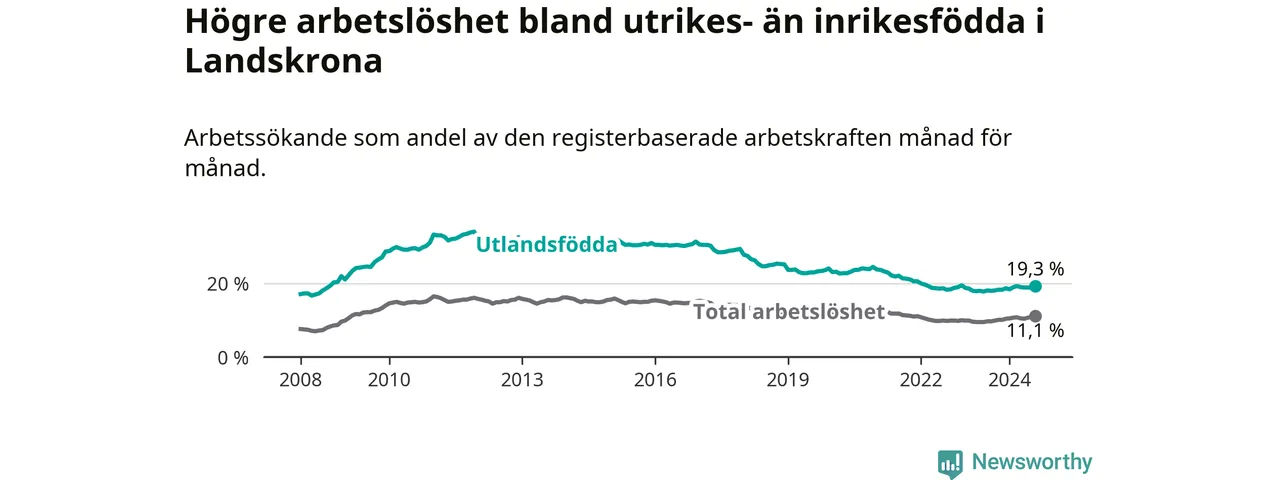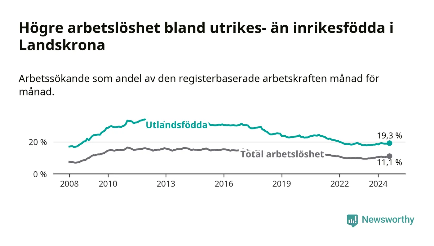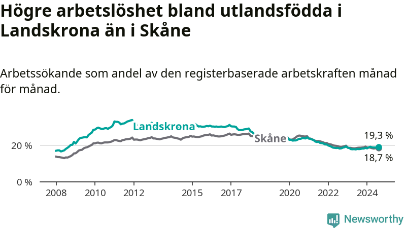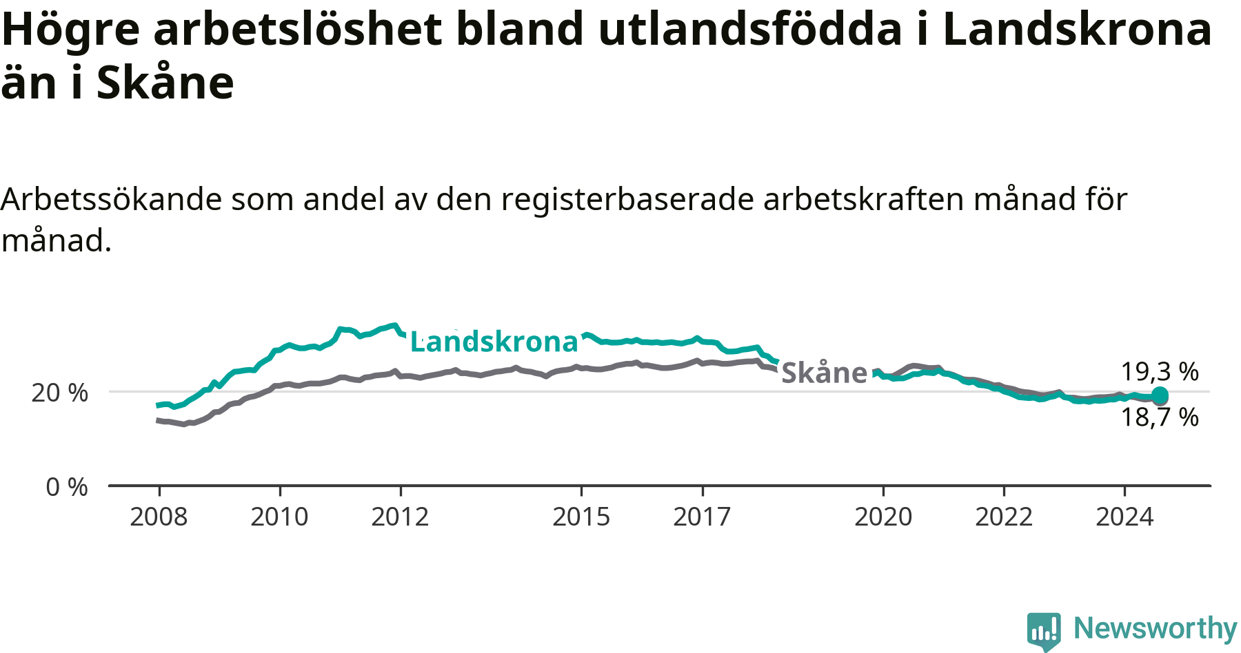 Arbetslösheten bland utlandsfödda var 19,3 procent i Landskrona under augusti månad, motsvarande 1 450 av 7 513 personer. Det är 1,3 procentenheter fler än vid samma tidpunkt i fjol (+156 om man räknar personer). Därmed är de utlandsföddas arbetslöshet högre än vid samma tidpunkt i fjol för sjunde månaden i följd.