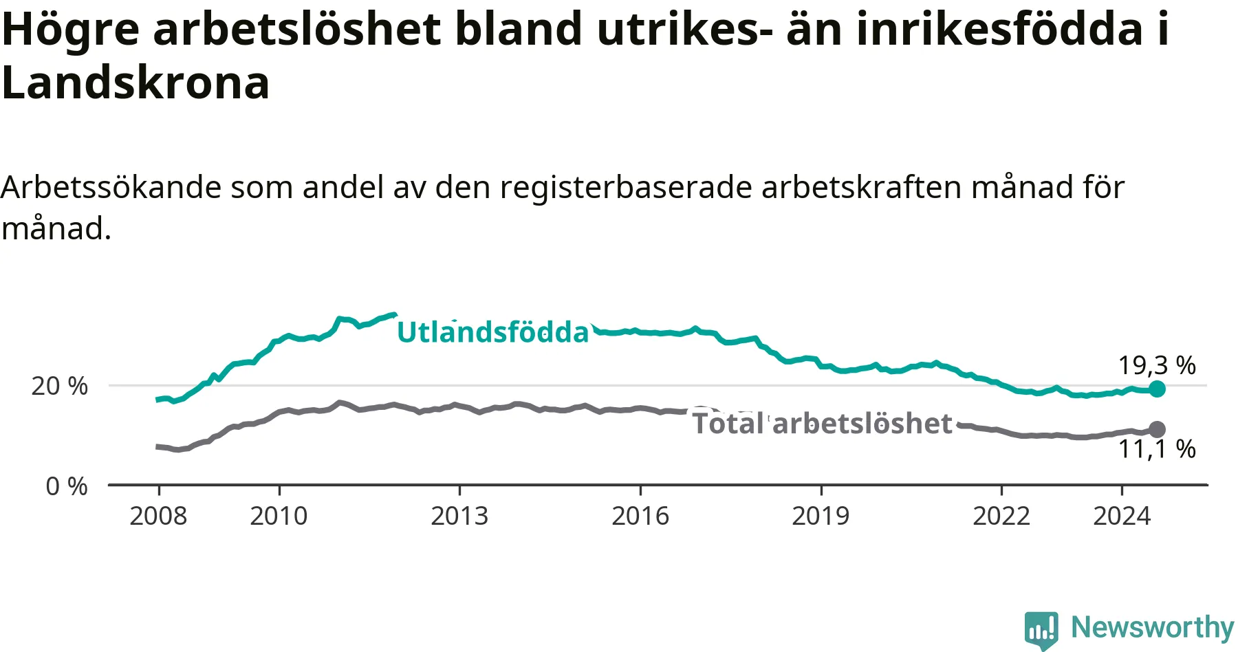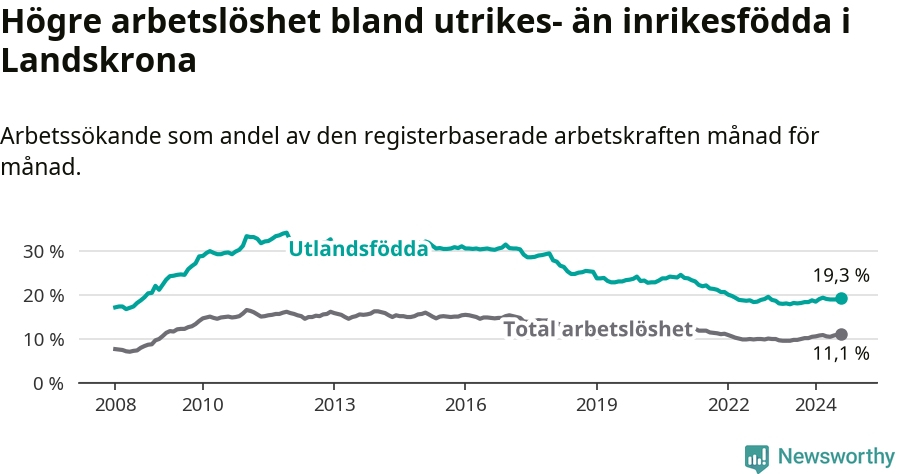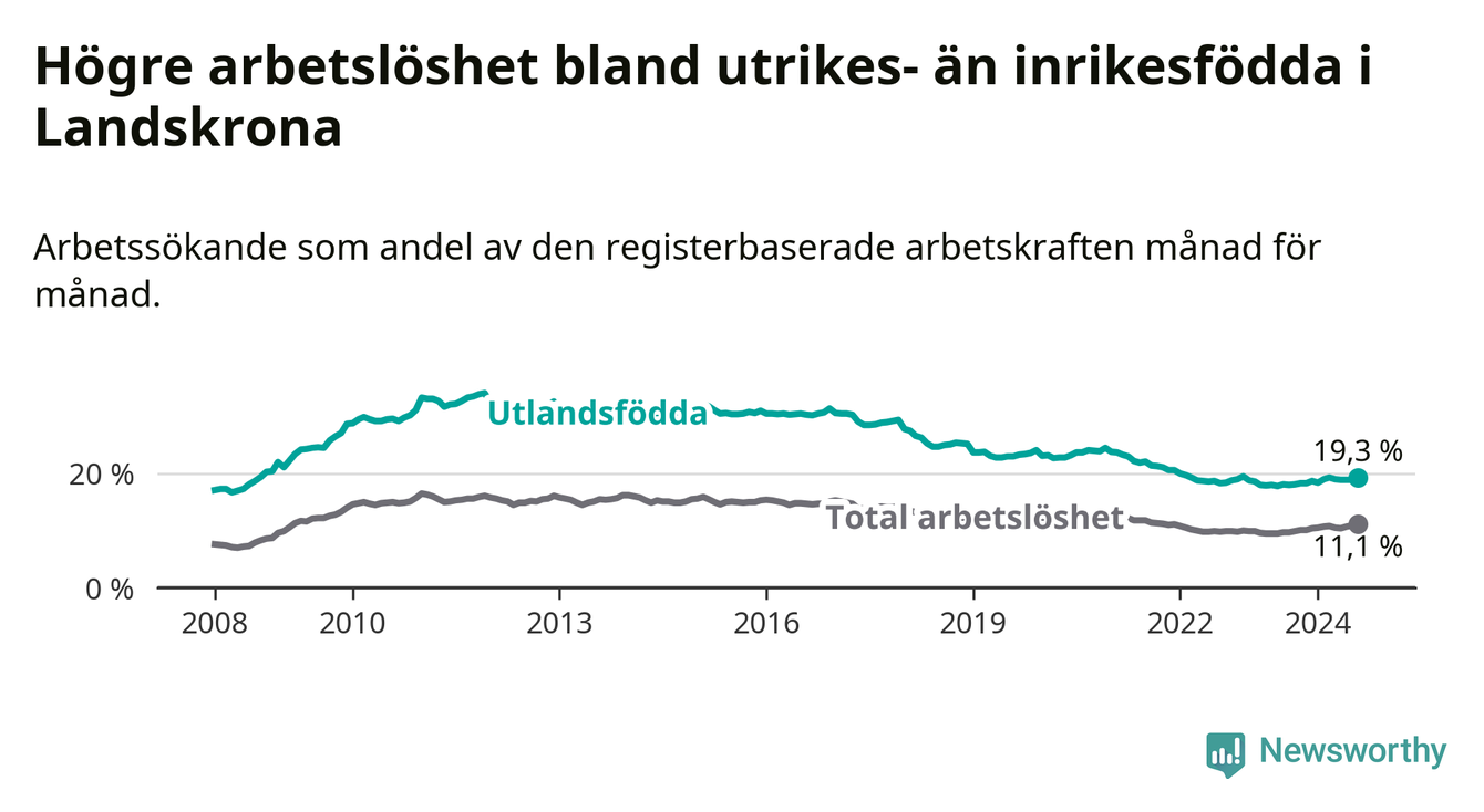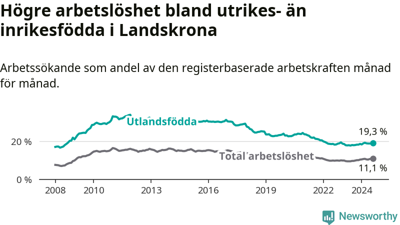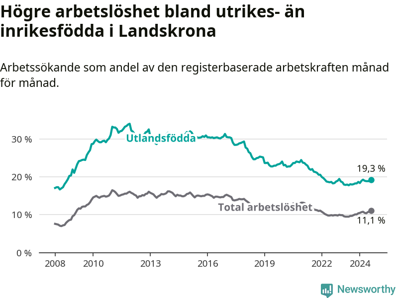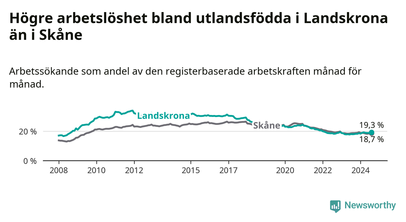 Arbetslösheten bland utlandsfödda var 19,3 procent i Landskrona under augusti månad, motsvarande 1 450 av 7 513 personer. Det är 1,3 procentenheter fler än vid samma tidpunkt i fjol (+156 om man räknar personer). Därmed är de utlandsföddas arbetslöshet högre än vid samma tidpunkt i fjol för sjunde månaden i följd.