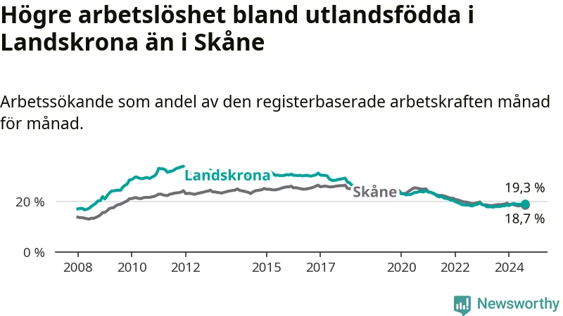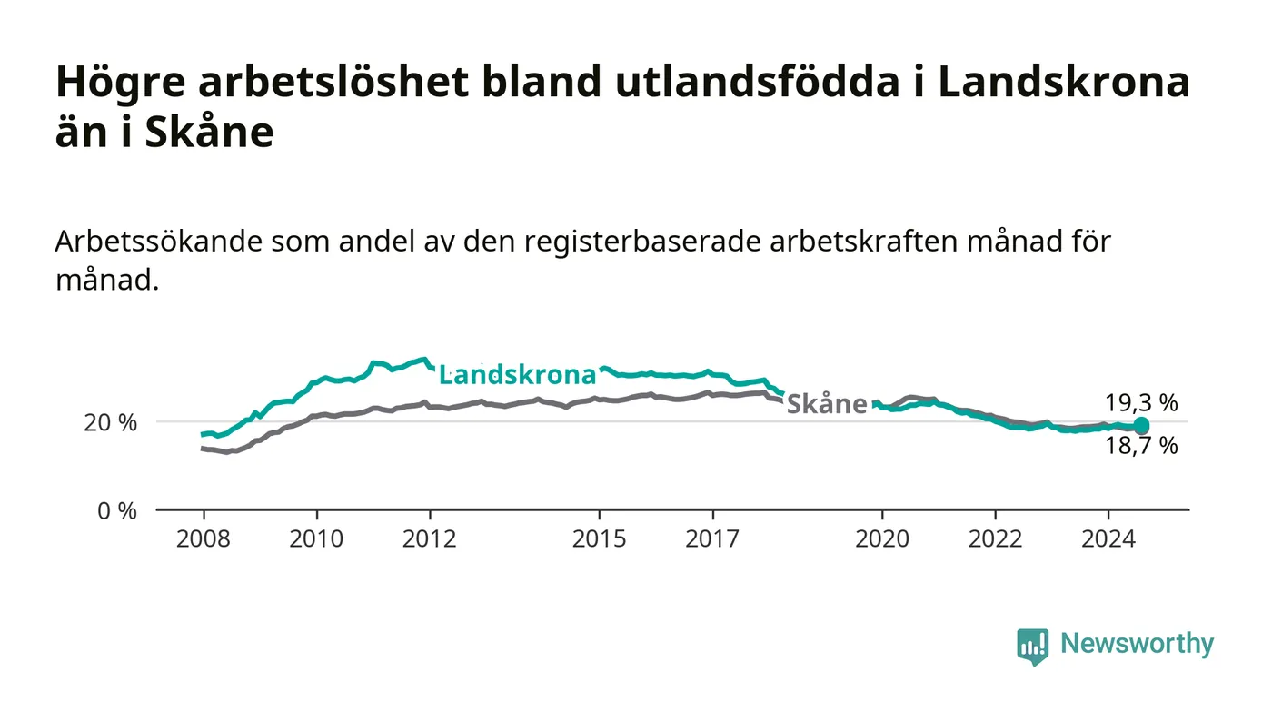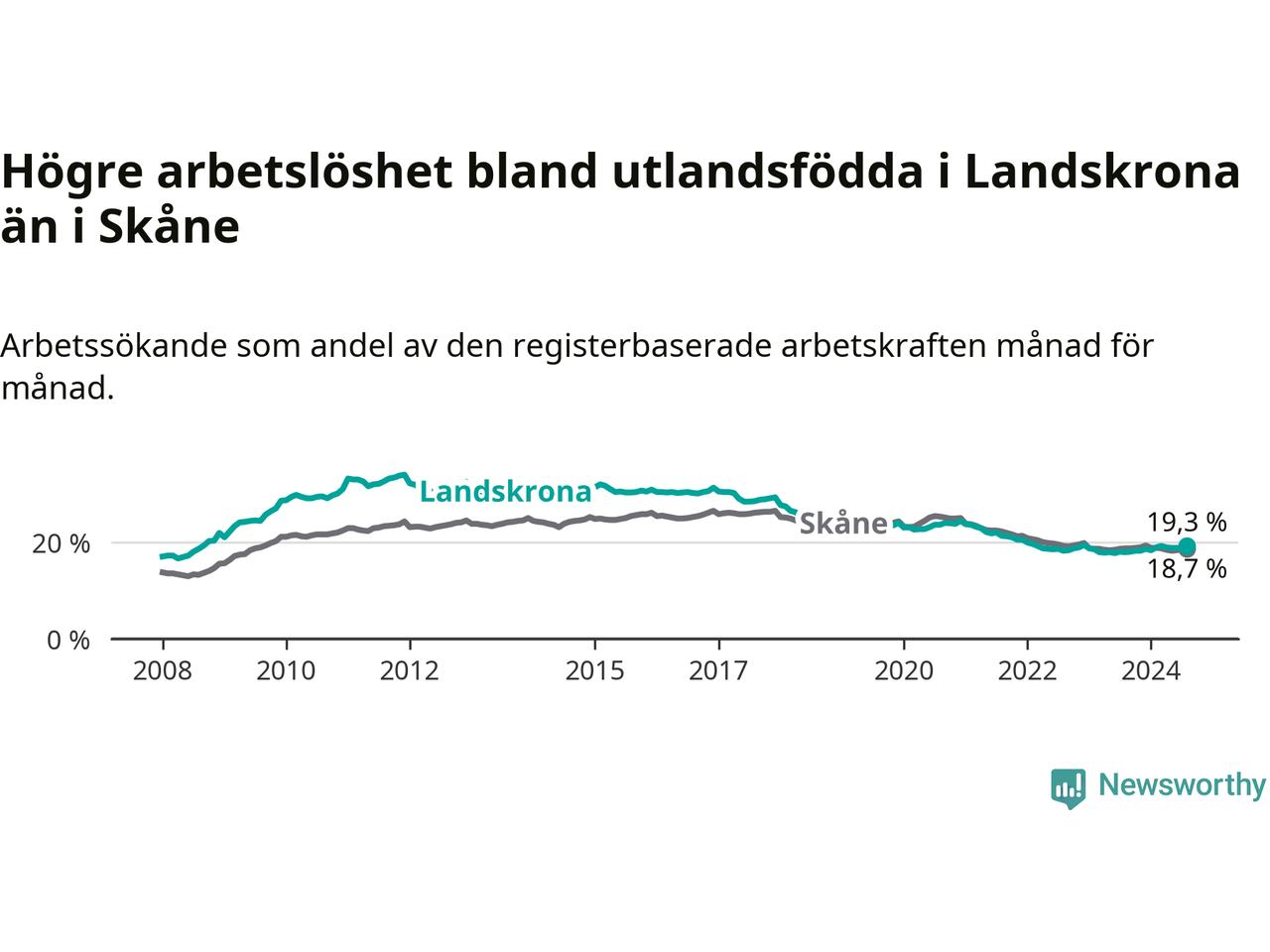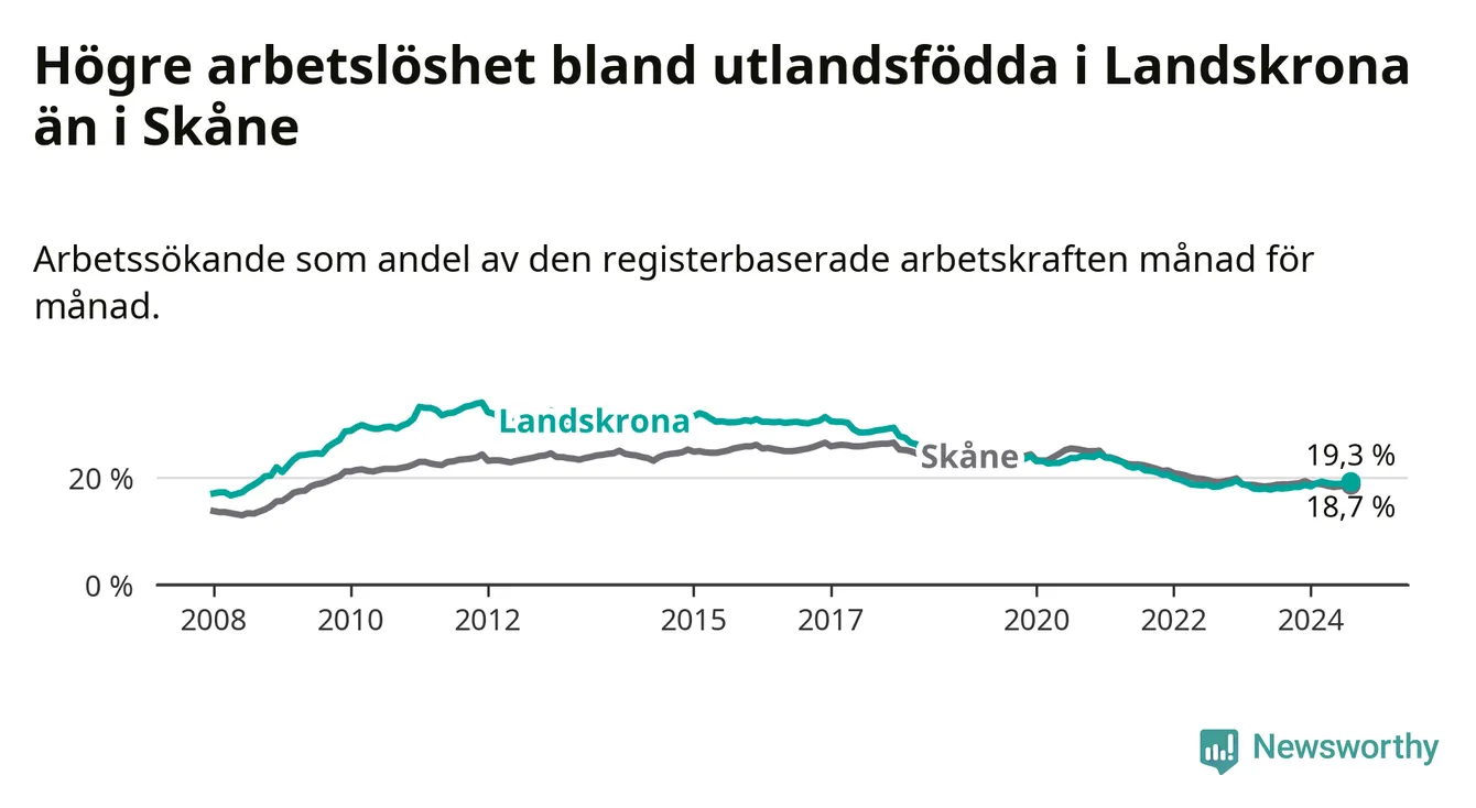Medan arbetslösheten bland utlandsfödda alltså ökar i Landskrona så minskar den i Skåne. Jämfört med augusti förra året har andelen arbetslösa utlandsfödda i länet minskat med 0,1 procentenheter (till 18,7 procent).