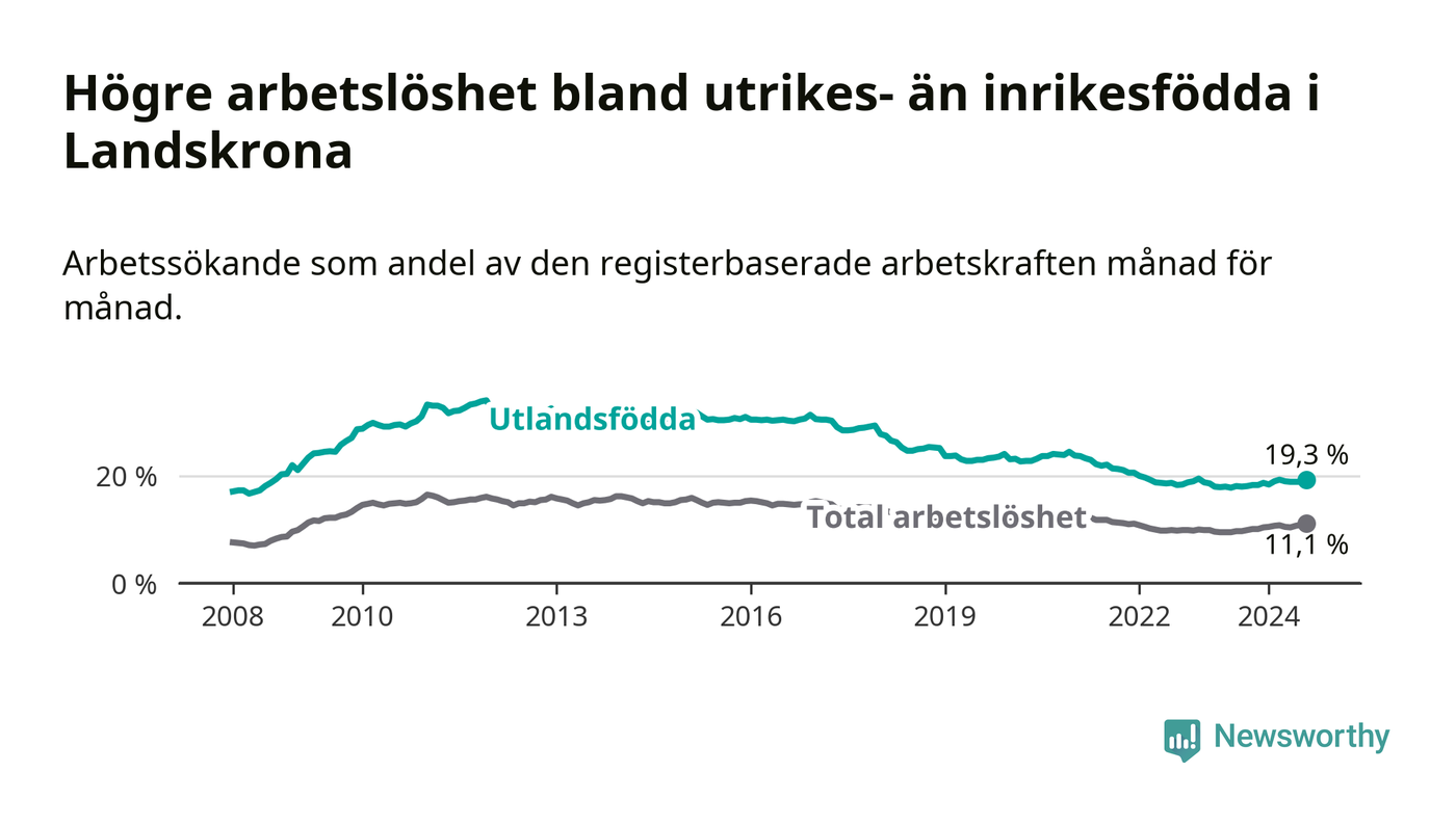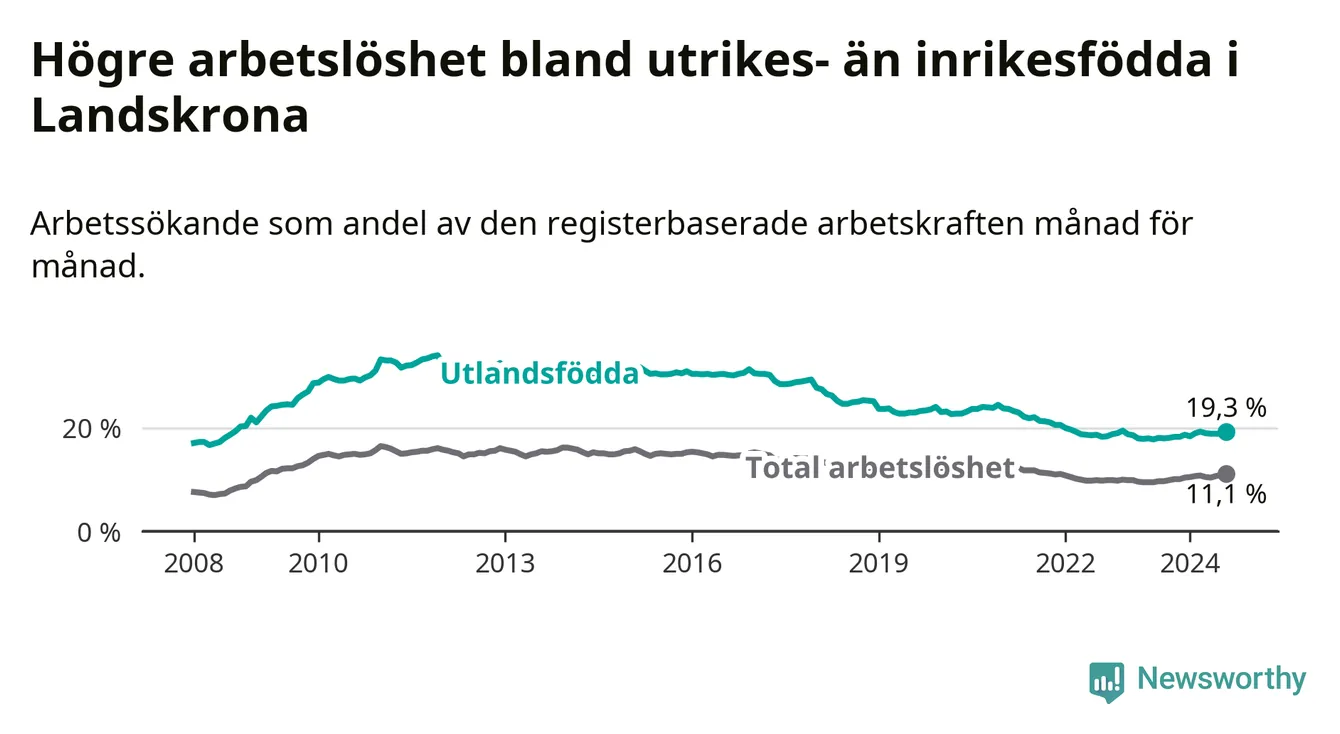 Skillnaden i arbetslöshet mellan utrikesfödda och hela befolkningen är 8,2 procentenheter i Landskrona.