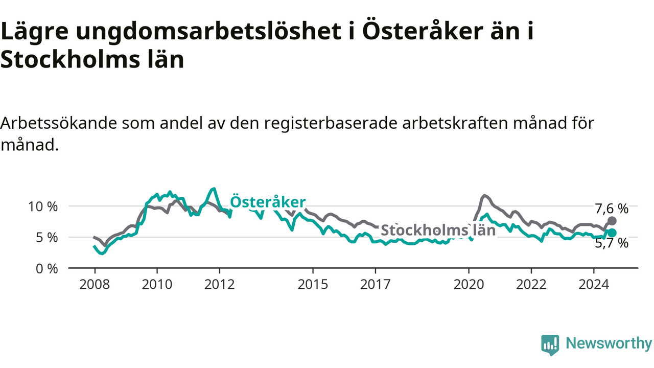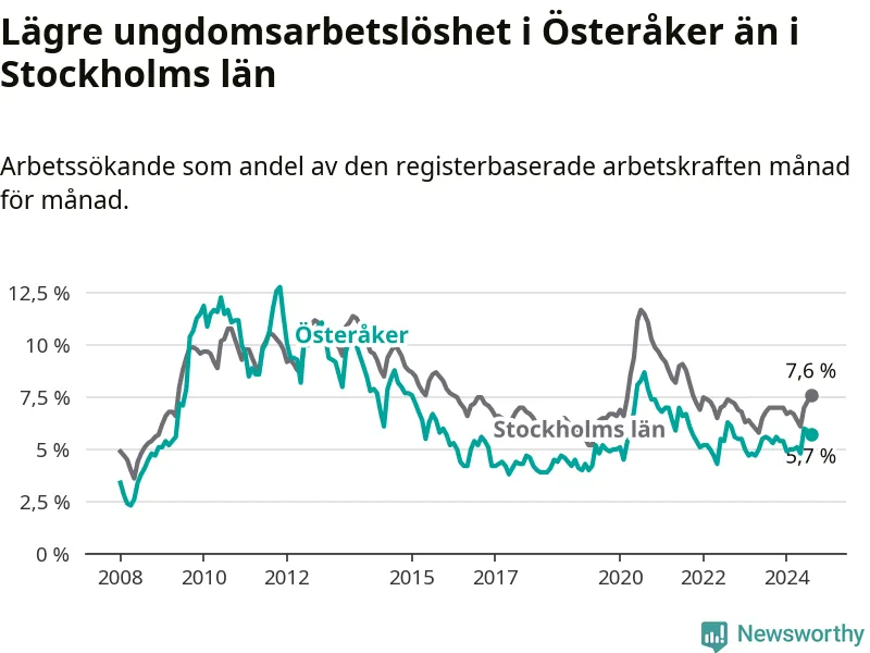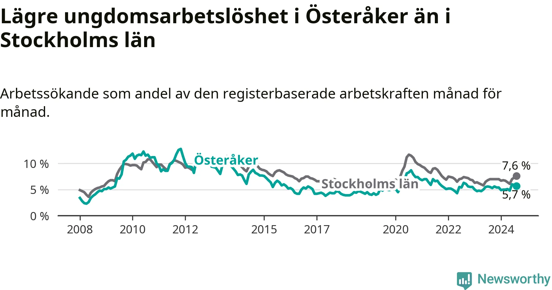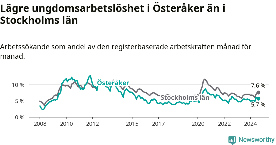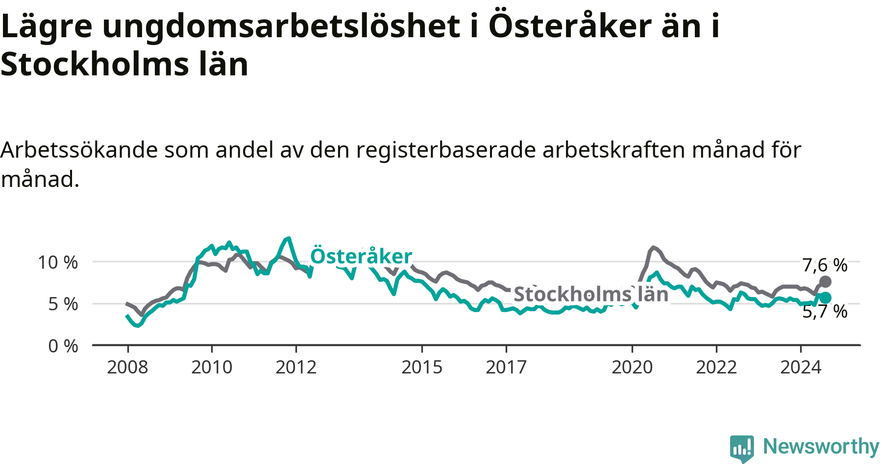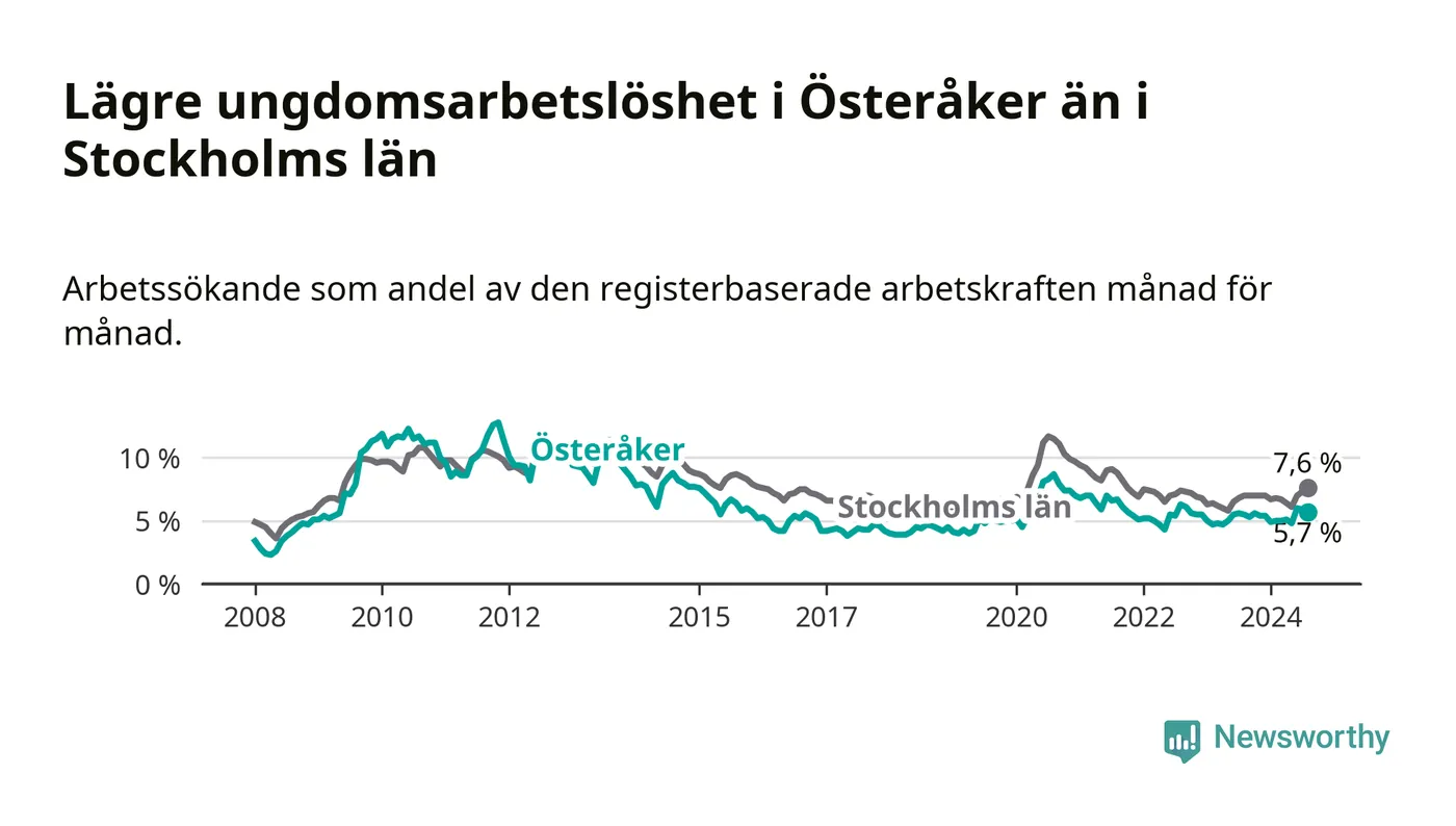 Precis som den totala arbetslösheten ligger ungdomsarbetslösheten i Österåker lägre än i Stockholms län som helhet. Skillnaden mellan kommunen och länet är 1,9 procentenheter.