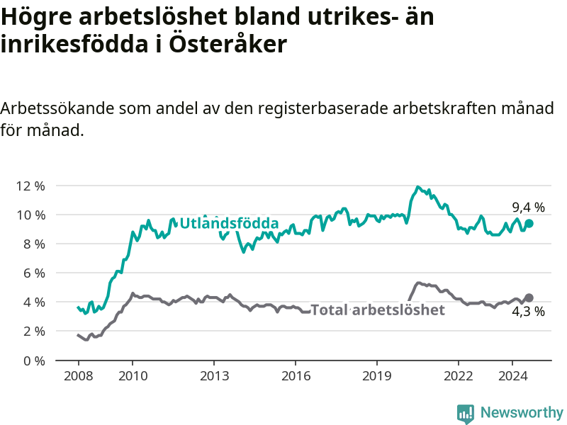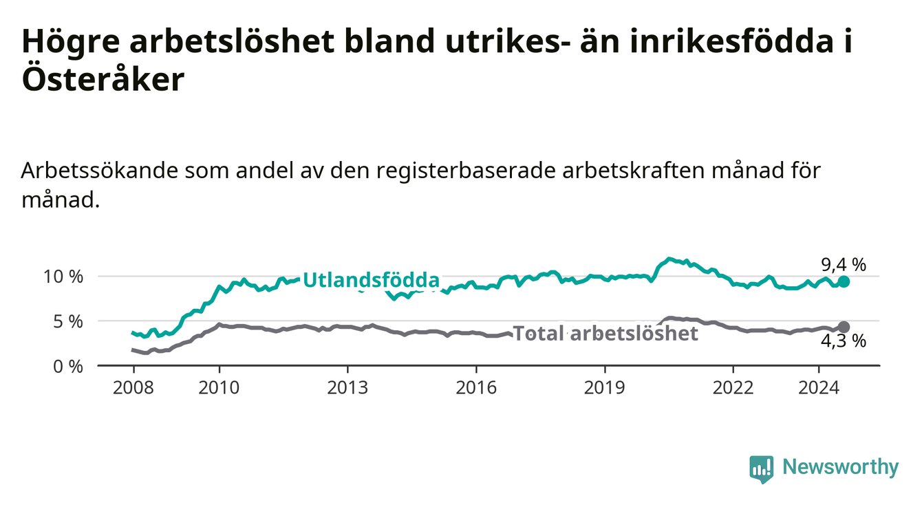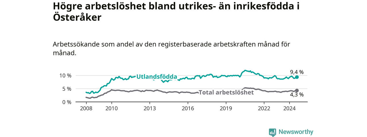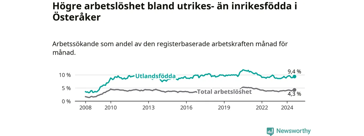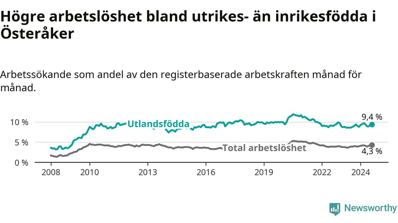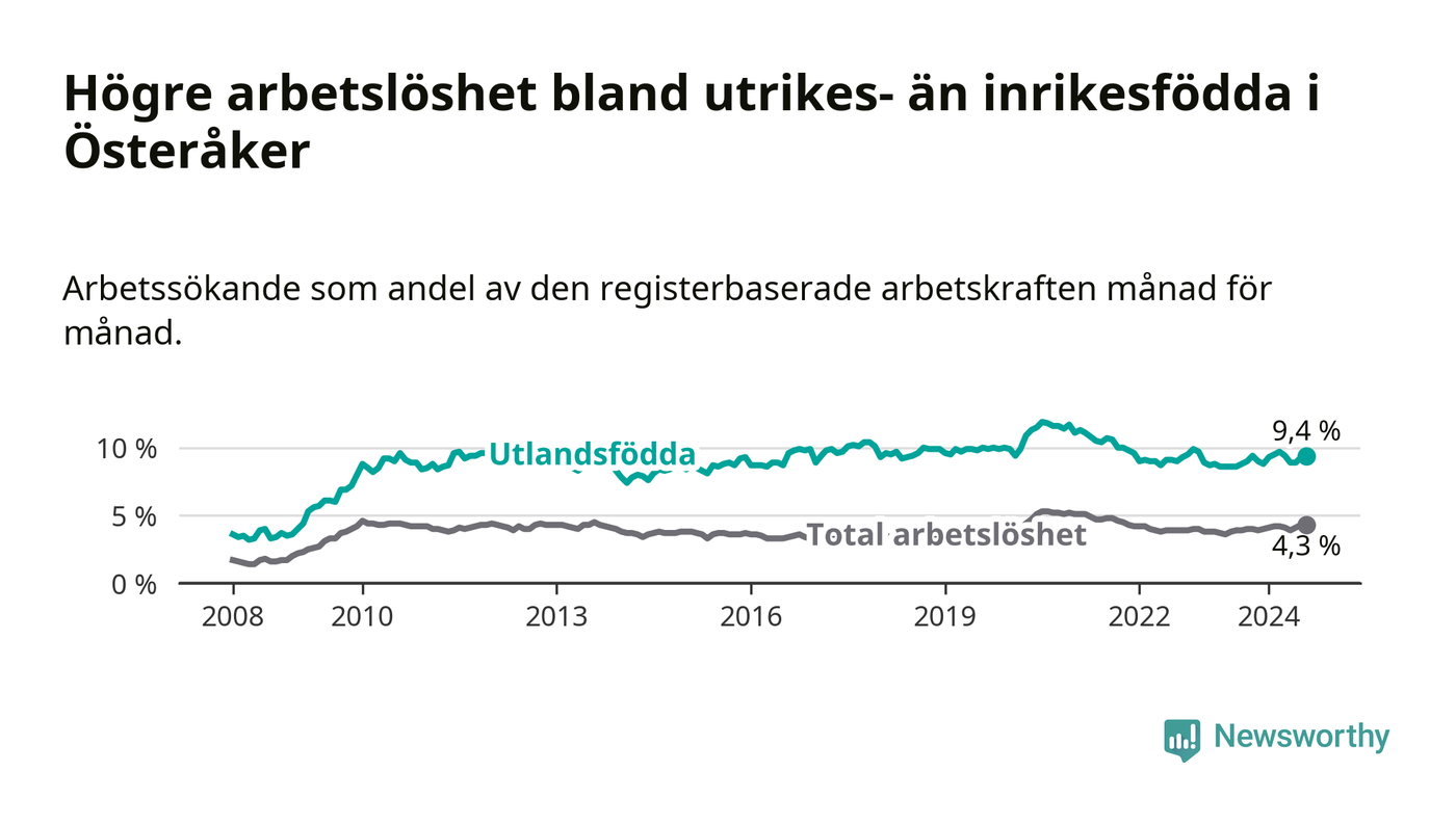 Arbetslösheten bland utlandsfödda var 9,4 procent i Österåker under augusti månad, motsvarande 498 av 5 298 personer. Det är 0,6 procentenheter fler än vid samma tidpunkt i fjol (+38 om man räknar personer). Därmed är de utlandsföddas arbetslöshet högre än vid samma tidpunkt i fjol för åttonde månaden i följd.
