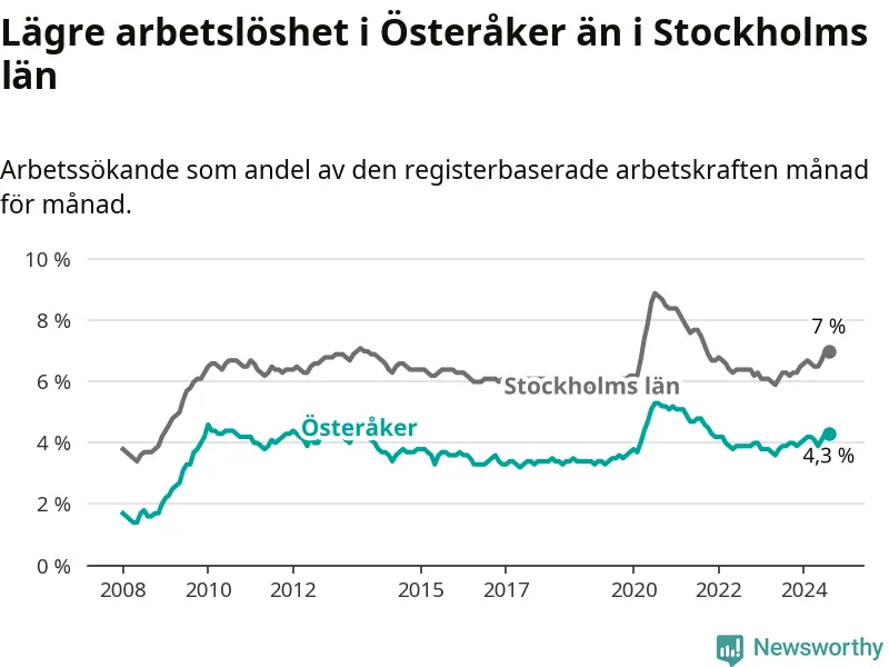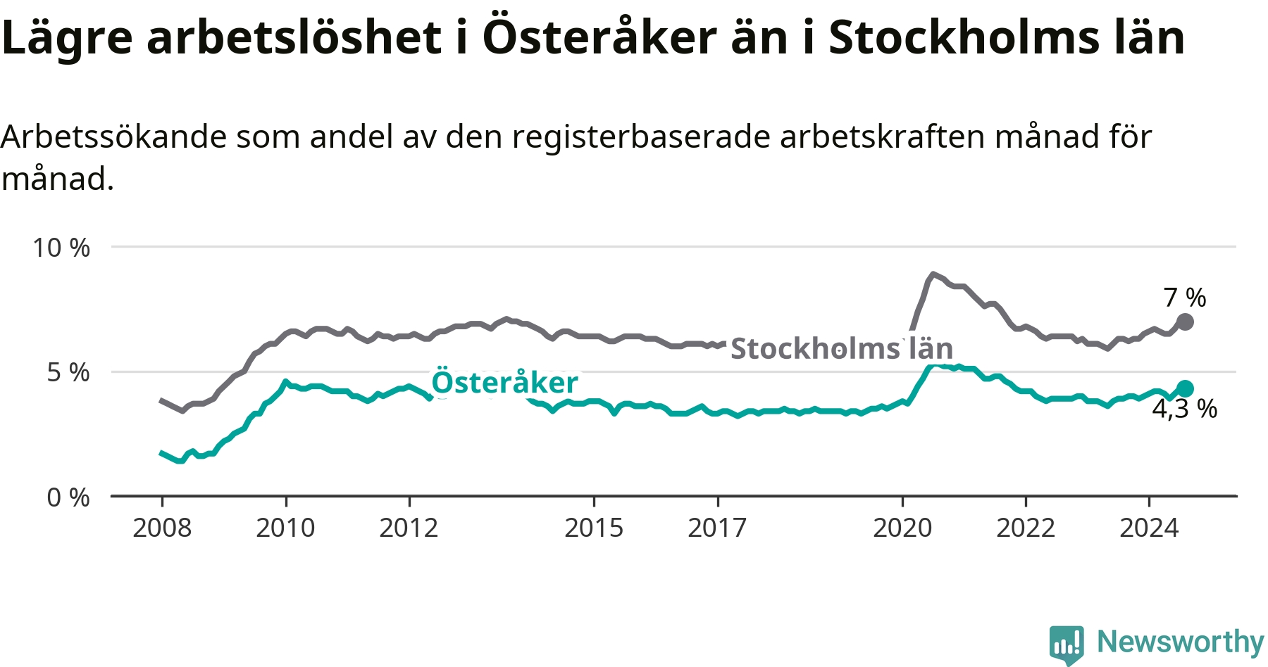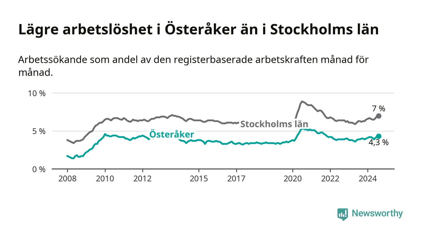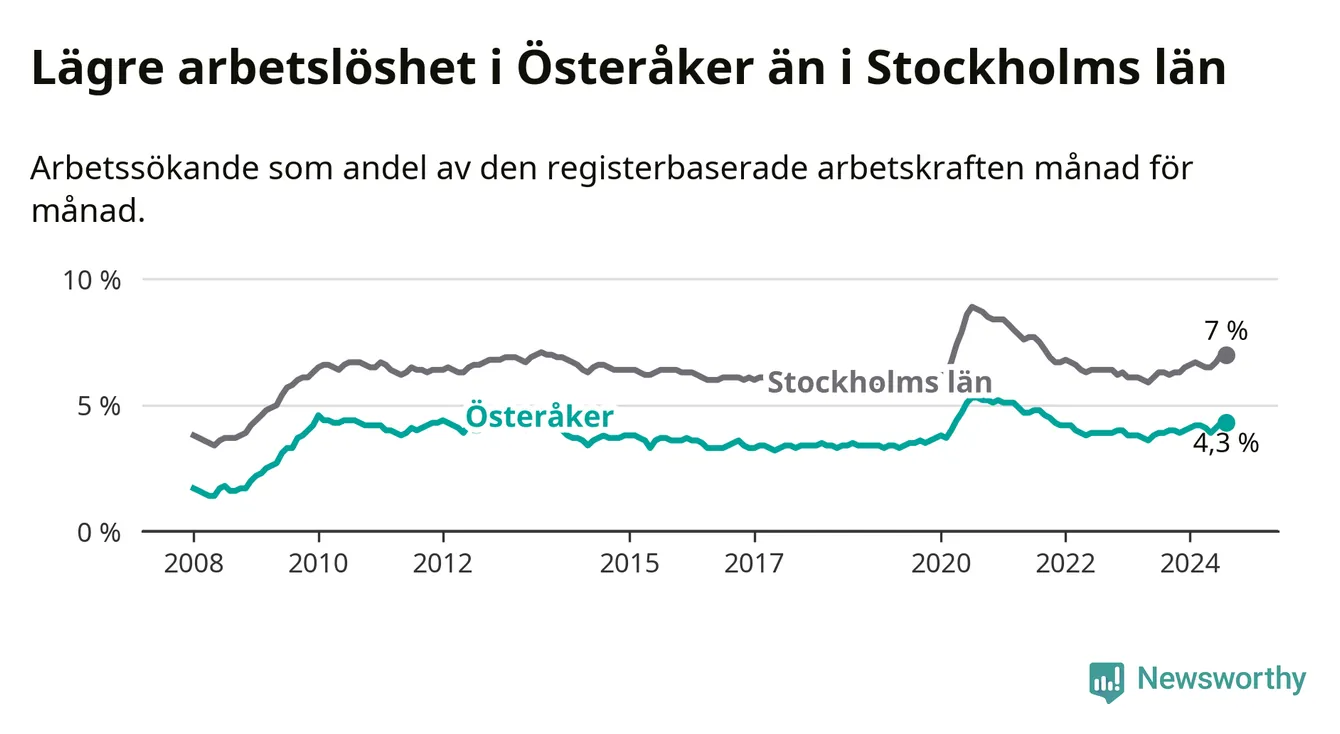 Även om arbetslösheten i Österåker alltså ökar, så ligger den fortfarande under snittet i hela Stockholms län (4,3 procent i kommunen, jämfört med 7,0 procent i hela länet). Ekerö har den lägsta arbetslösheten i länet (3,4 procent), medan Södertälje har den högsta (11,1 procent). För att Österåker skulle komma ner i samma arbetslöshetsnivå som Ekerö skulle 224 personer behöva sysselsättas.
