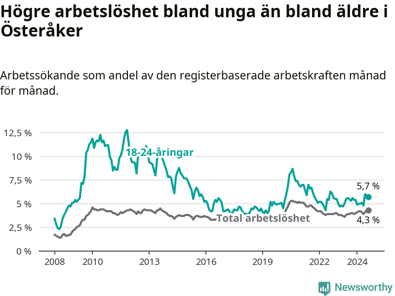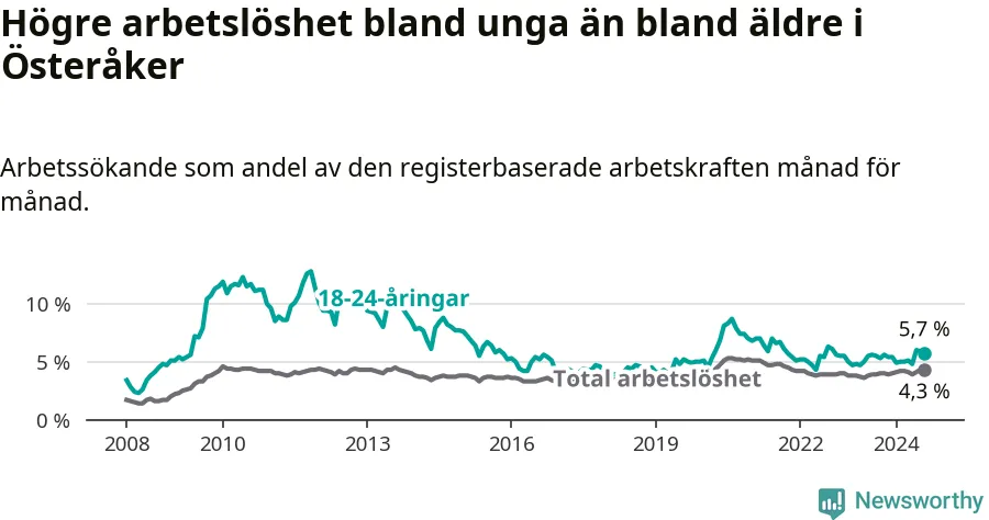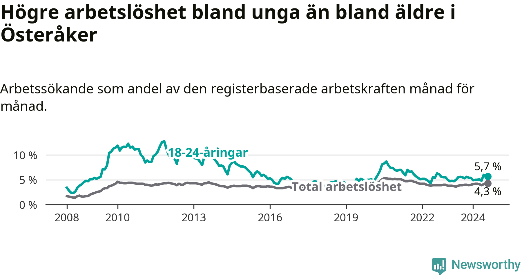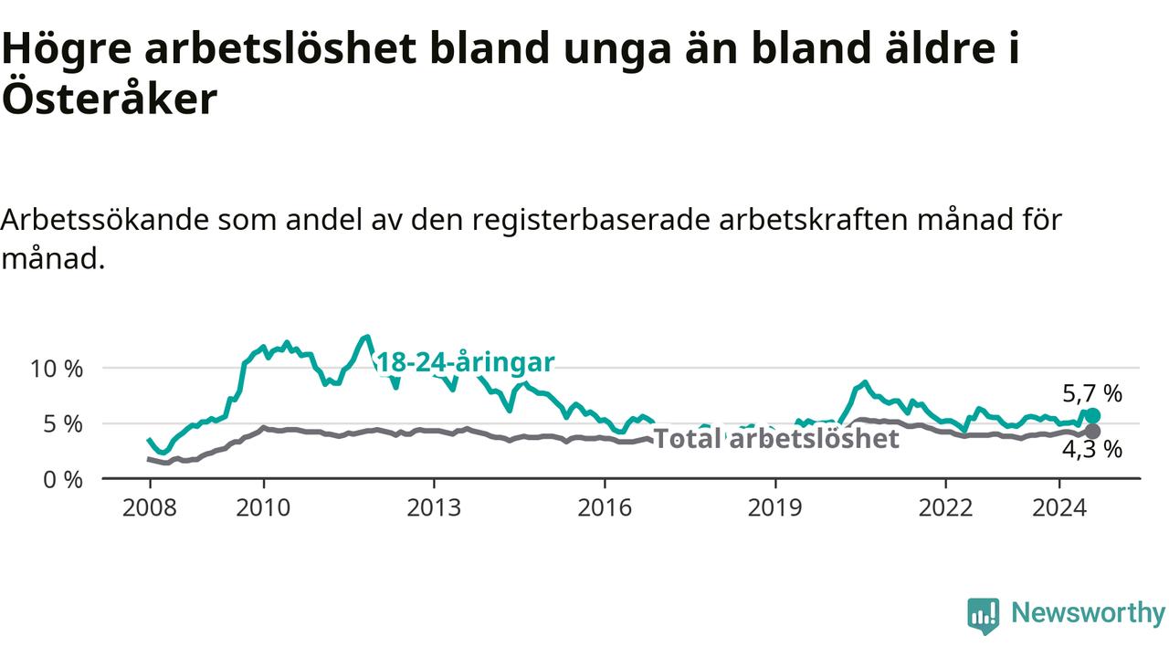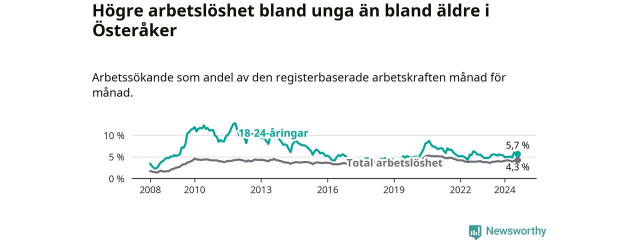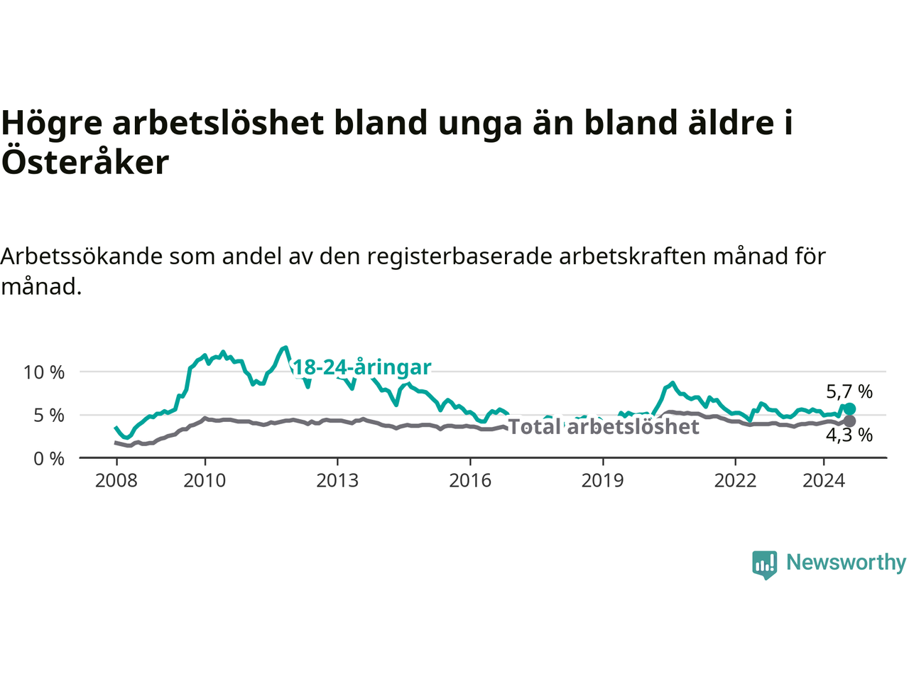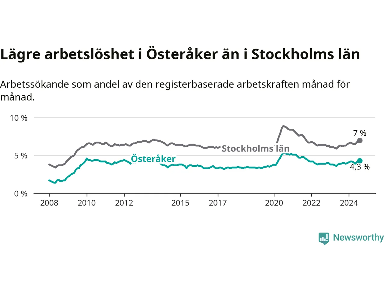Under augusti månad rapporterade Österåkers kommun en total arbetslöshet på 4,3 procent. Det är en ökning jämfört med samma tidpunkt i fjol (+0,4 procentenheter). Även i Stockholms län stiger arbetslösheten .
