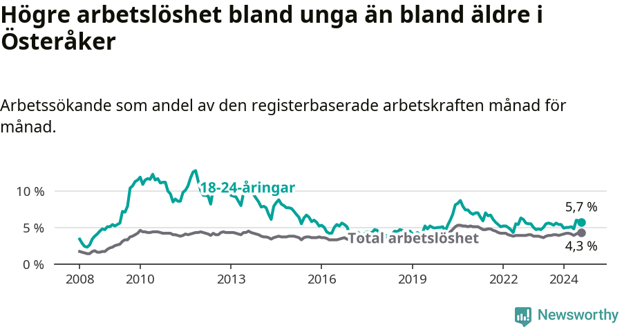 Precis som den totala arbetslösheten stiger arbetslösheten bland unga (+0,2 procentenheter). I augusti var 5,7 procent av 18–24-åringarna inskrivna som arbetssökande (motsvarande 133 personer). Mäter vi antalet inskrivna ser vi en ökning med tio personer på ett års sikt.