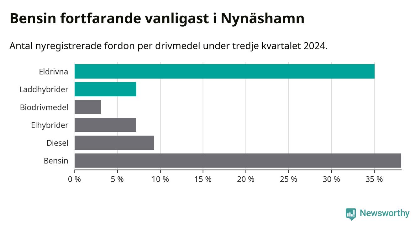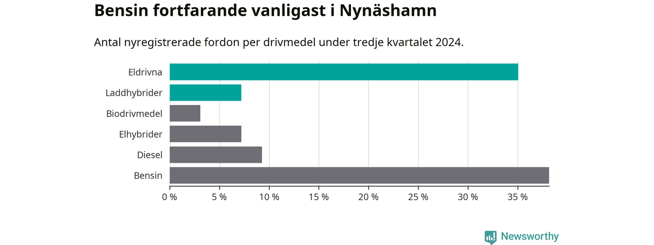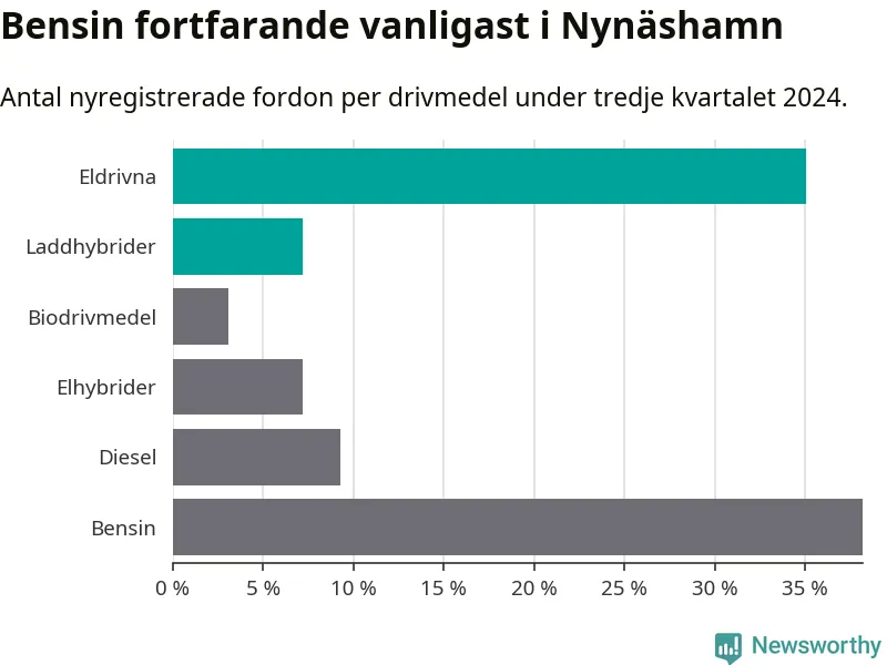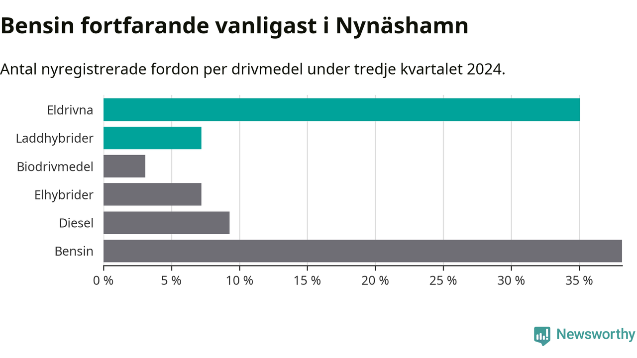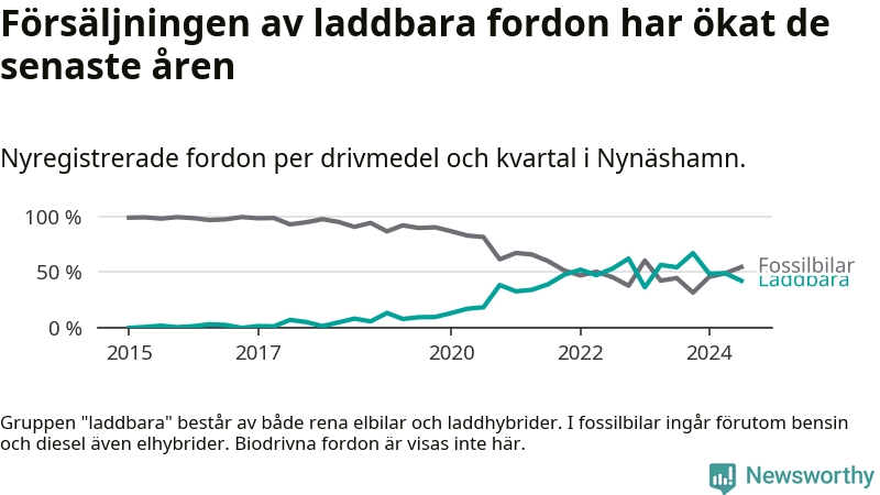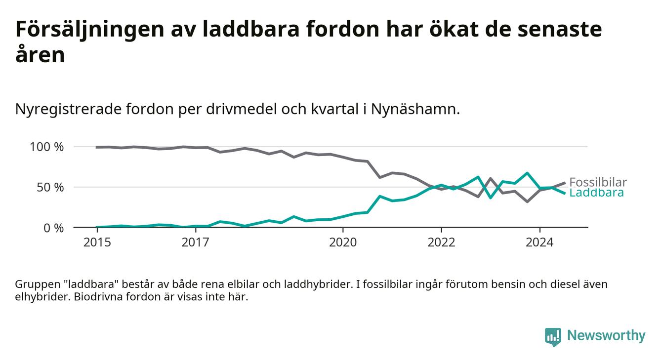 Under tredje kvartalet 2024 var 42 procent av alla nyregistrerade personbilar i Nynäshamn laddbara (sammanlagt registrerades 97 nya bilar). Merparten av de laddbara bilarna var rena elbilar (35 procent av alla).