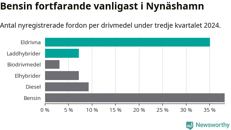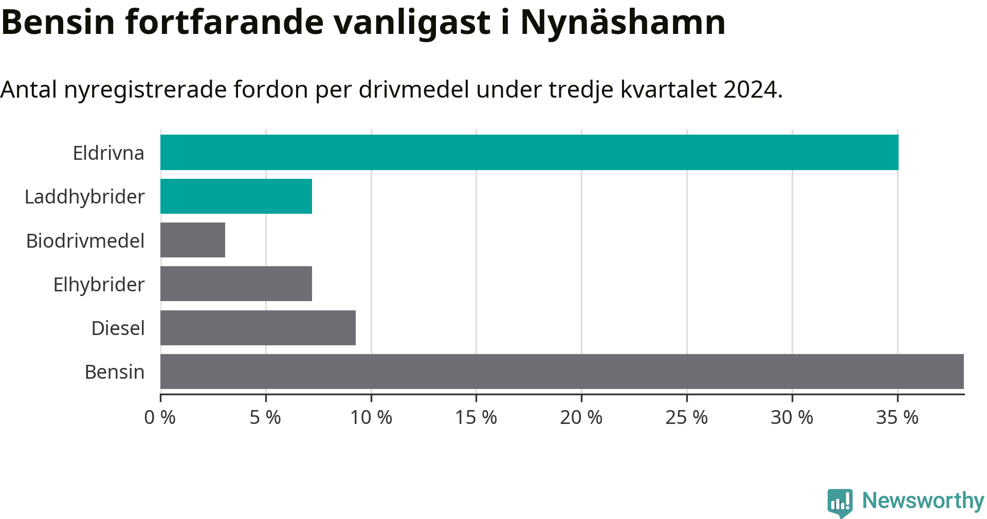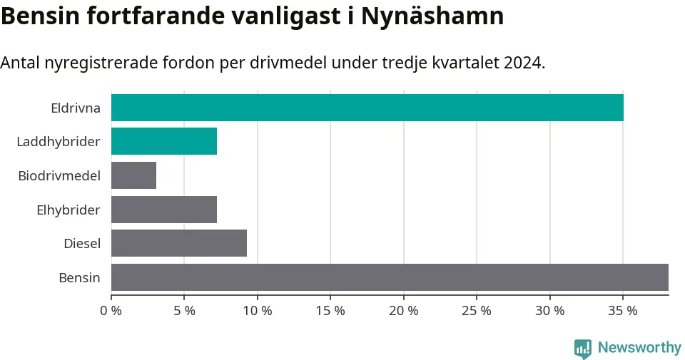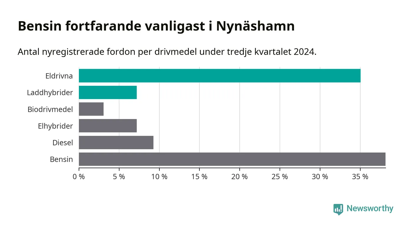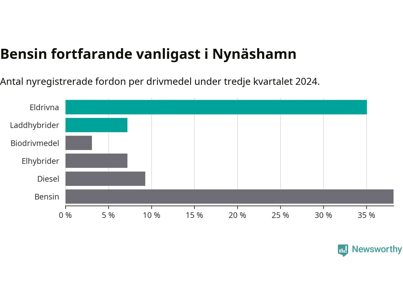 Under tredje kvartalet 2024 var 42 procent av alla nyregistrerade personbilar i Nynäshamn laddbara (sammanlagt registrerades 97 nya bilar). Merparten av de laddbara bilarna var rena elbilar (35 procent av alla).