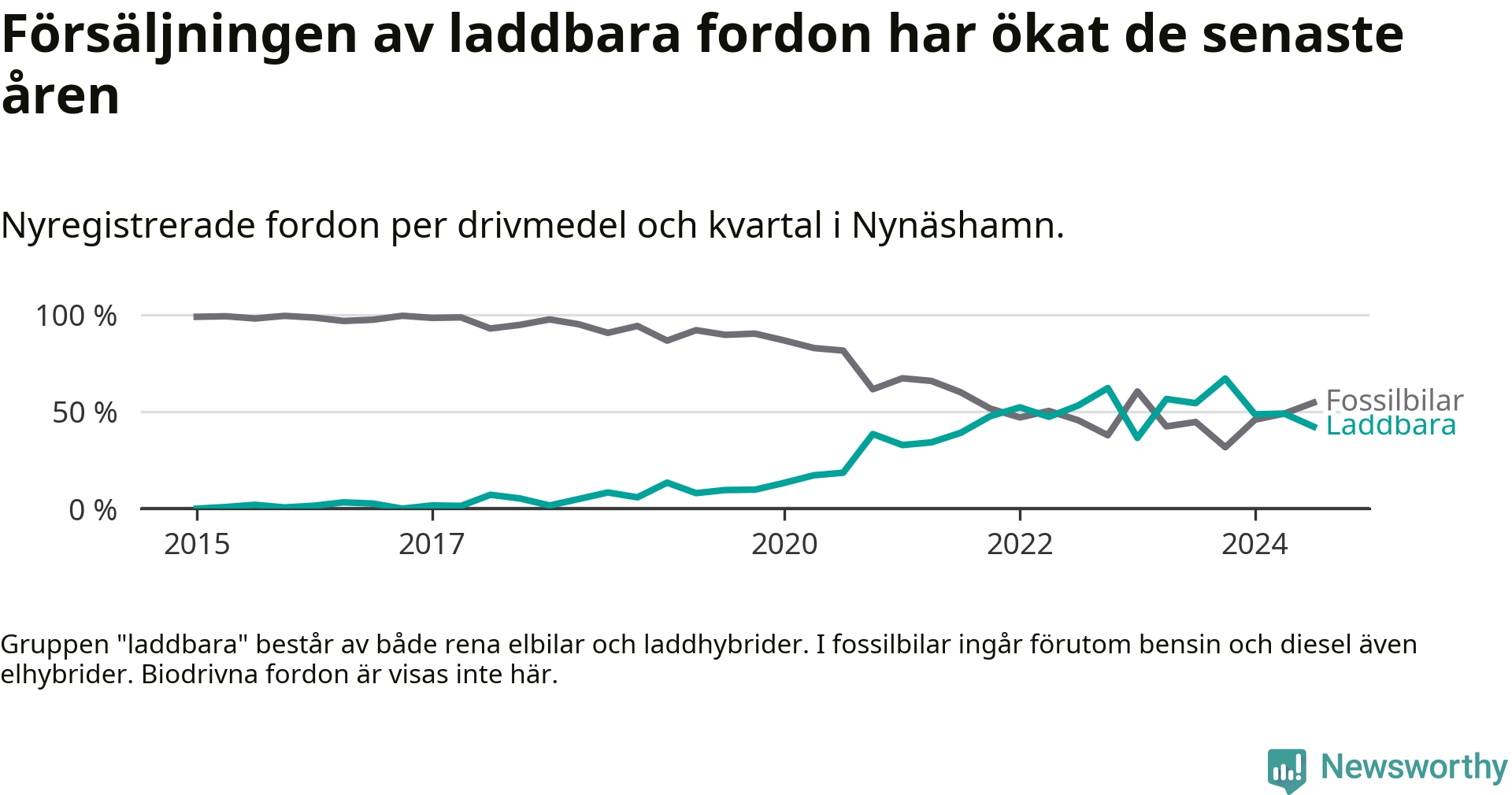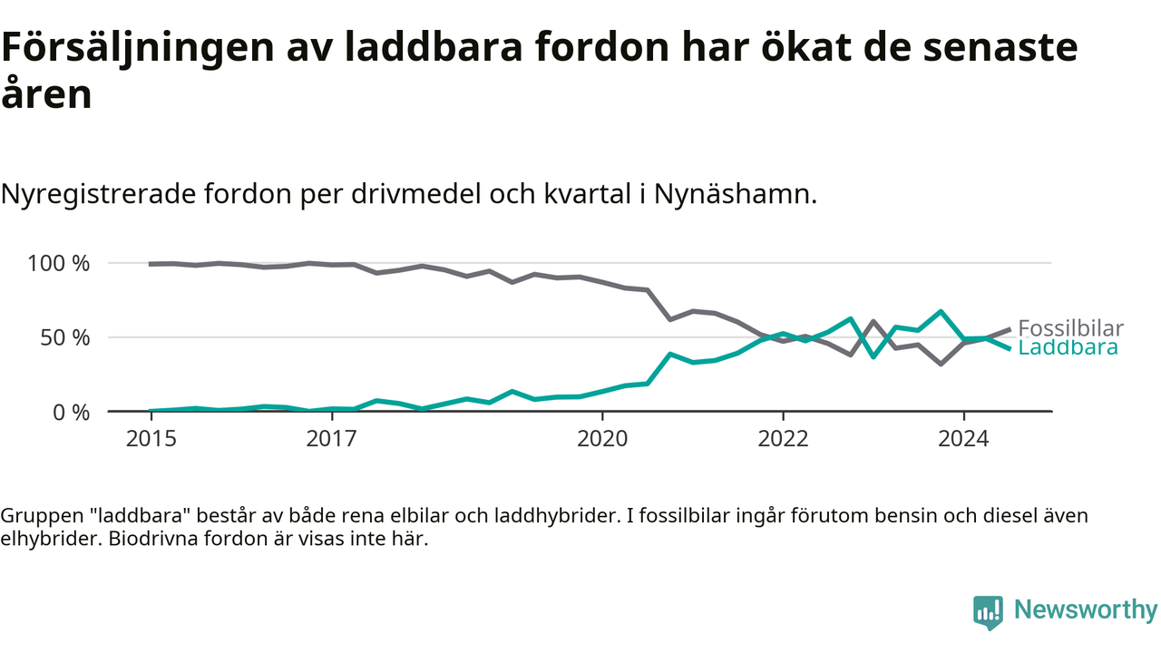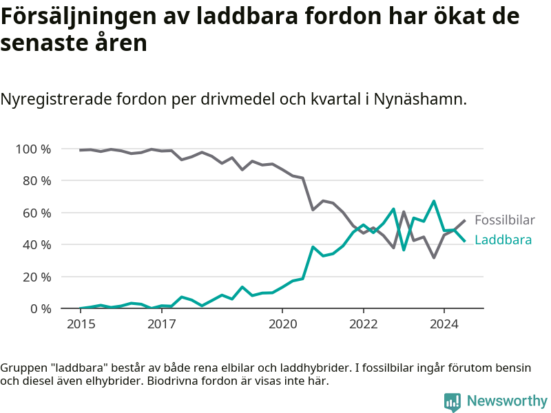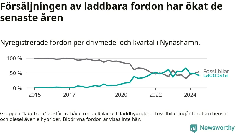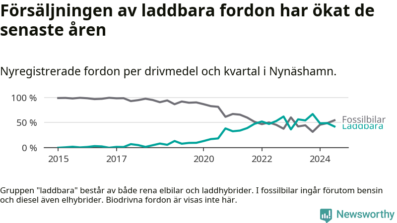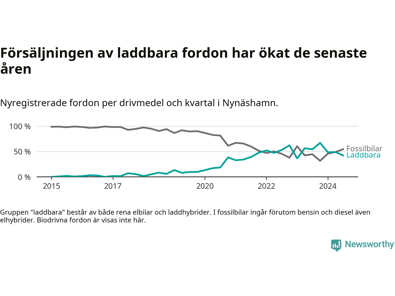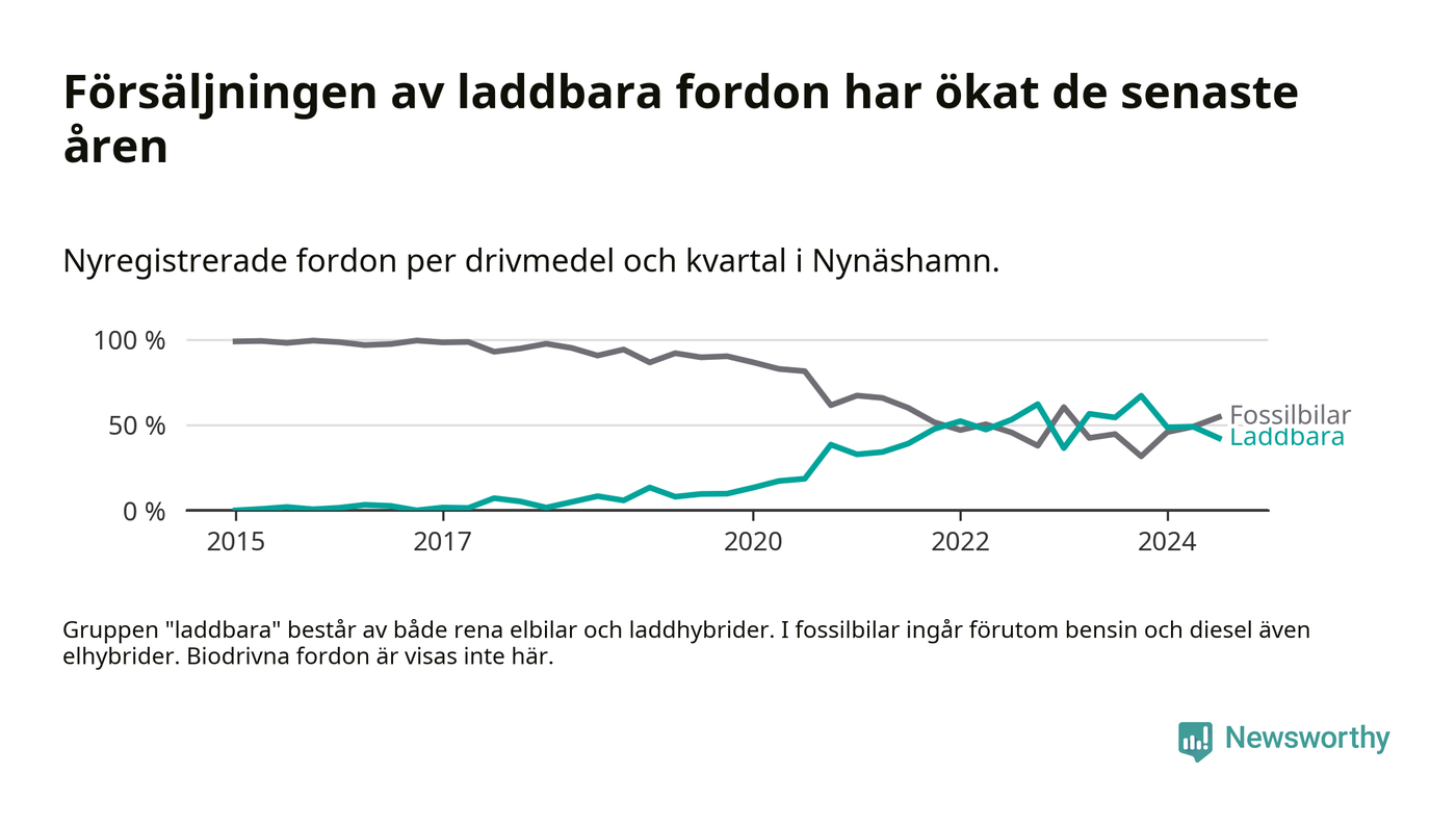 De senaste åren har vi sett en kraftig ökning i försäljning av laddbilar i Sverige. Under slutet av 2023 och början av 2024 har utvecklingen stannat av. I Nynäshamn peakade andelen laddbara under fjärde kvartalet 2023 (67 procent).