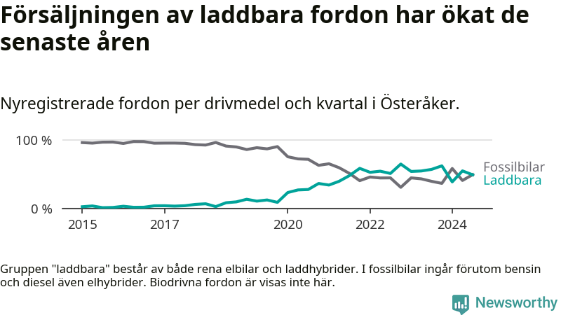 De senaste åren har vi sett en kraftig ökning i försäljning av laddbilar i Sverige. Under slutet av 2023 och början av 2024 har utvecklingen stannat av. I Österåker peakade andelen laddbara under fjärde kvartalet 2022 (65 procent).
