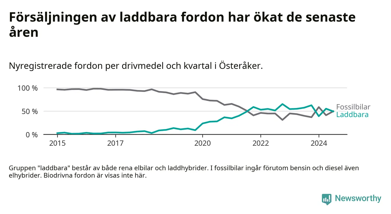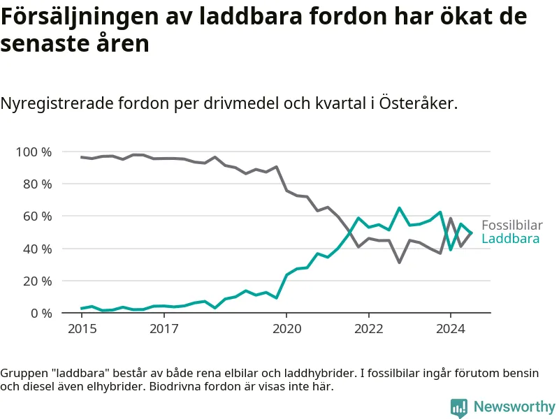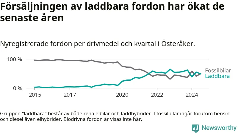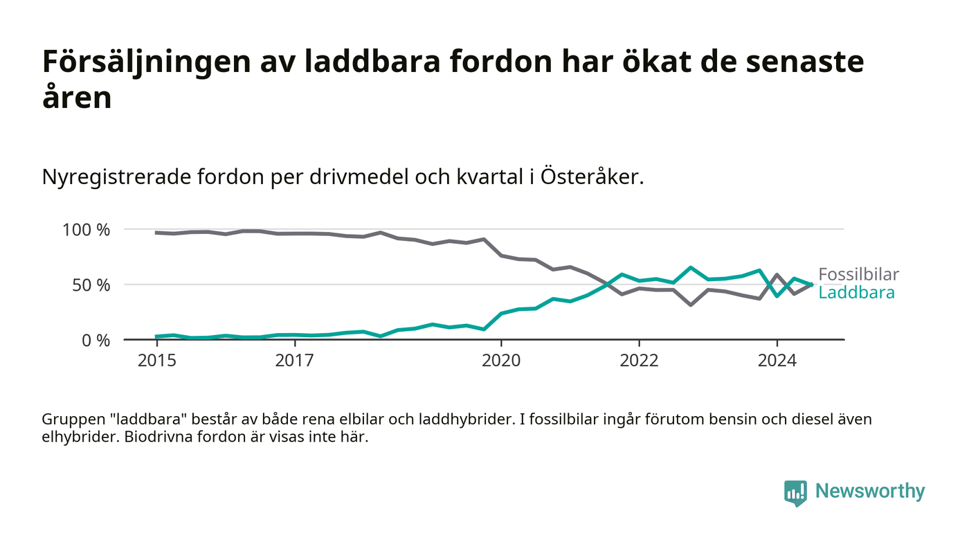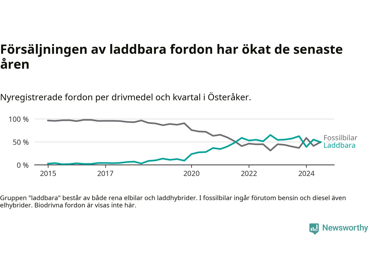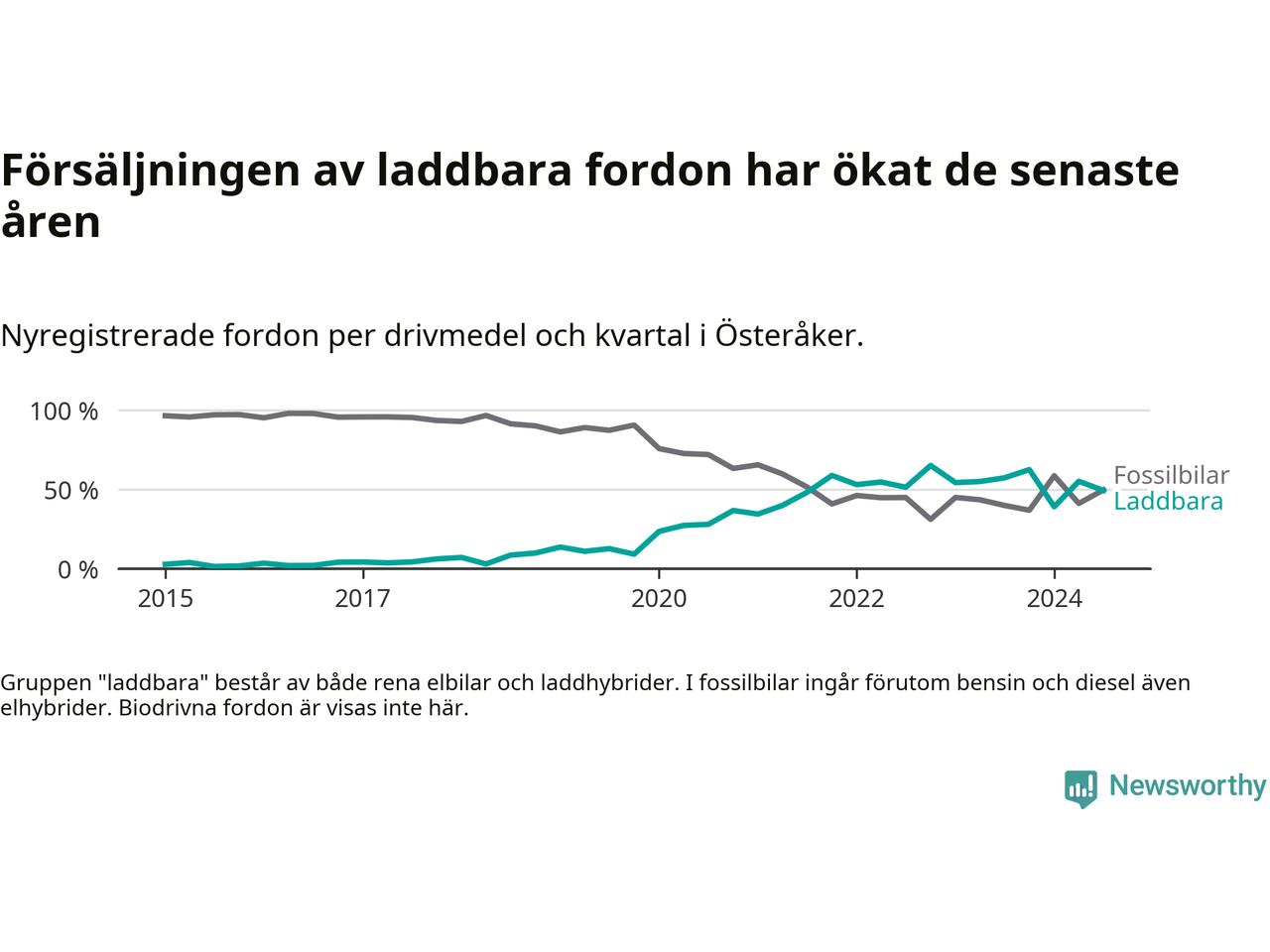 Under tredje kvartalet 2024 var 49 procent av alla nyregistrerade personbilar i Österåker laddbara (sammanlagt registrerades 330 nya bilar). Merparten av de laddbara bilarna var rena elbilar (29 procent av alla).
