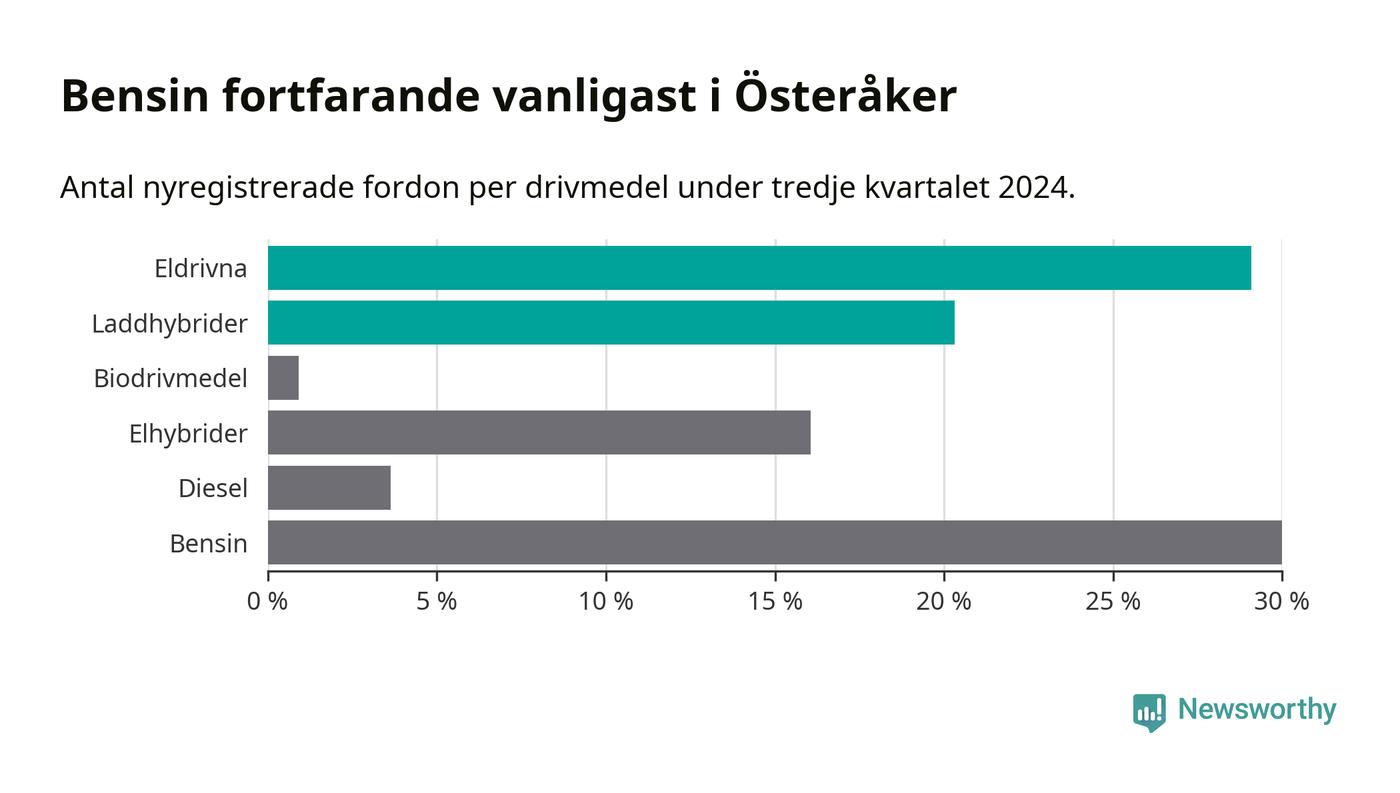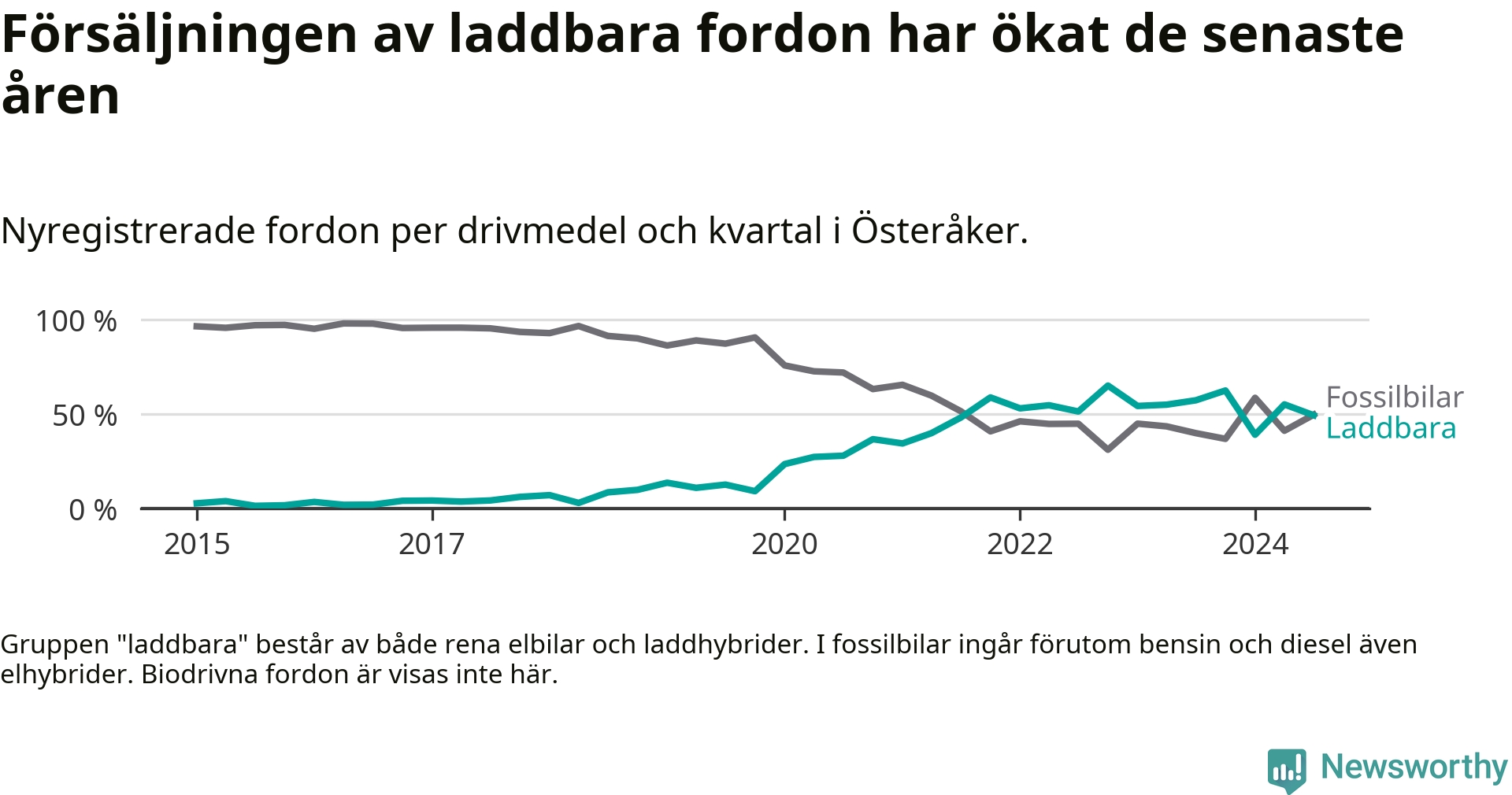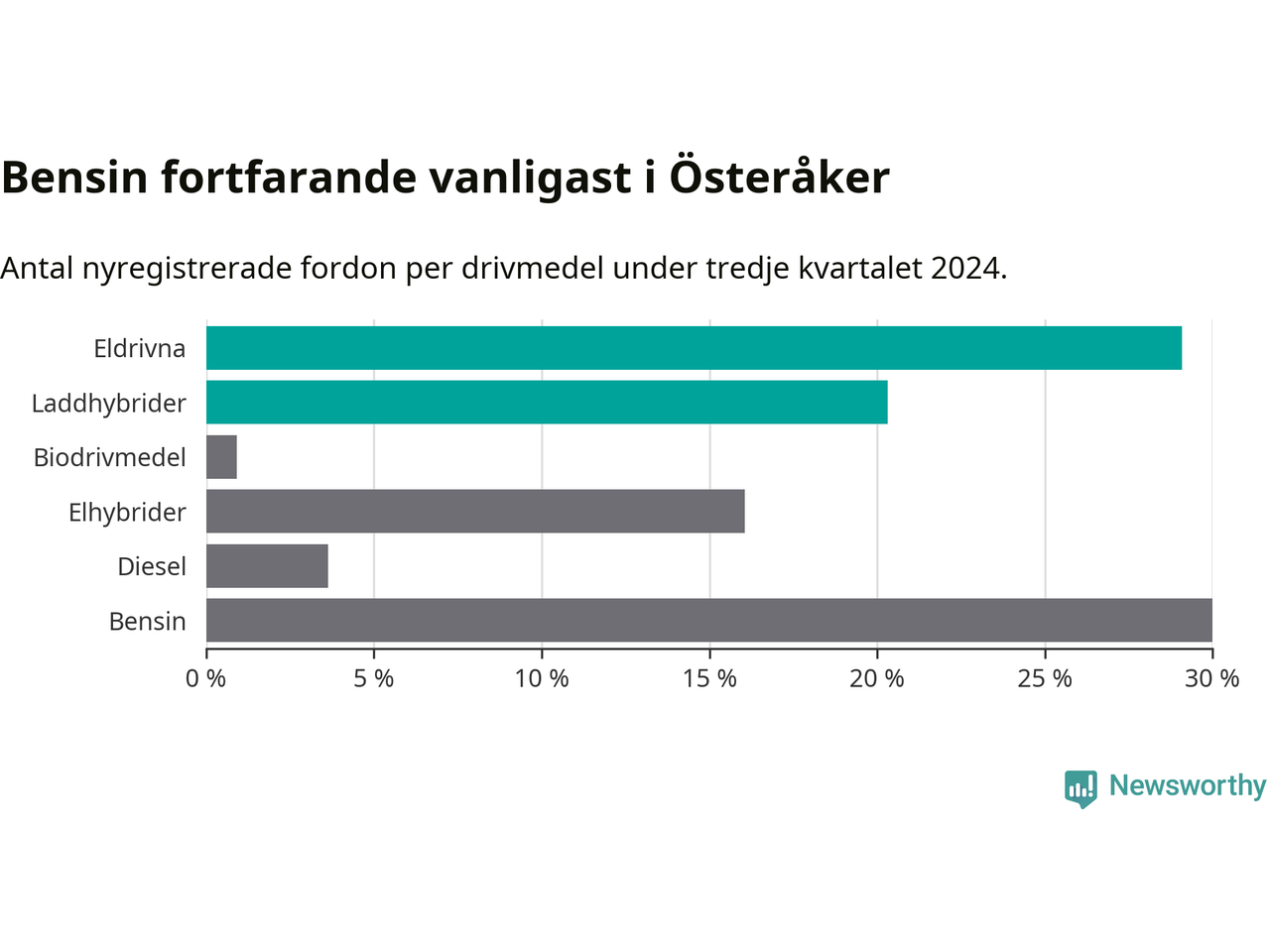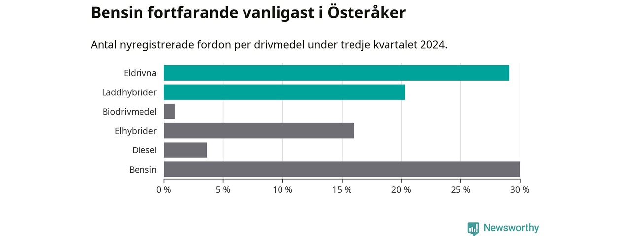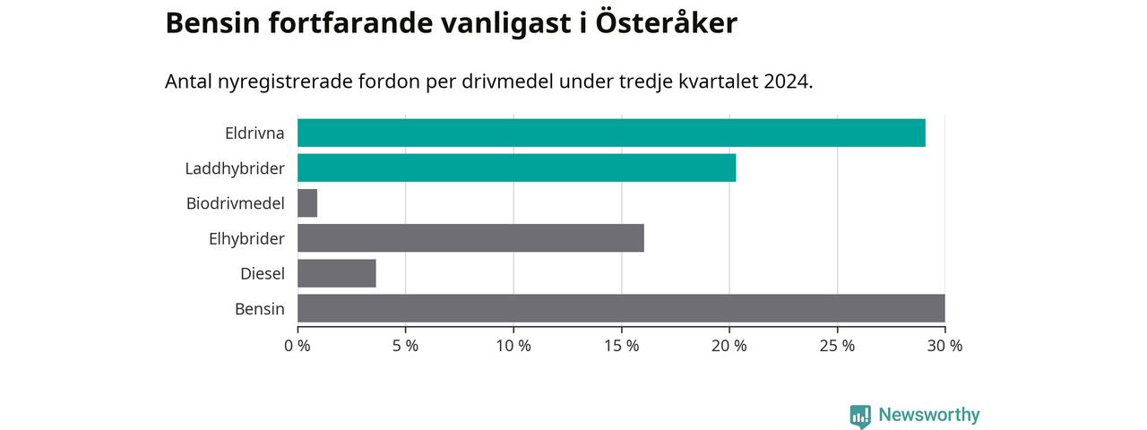 Under tredje kvartalet 2024 var 49 procent av alla nyregistrerade personbilar i Österåker laddbara (sammanlagt registrerades 330 nya bilar). Merparten av de laddbara bilarna var rena elbilar (29 procent av alla).