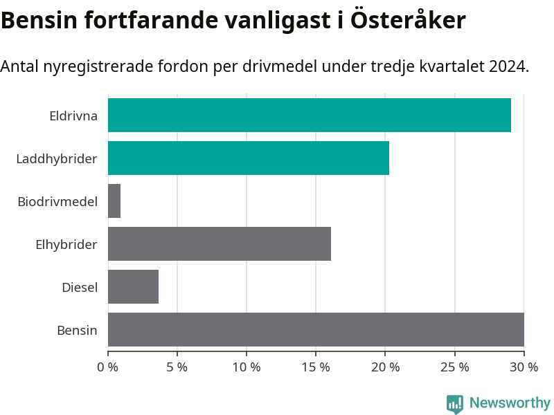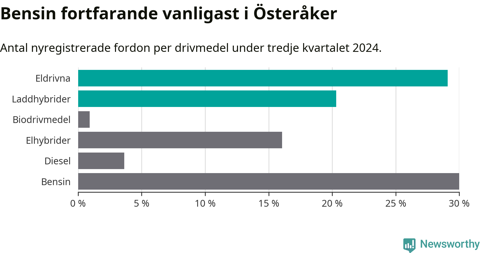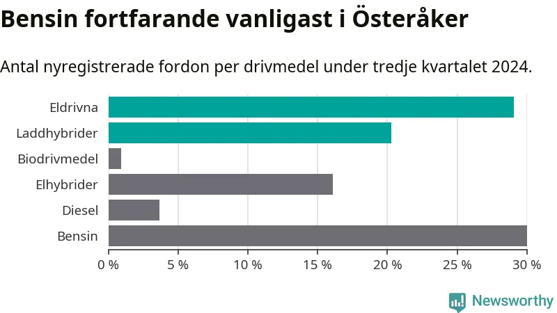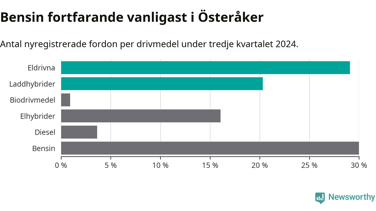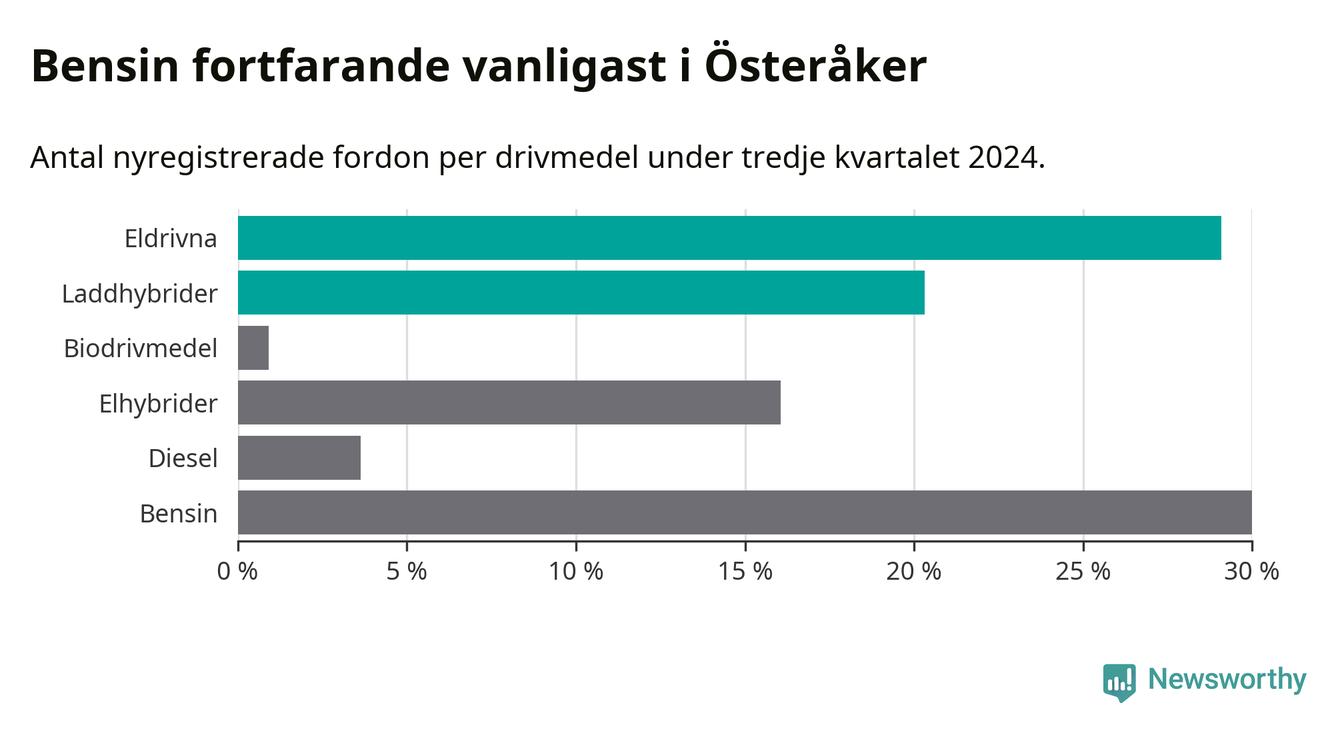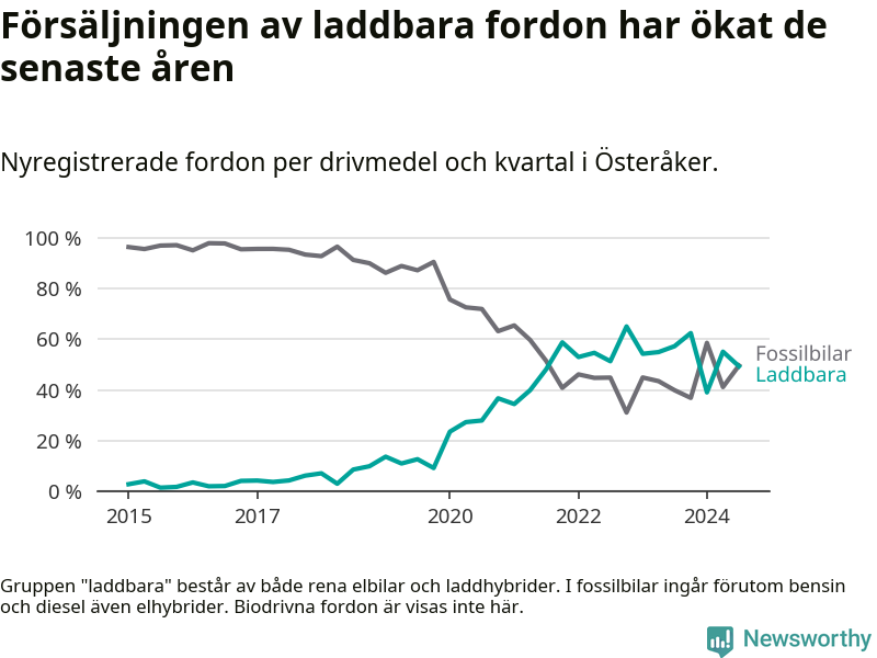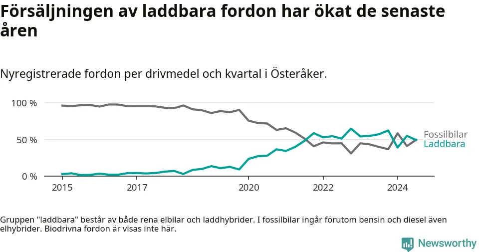 Under tredje kvartalet 2024 var 49 procent av alla nyregistrerade personbilar i Österåker laddbara (sammanlagt registrerades 330 nya bilar). Merparten av de laddbara bilarna var rena elbilar (29 procent av alla).