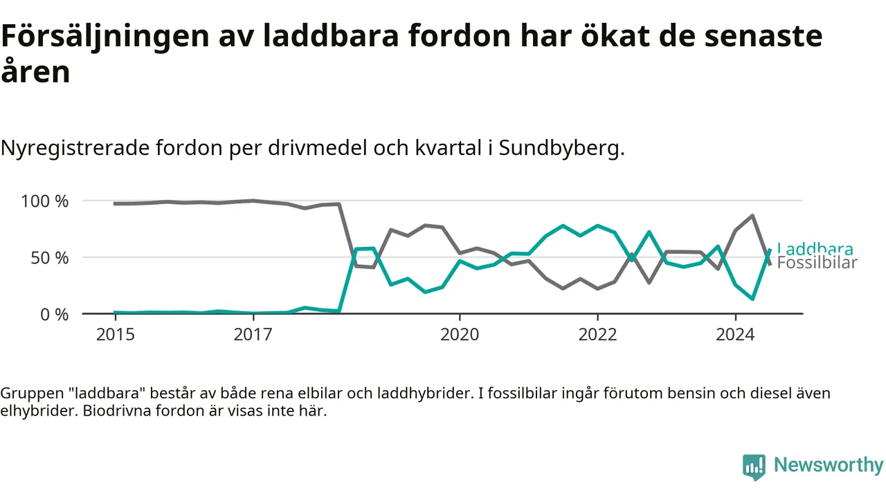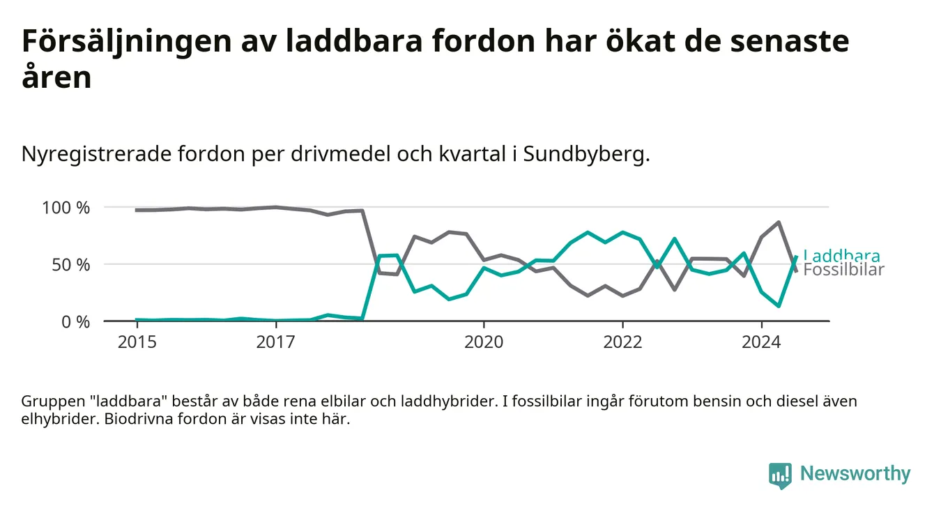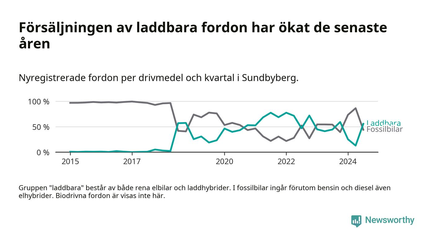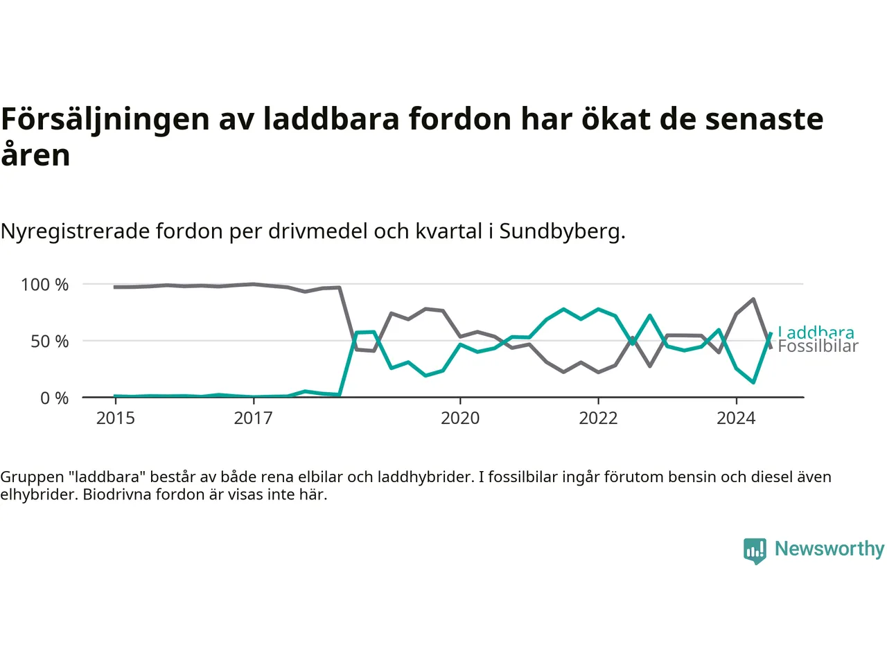 Under tredje kvartalet 2024 var 56 procent av alla nyregistrerade personbilar i Sundbyberg laddbara (sammanlagt registrerades 412 nya bilar). Merparten av de laddbara bilarna var så kallade laddhybrider, det vill säga fordon som går att ladda och köra på el, men som även har en förbränningsmotor. 13 procent av alla nya bilar var rena elbilar.