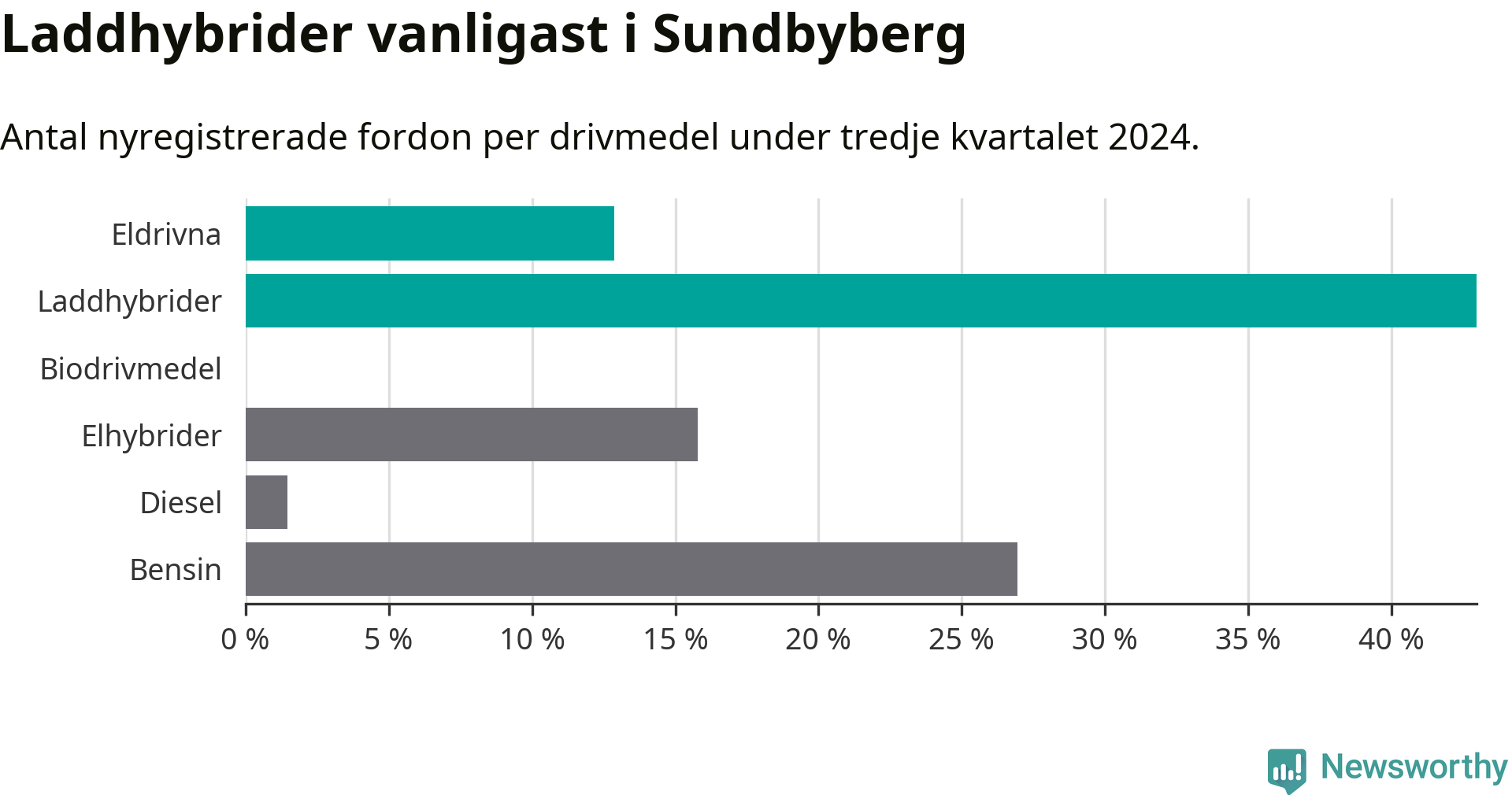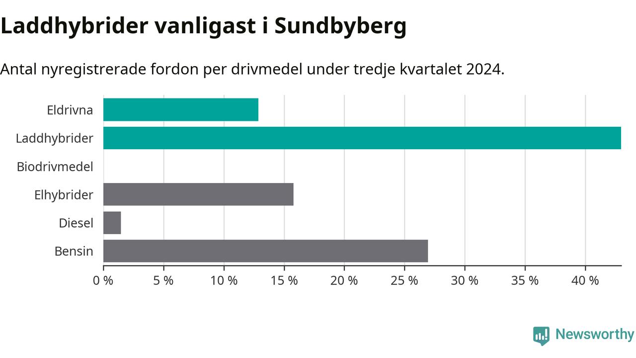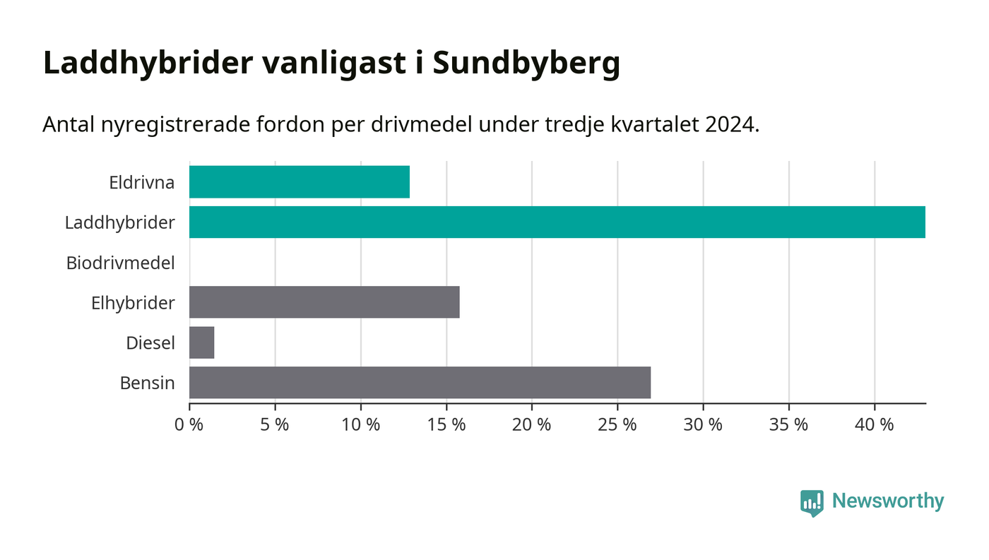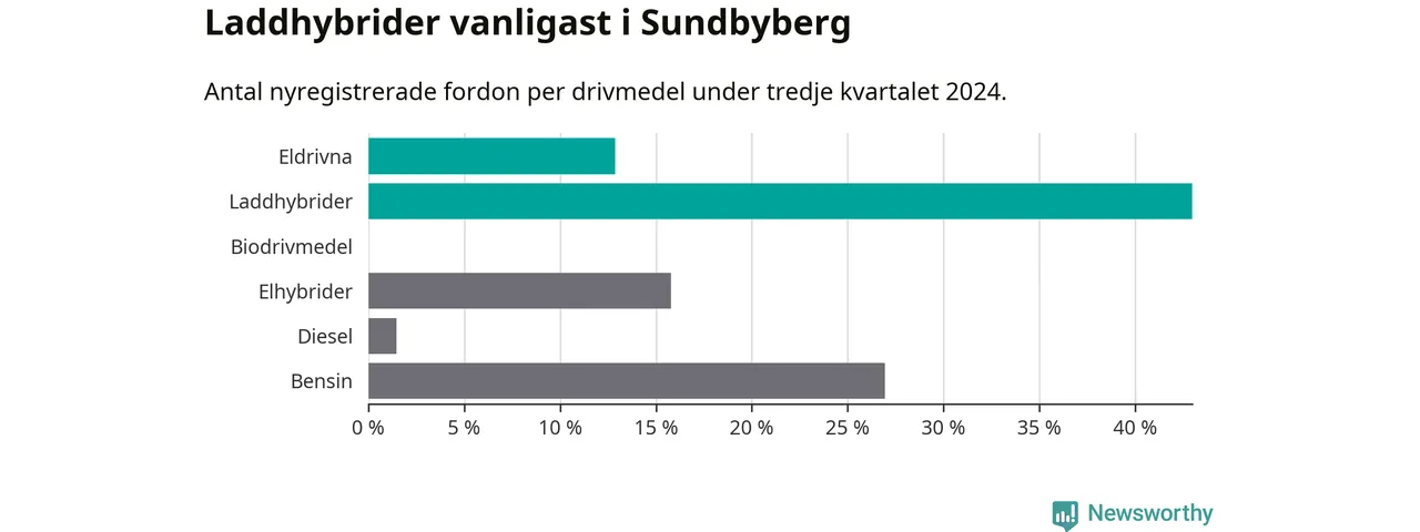 Under tredje kvartalet 2024 var 56 procent av alla nyregistrerade personbilar i Sundbyberg laddbara (sammanlagt registrerades 412 nya bilar). Merparten av de laddbara bilarna var så kallade laddhybrider, det vill säga fordon som går att ladda och köra på el, men som även har en förbränningsmotor. 13 procent av alla nya bilar var rena elbilar.