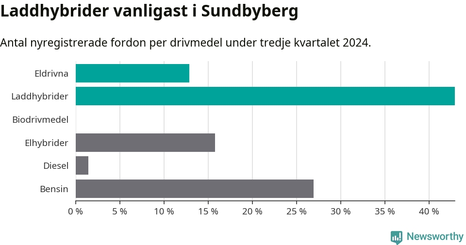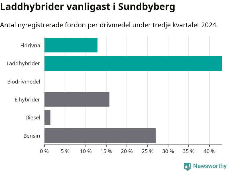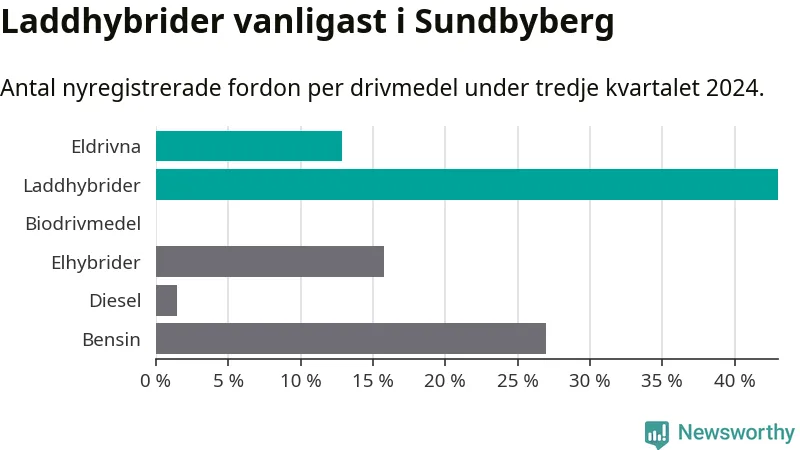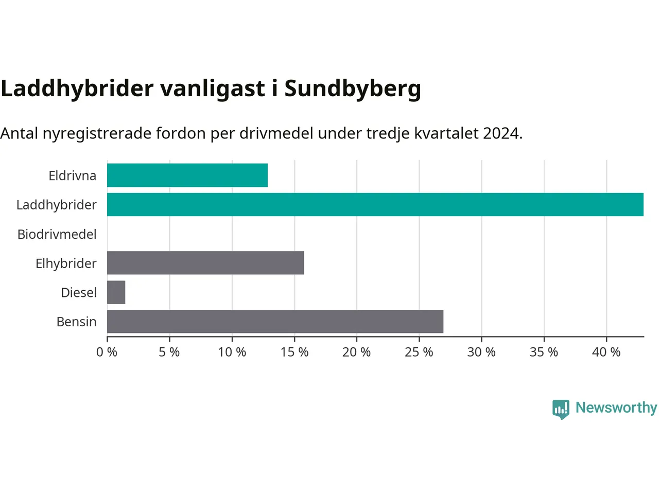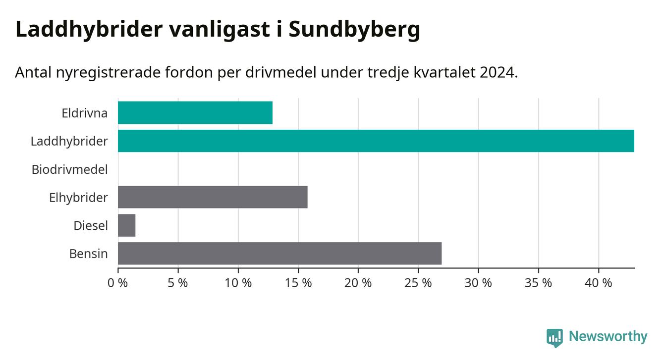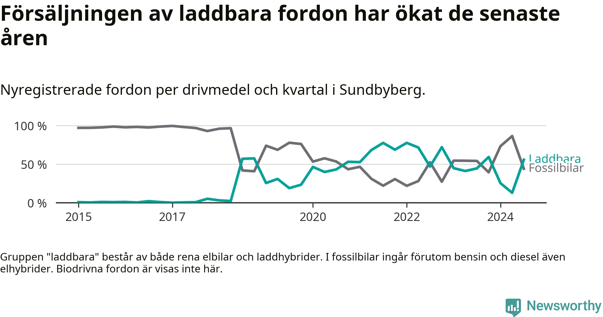 Under tredje kvartalet 2024 var 56 procent av alla nyregistrerade personbilar i Sundbyberg laddbara (sammanlagt registrerades 412 nya bilar). Merparten av de laddbara bilarna var så kallade laddhybrider, det vill säga fordon som går att ladda och köra på el, men som även har en förbränningsmotor. 13 procent av alla nya bilar var rena elbilar.