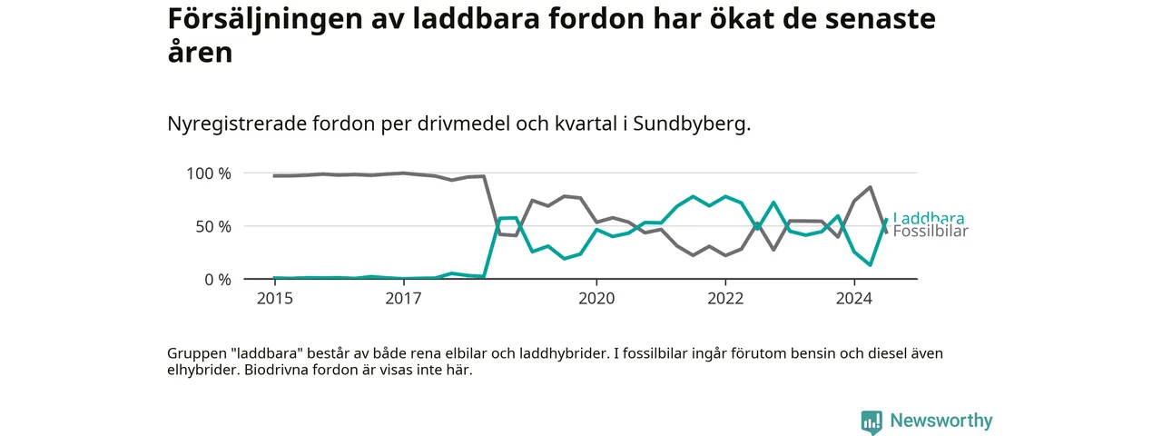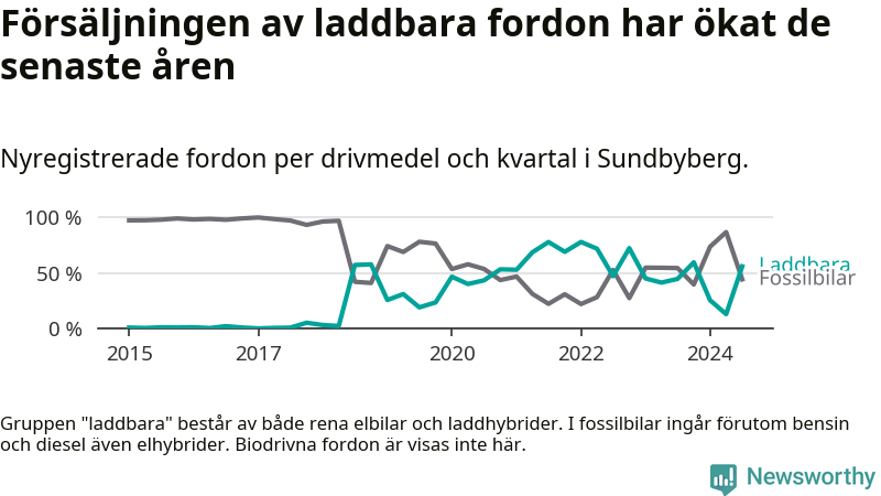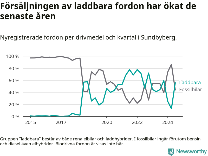 De senaste åren har vi sett en kraftig ökning i försäljning av laddbilar i Sverige. Under slutet av 2023 och början av 2024 har utvecklingen stannat av. I Sundbyberg peakade andelen laddbara under första kvartalet 2022 (78 procent).