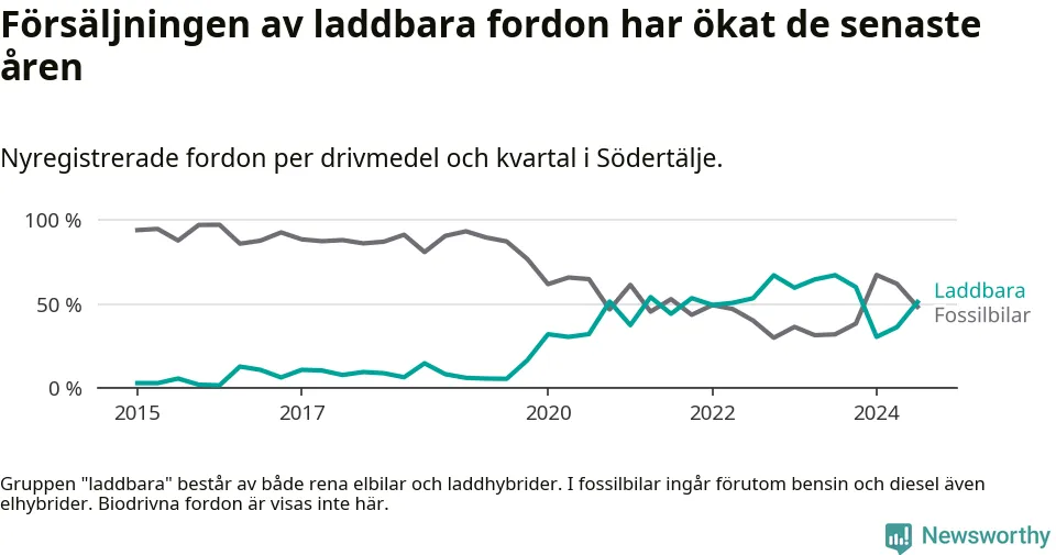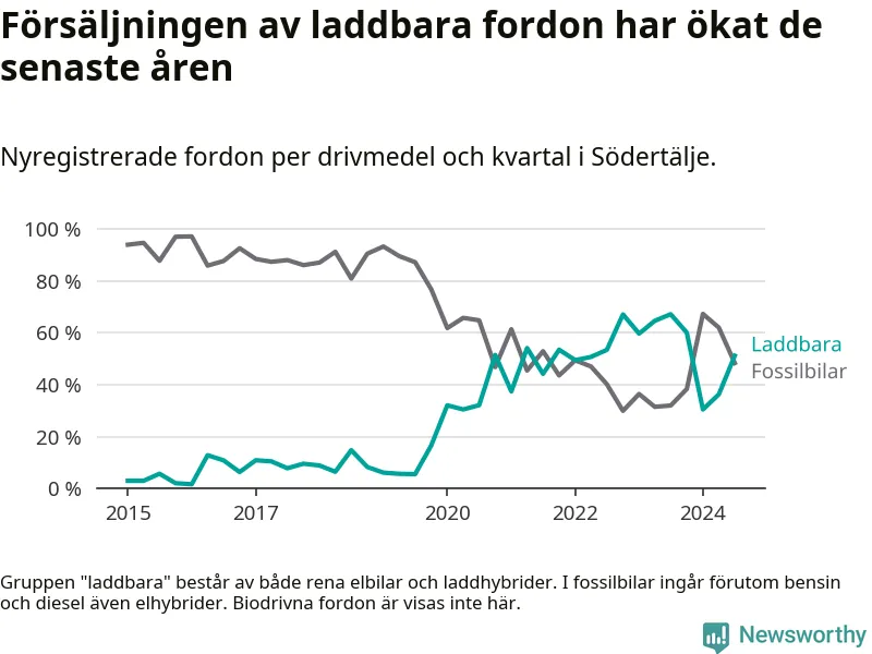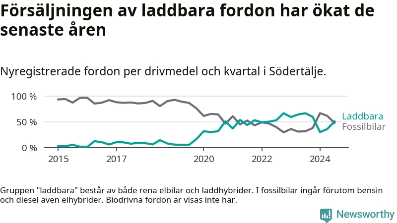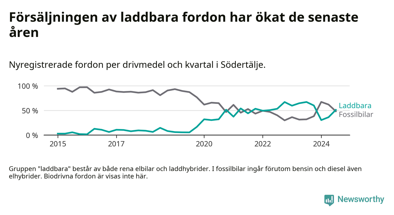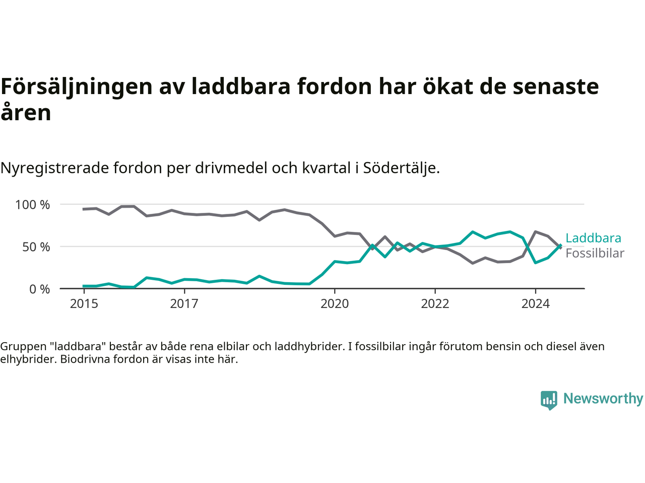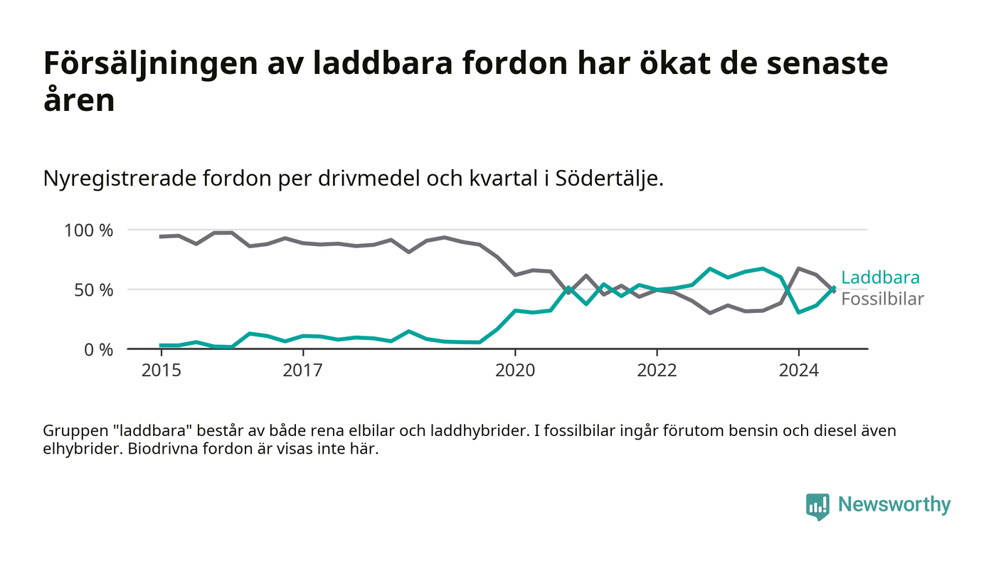 Under tredje kvartalet 2024 var 51 procent av alla nyregistrerade personbilar i Södertälje laddbara (sammanlagt registrerades 2 273 nya bilar). Merparten av de laddbara bilarna var rena elbilar (39 procent av alla).