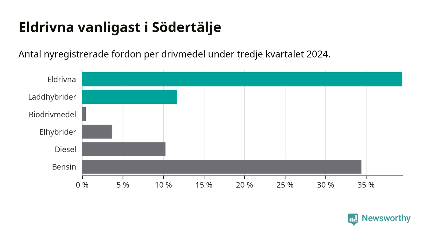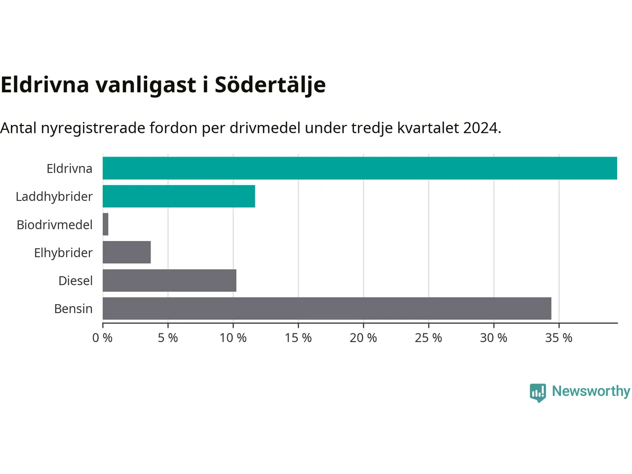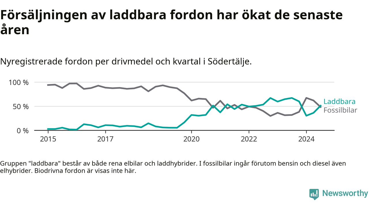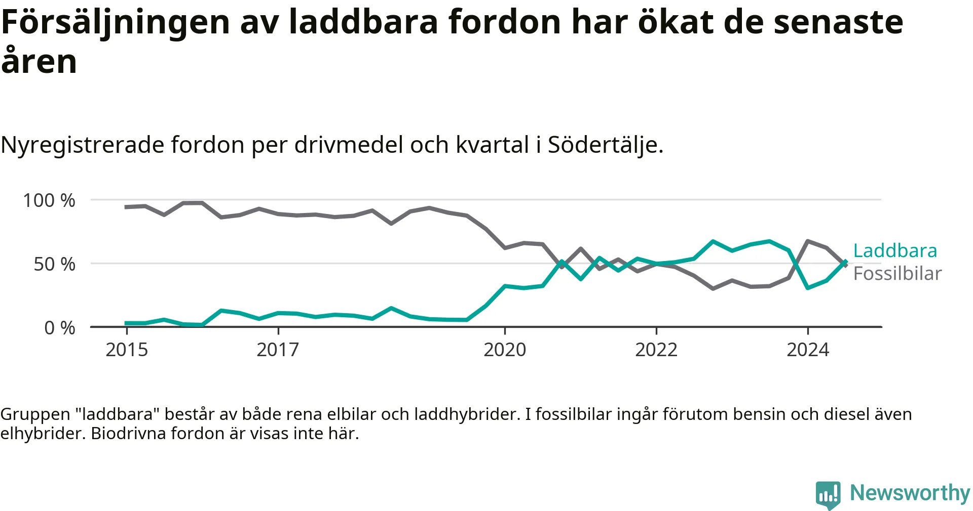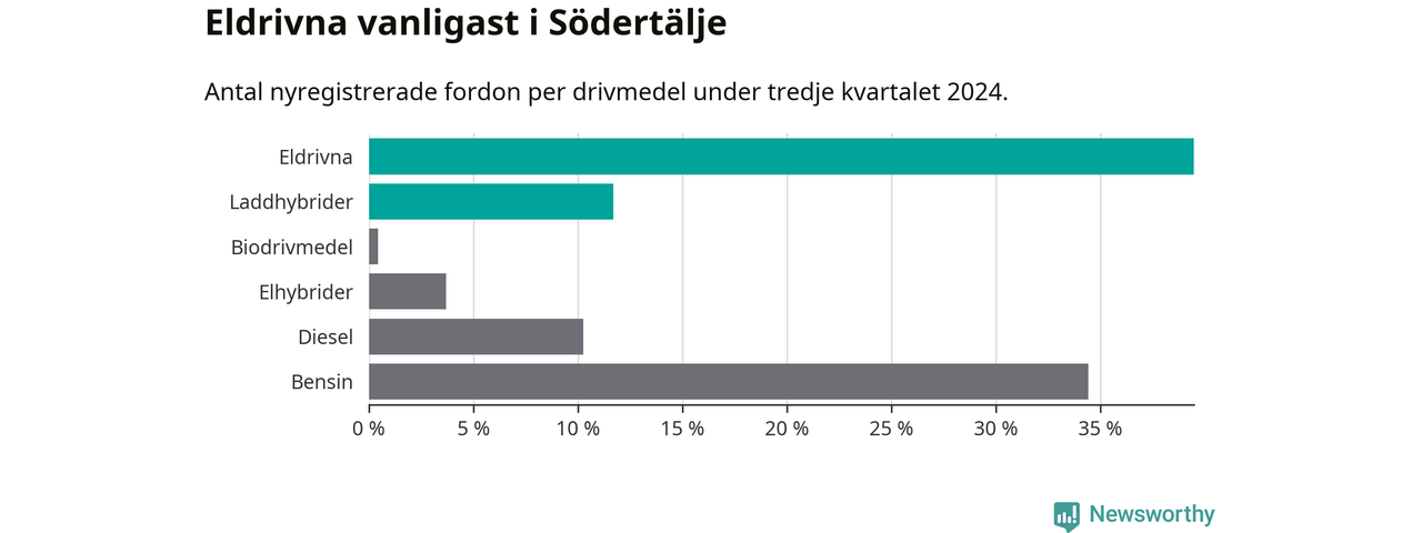 Under tredje kvartalet 2024 var 51 procent av alla nyregistrerade personbilar i Södertälje laddbara (sammanlagt registrerades 2 273 nya bilar). Merparten av de laddbara bilarna var rena elbilar (39 procent av alla).