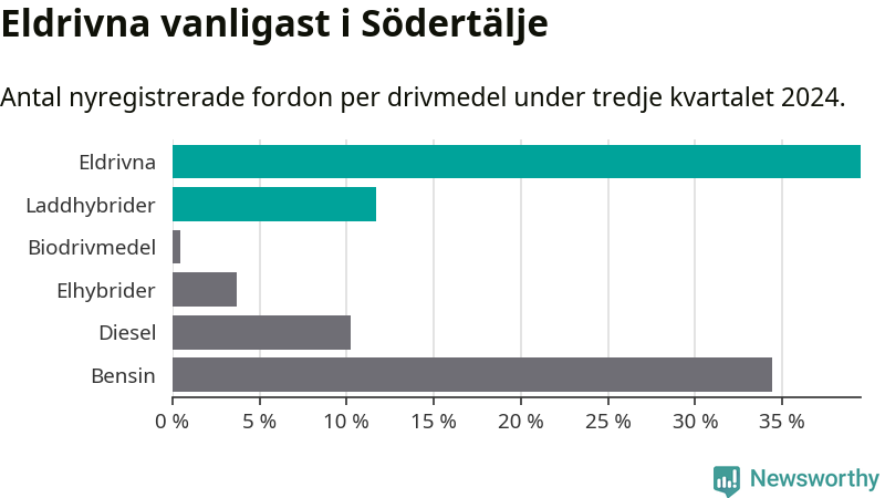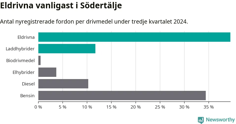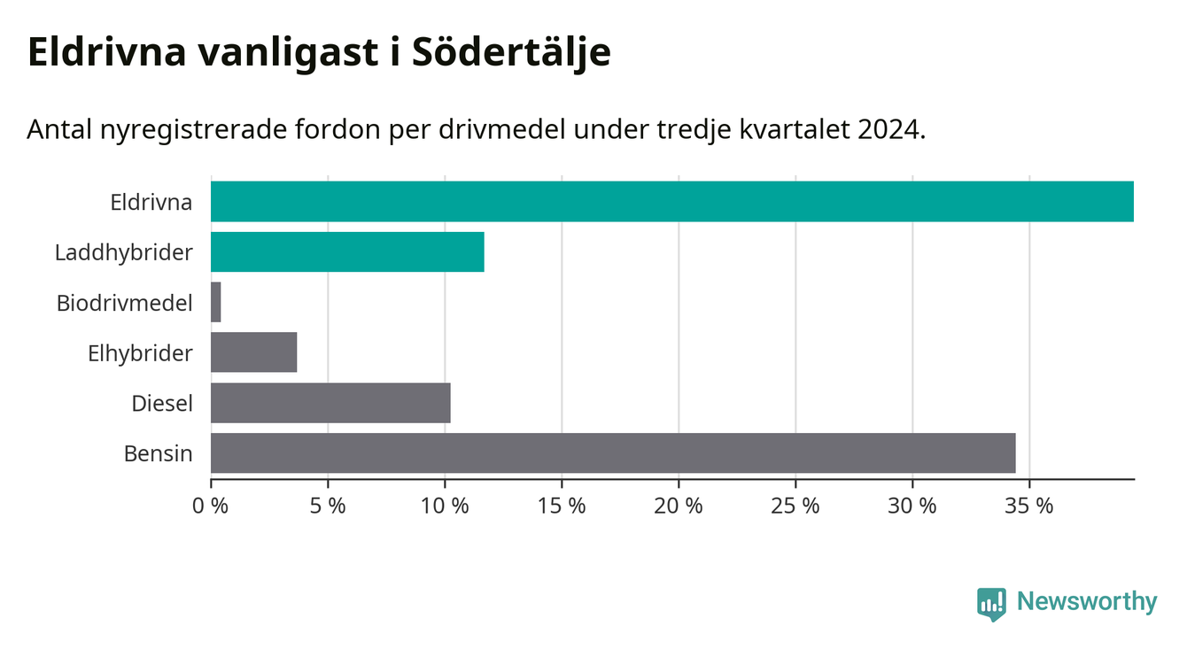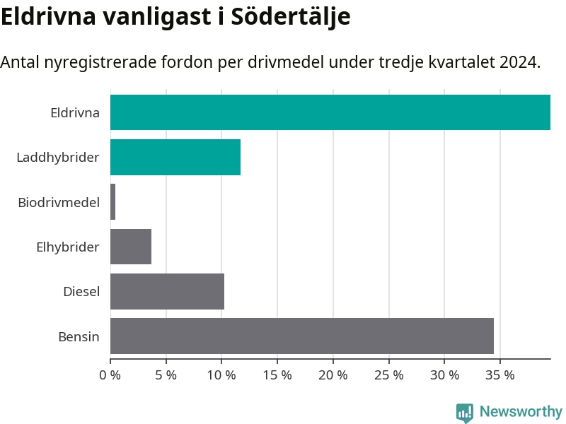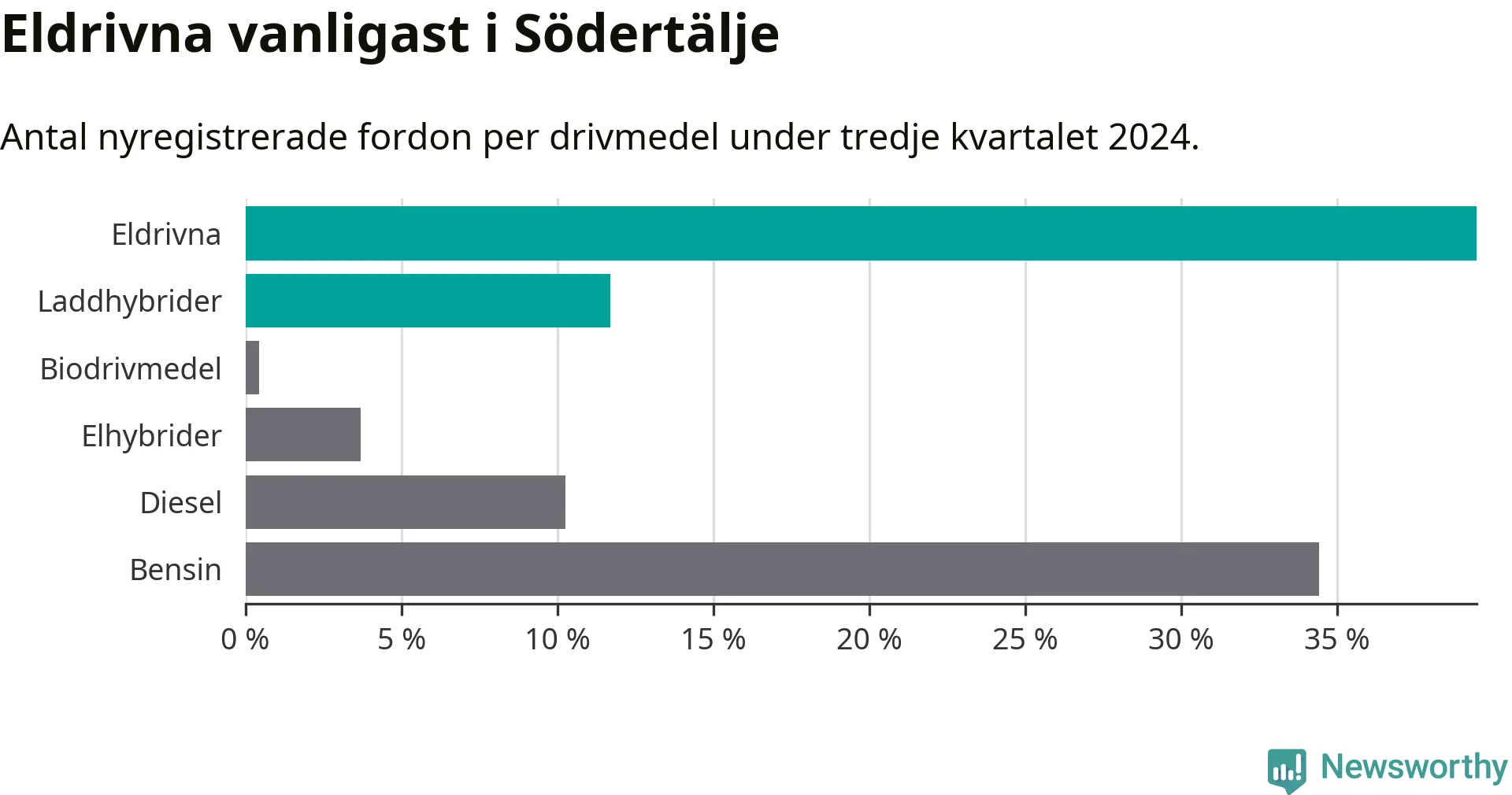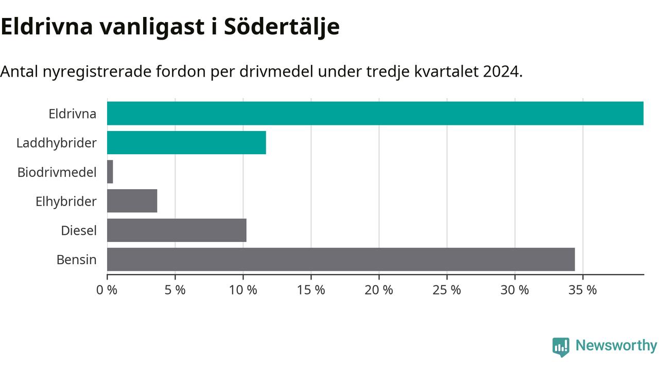 Under tredje kvartalet 2024 var 51 procent av alla nyregistrerade personbilar i Södertälje laddbara (sammanlagt registrerades 2 273 nya bilar). Merparten av de laddbara bilarna var rena elbilar (39 procent av alla).