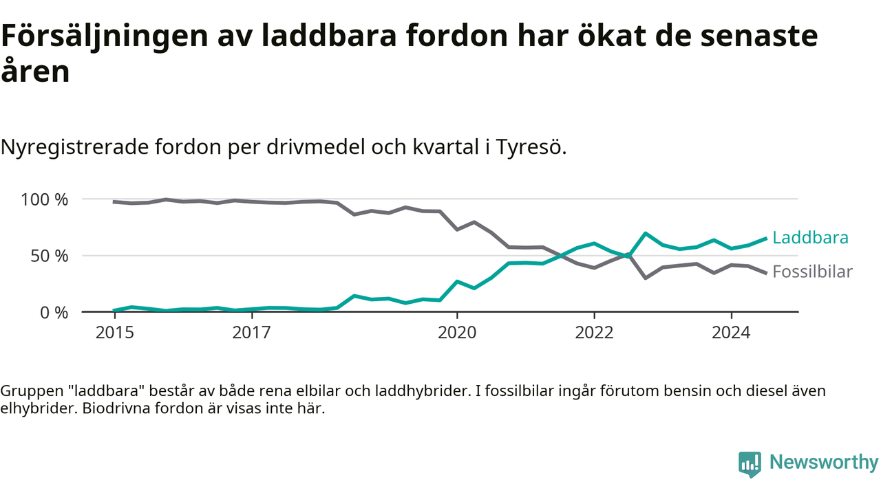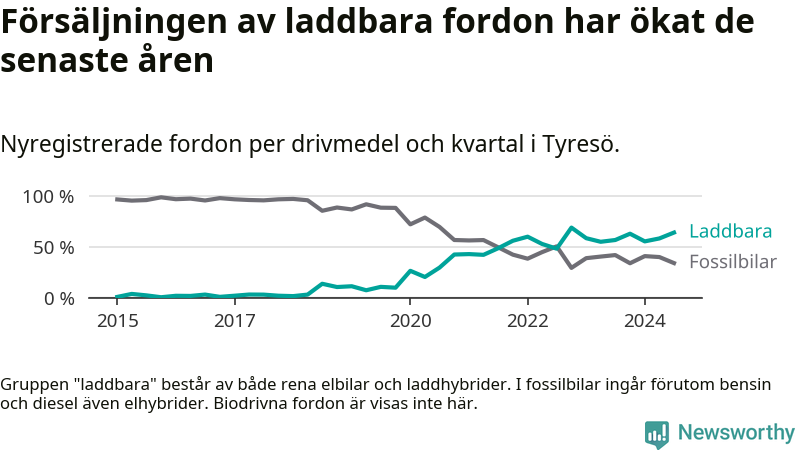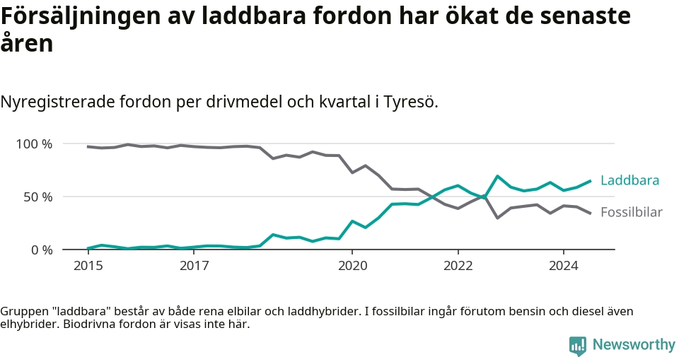 De senaste åren har vi sett en kraftig ökning i försäljning av laddbilar i Sverige. Under slutet av 2023 och början av 2024 har utvecklingen stannat av. I Tyresö peakade andelen laddbara under fjärde kvartalet 2022 (69 procent).