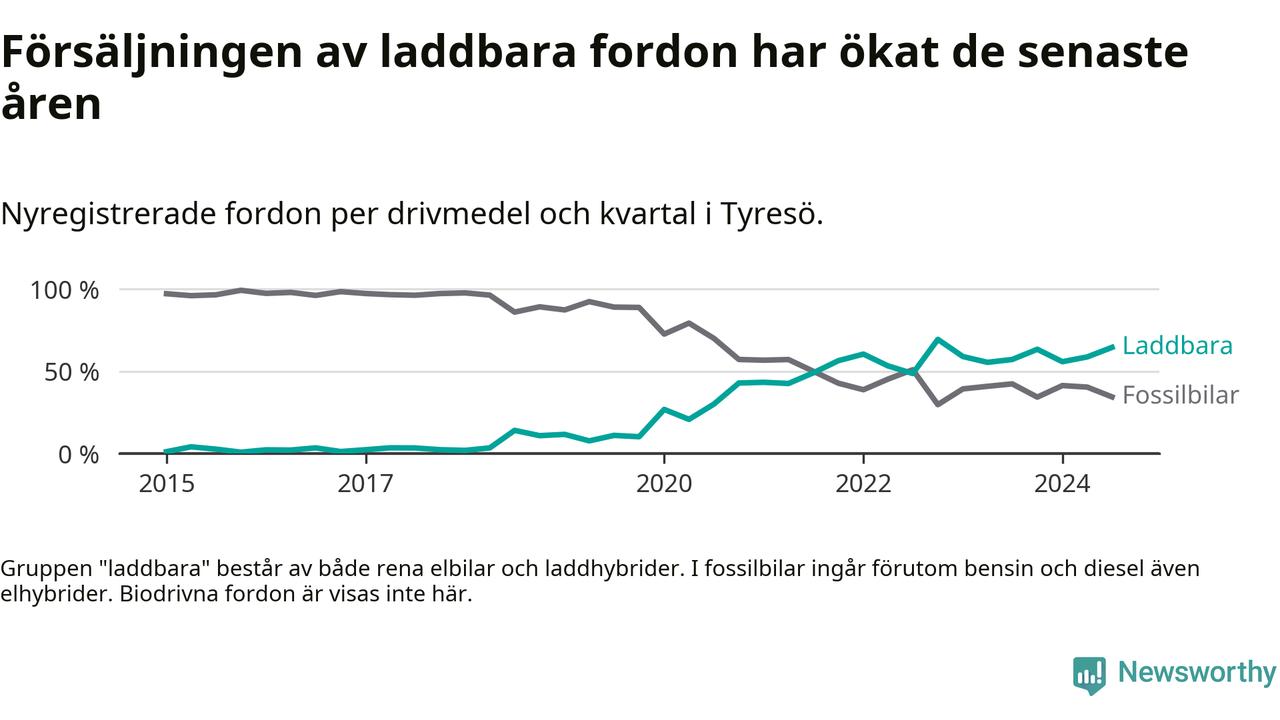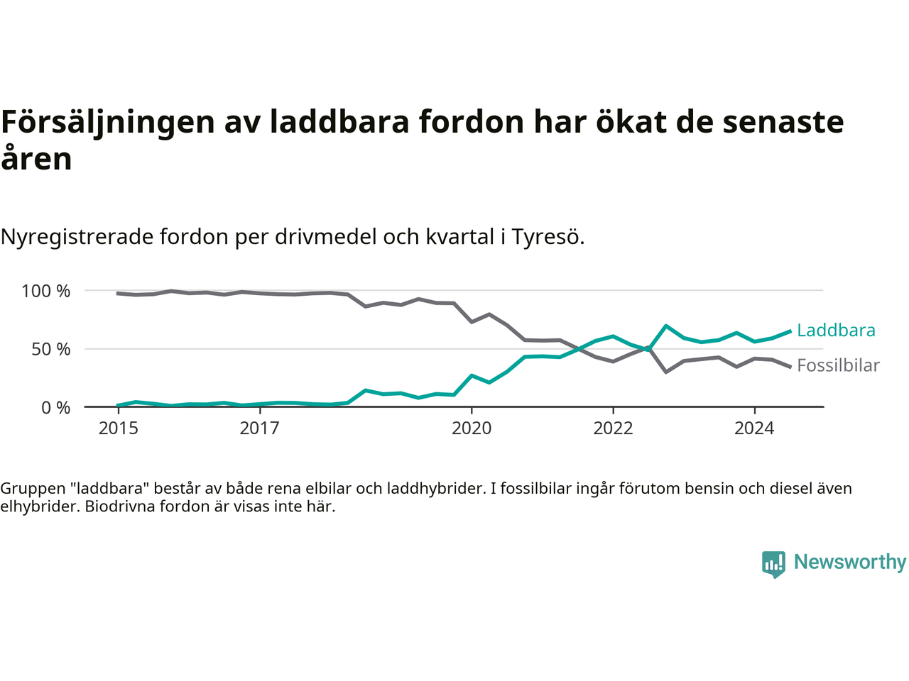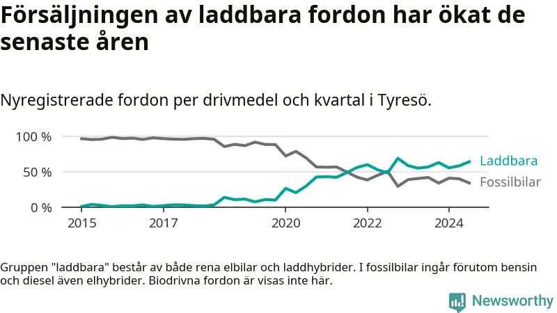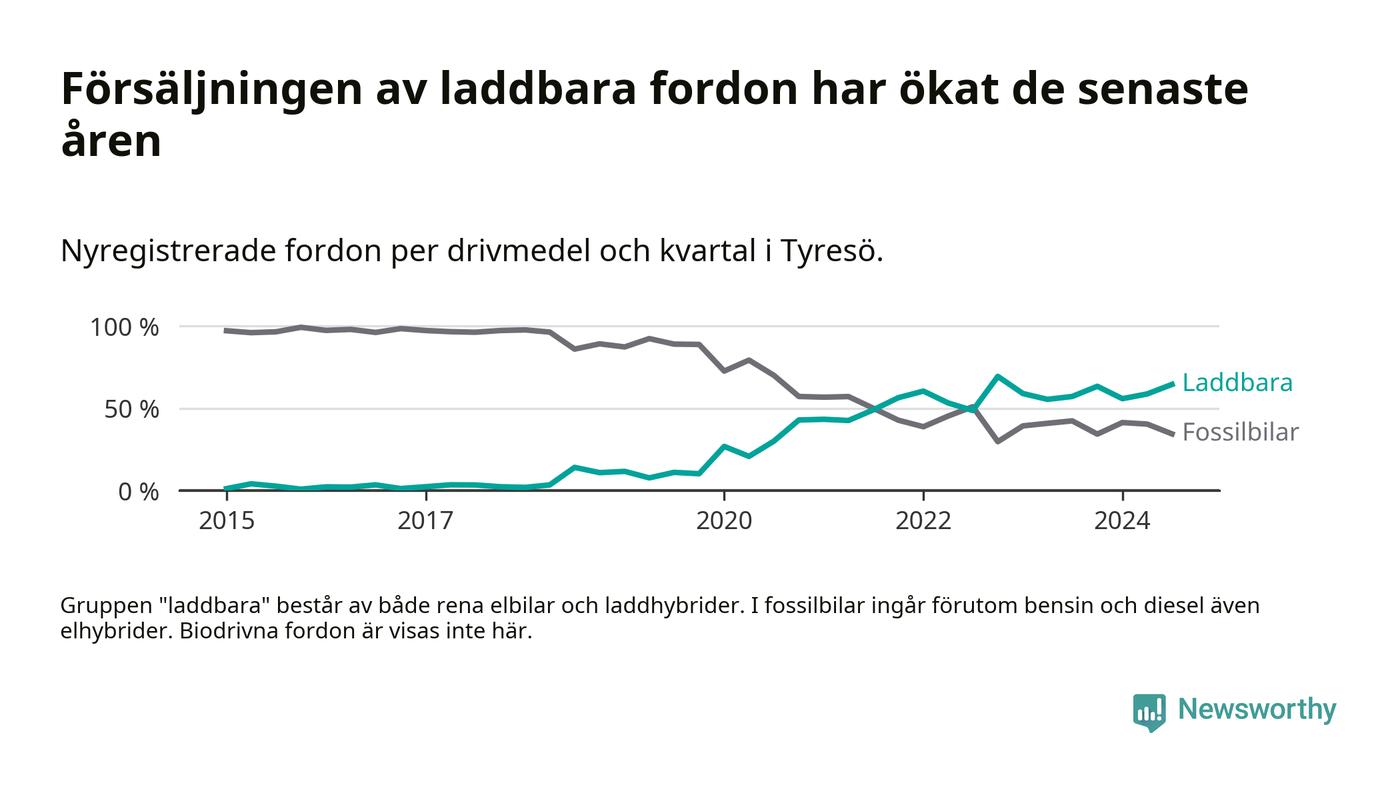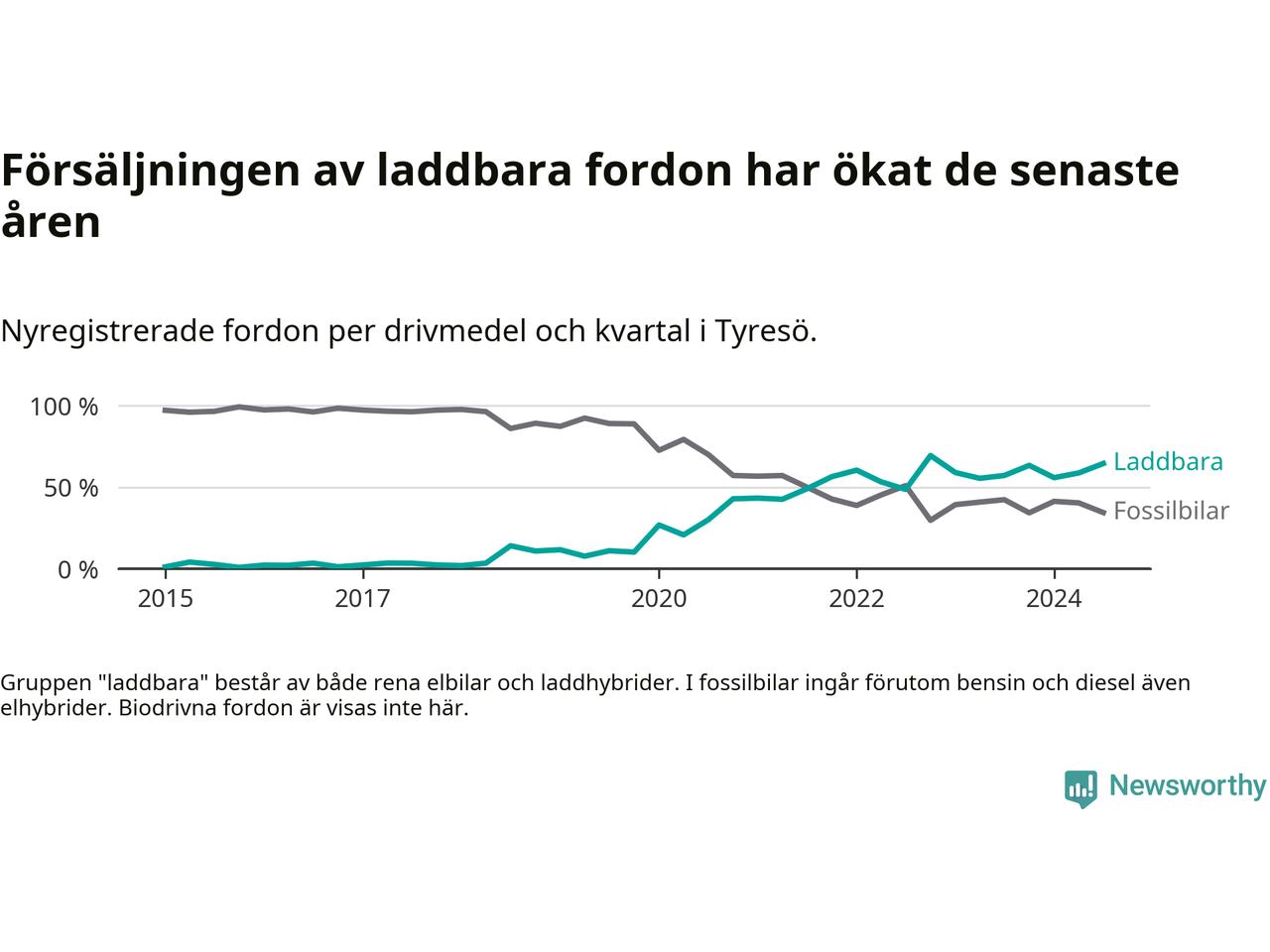 Under tredje kvartalet 2024 var 64 procent av alla nyregistrerade personbilar i Tyresö laddbara (sammanlagt registrerades 183 nya bilar). Merparten av de laddbara bilarna var rena elbilar (45 procent av alla).