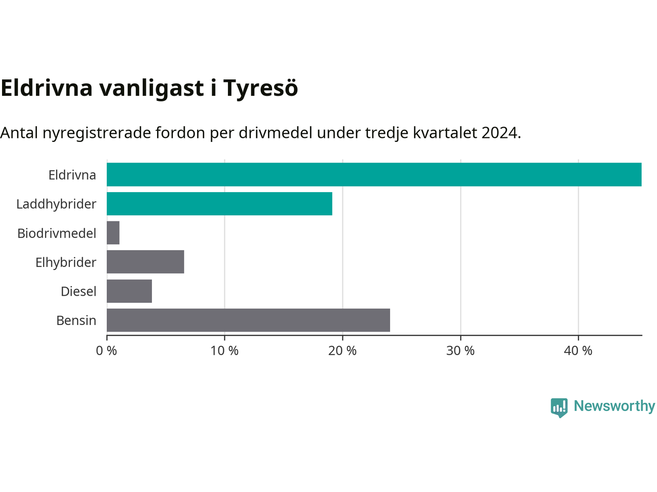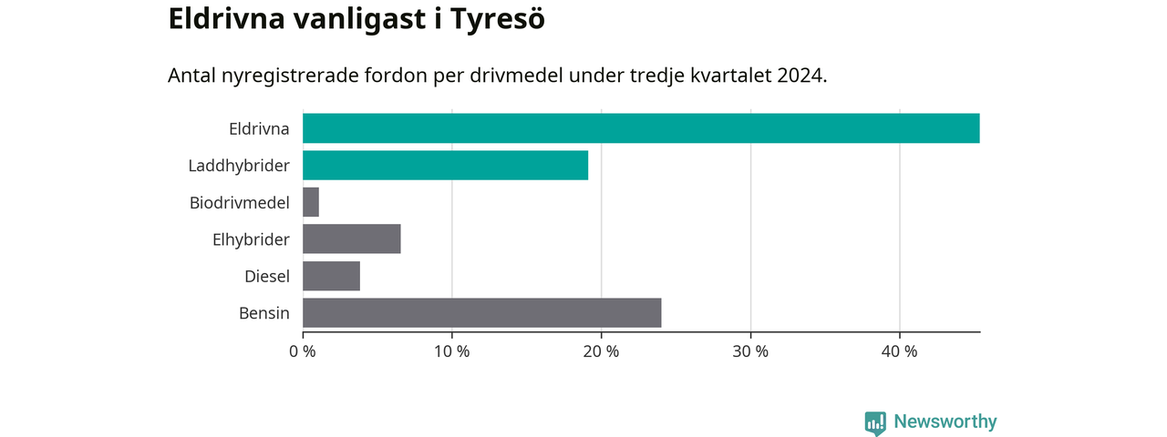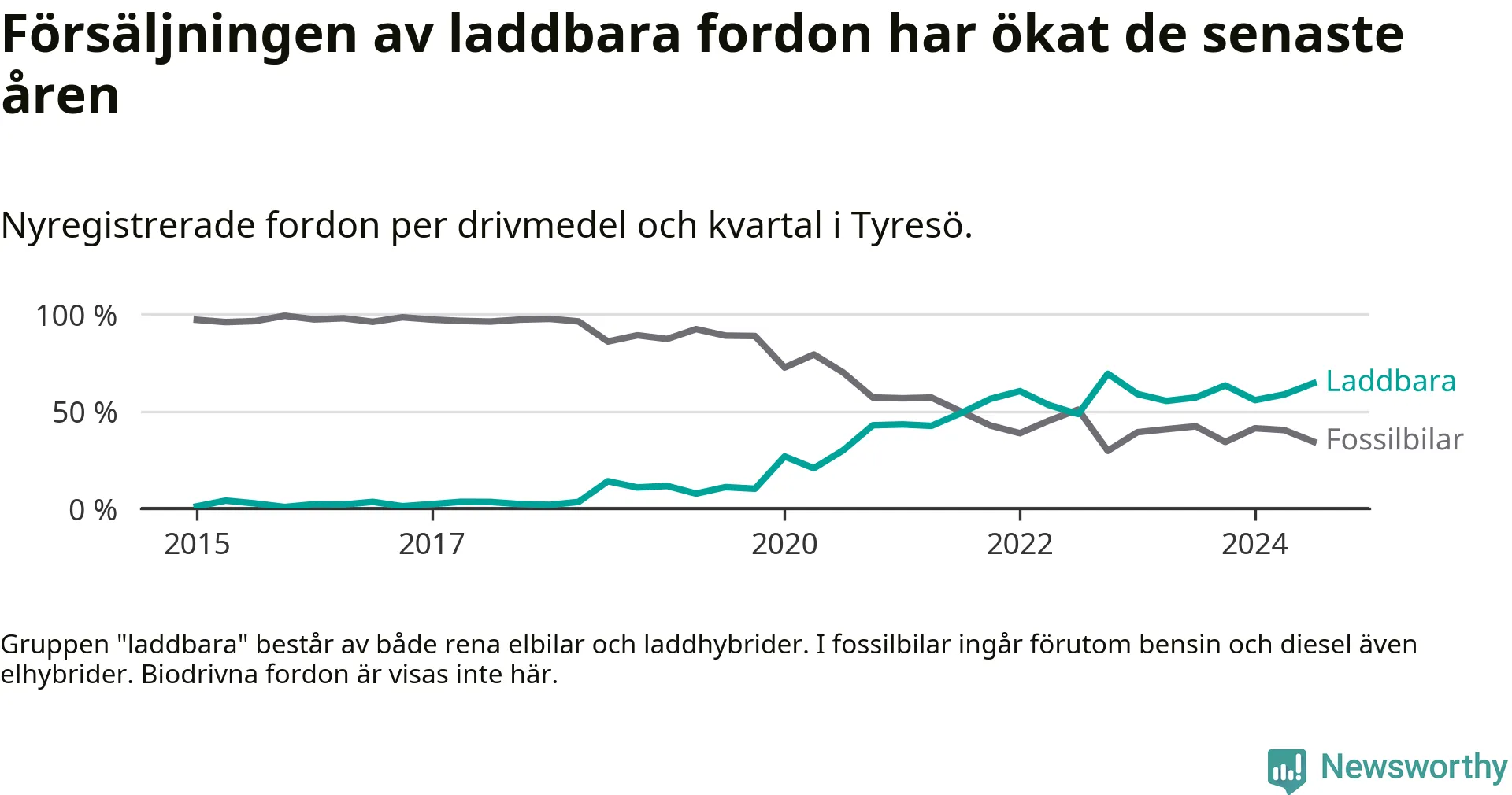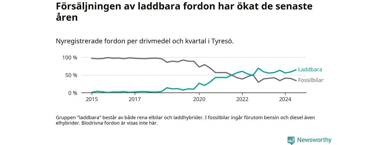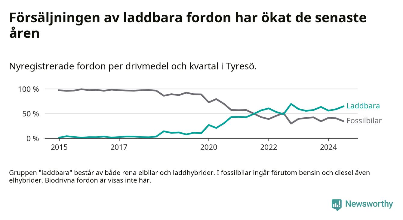 Under tredje kvartalet 2024 var 64 procent av alla nyregistrerade personbilar i Tyresö laddbara (sammanlagt registrerades 183 nya bilar). Merparten av de laddbara bilarna var rena elbilar (45 procent av alla).