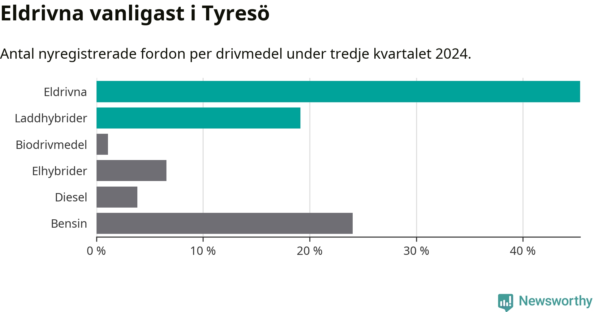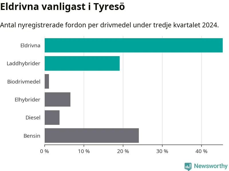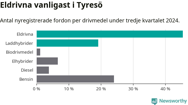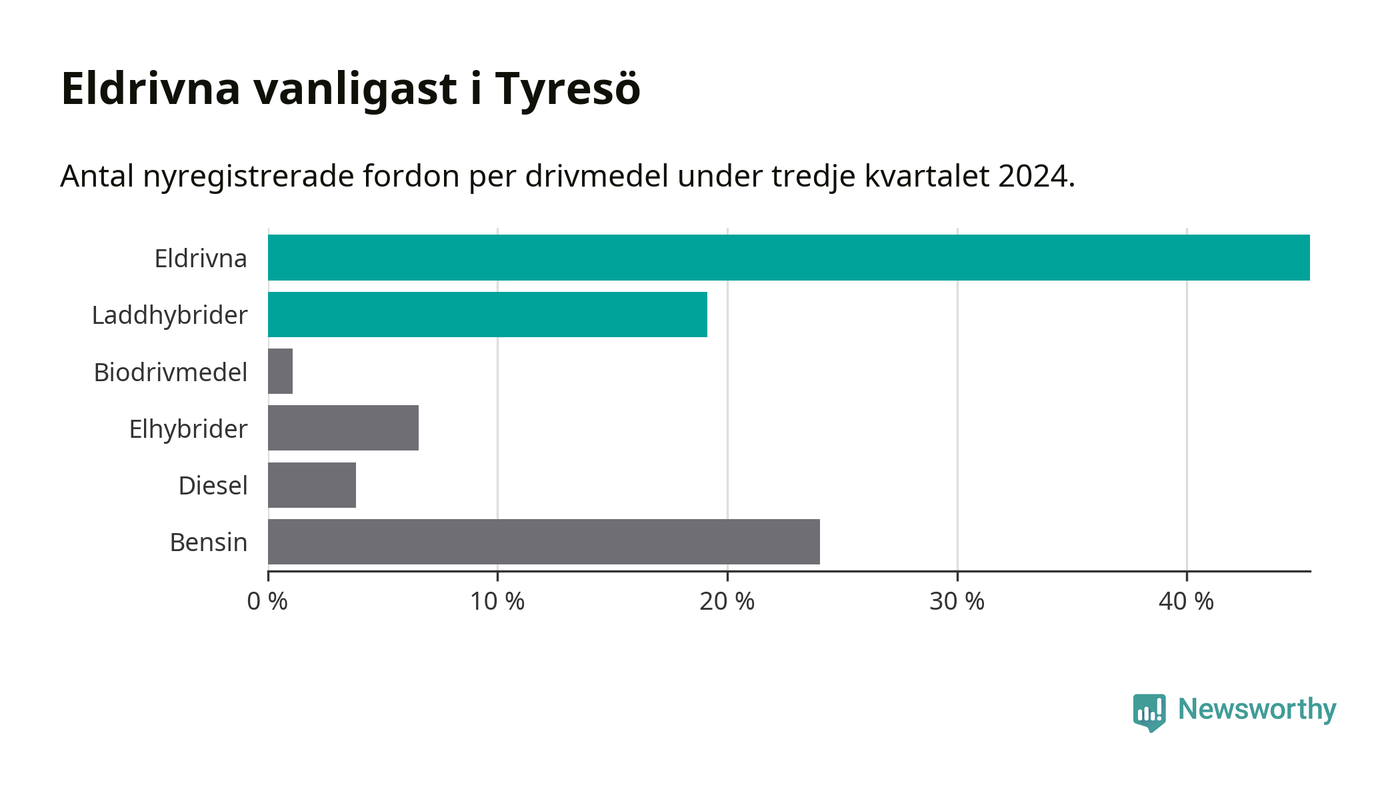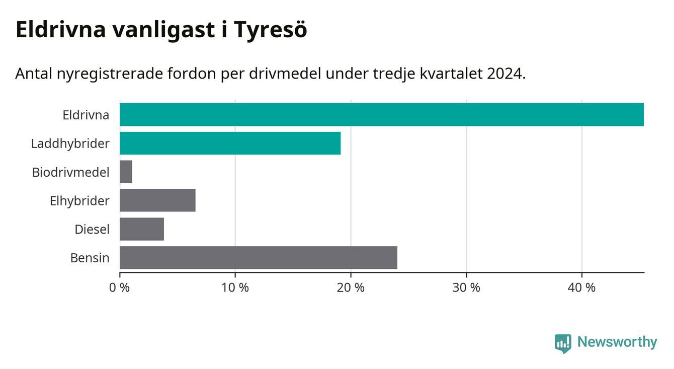 Under tredje kvartalet 2024 var 64 procent av alla nyregistrerade personbilar i Tyresö laddbara (sammanlagt registrerades 183 nya bilar). Merparten av de laddbara bilarna var rena elbilar (45 procent av alla).