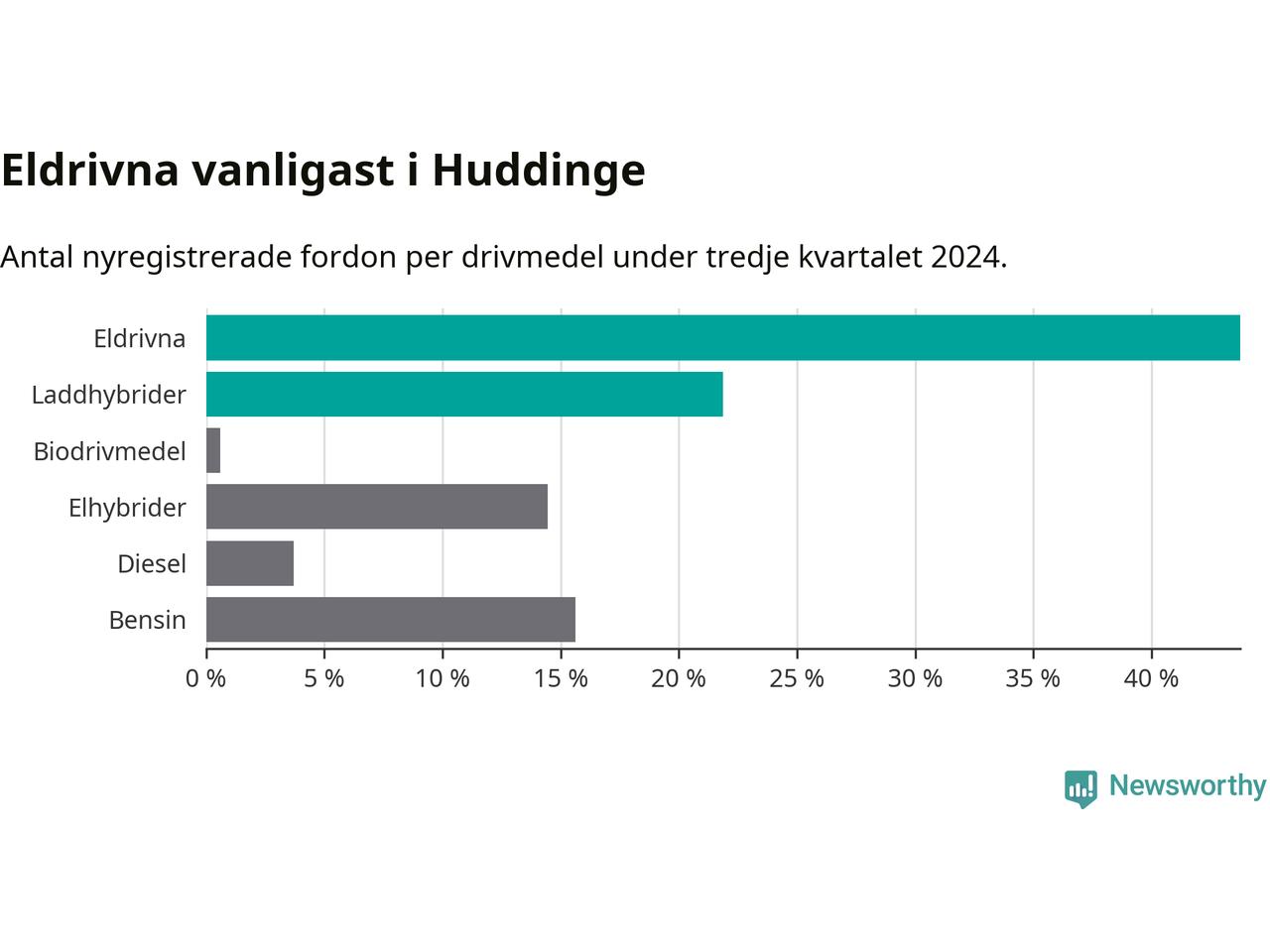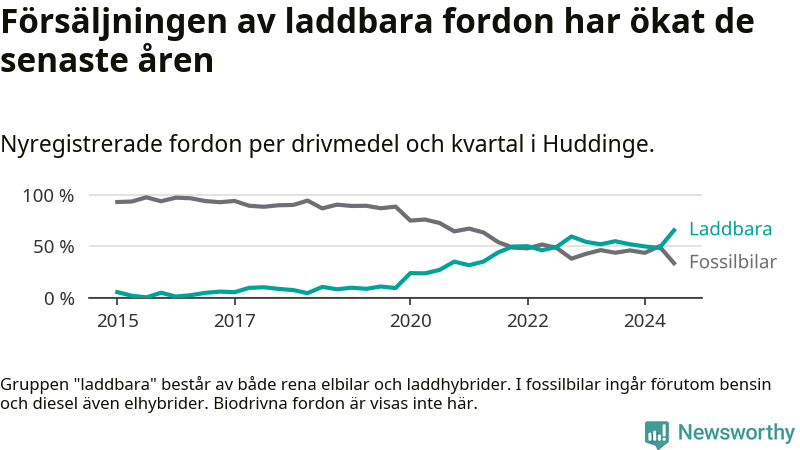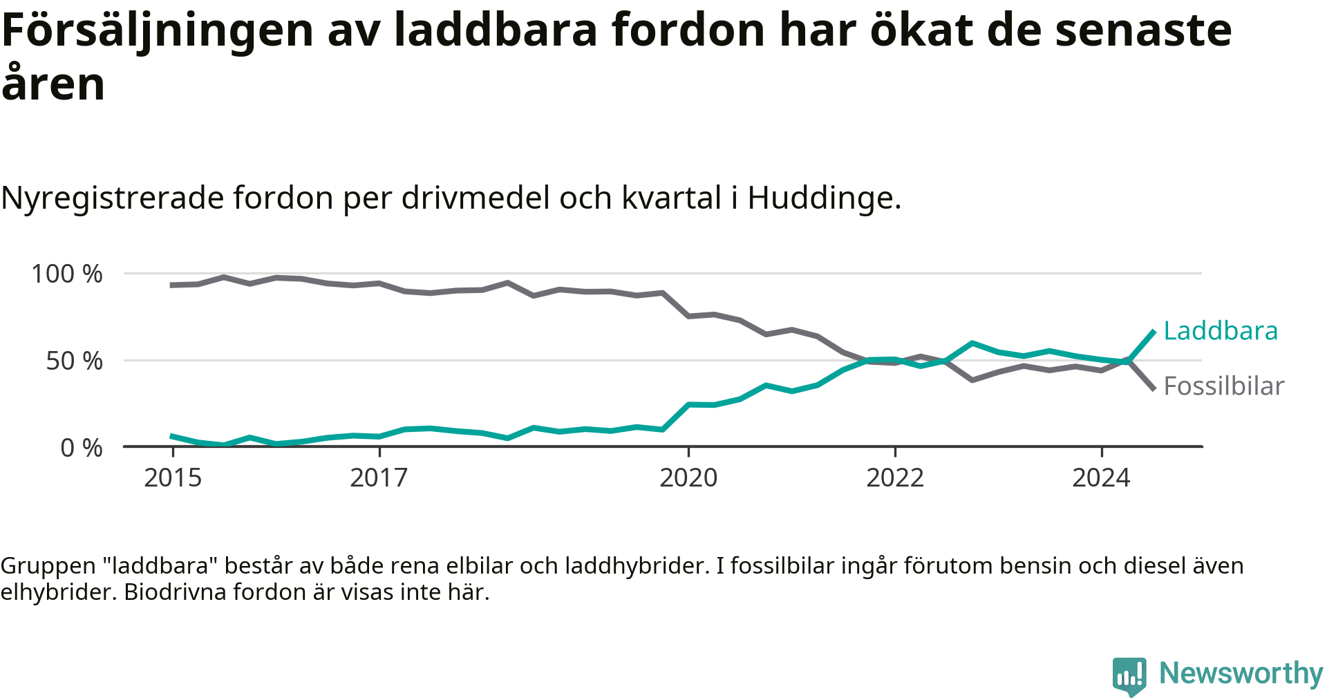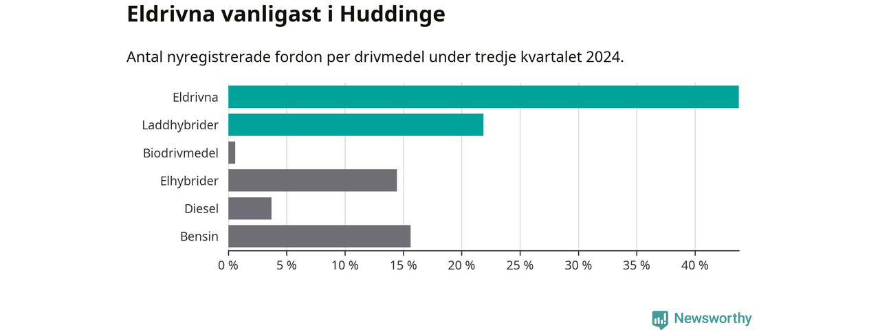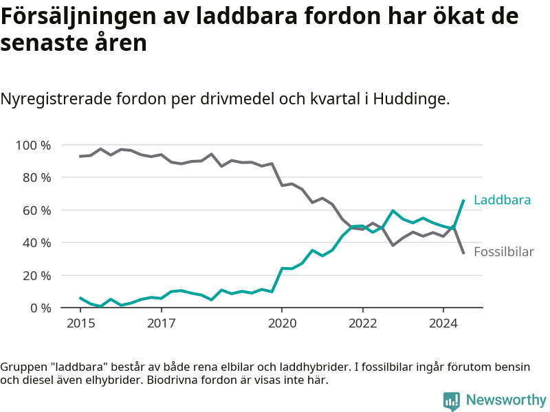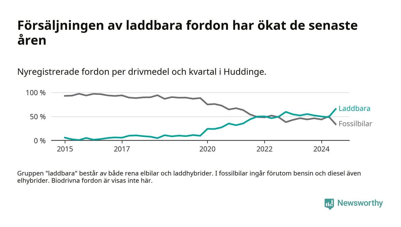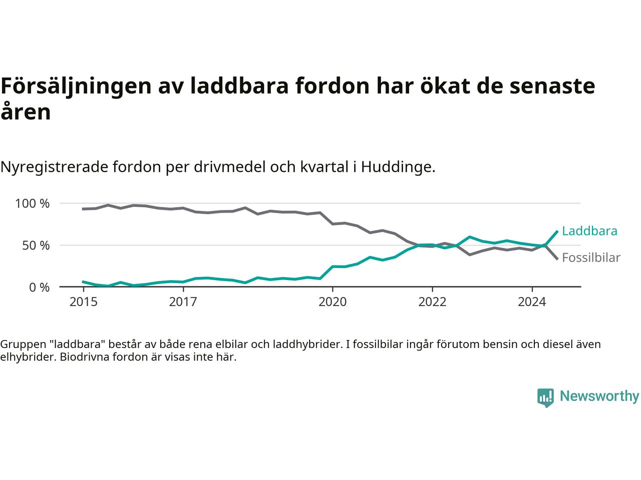 Under tredje kvartalet 2024 var 66 procent av alla nyregistrerade personbilar i Huddinge laddbara (sammanlagt registrerades 512 nya bilar). Merparten av de laddbara bilarna var rena elbilar (44 procent av alla).