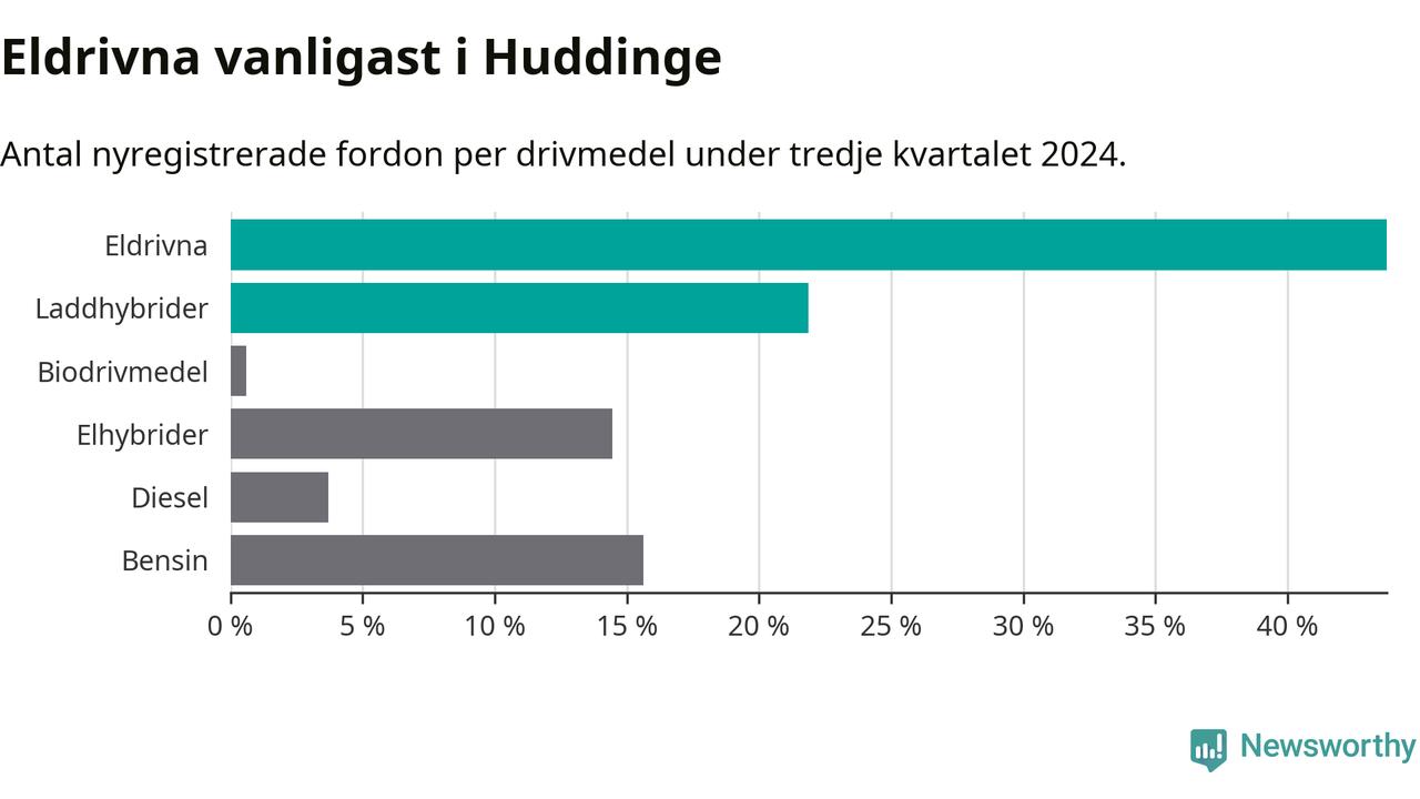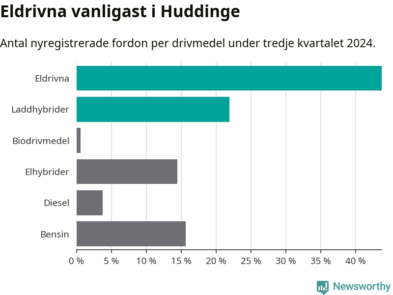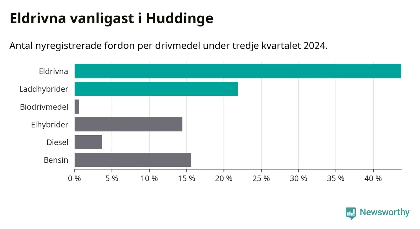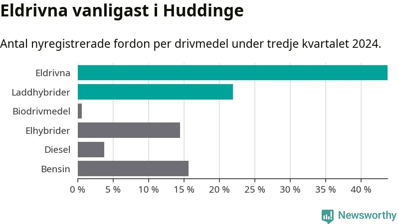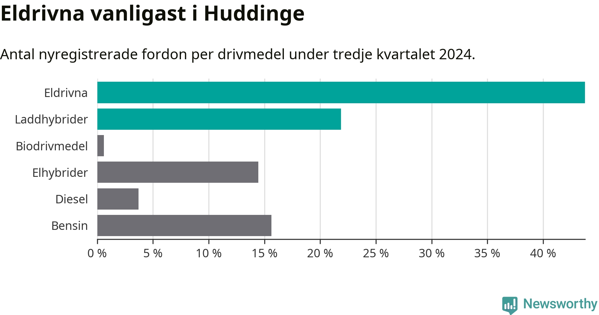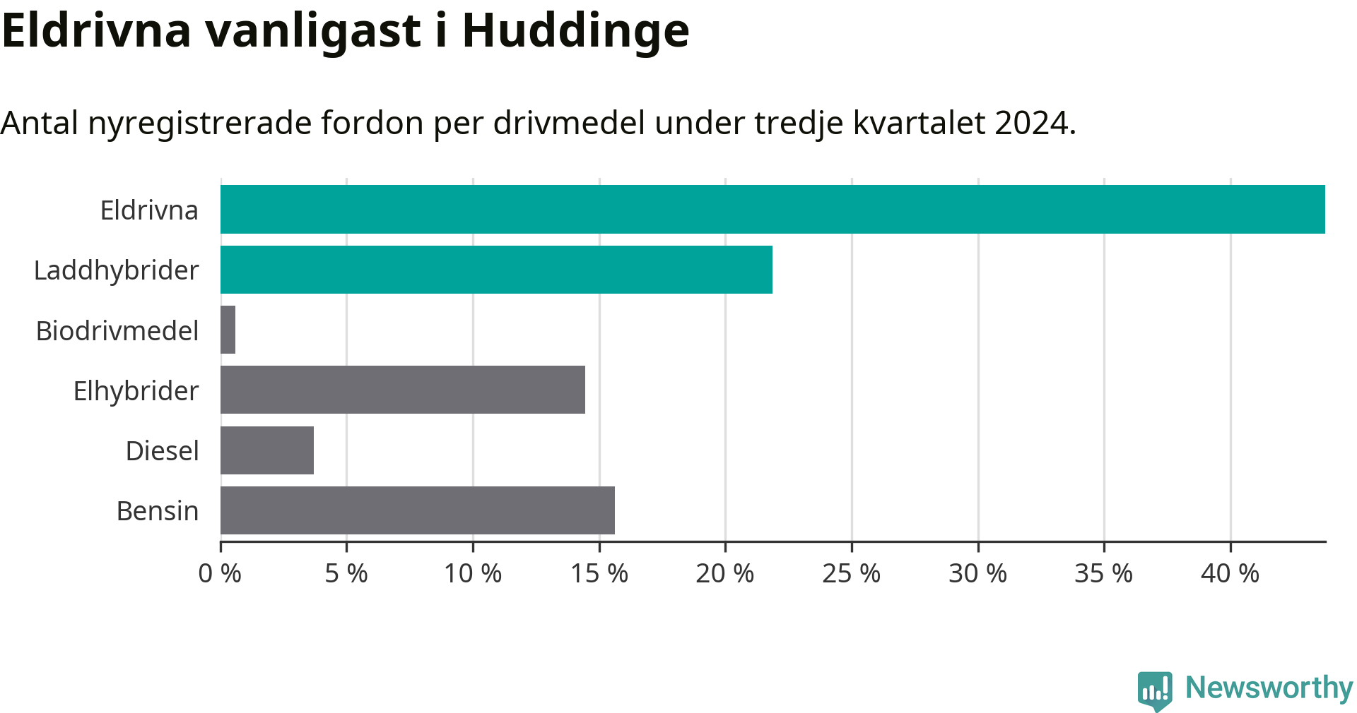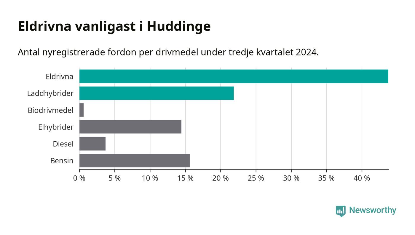 Under tredje kvartalet 2024 var 66 procent av alla nyregistrerade personbilar i Huddinge laddbara (sammanlagt registrerades 512 nya bilar). Merparten av de laddbara bilarna var rena elbilar (44 procent av alla).