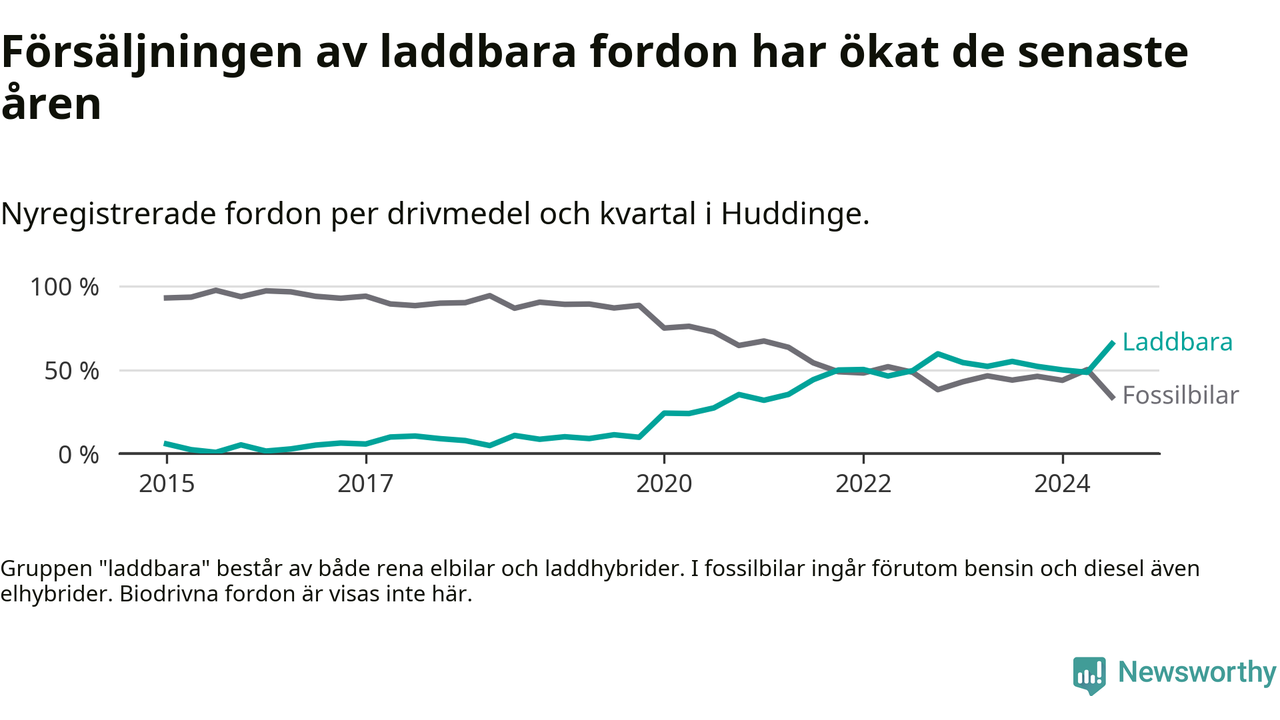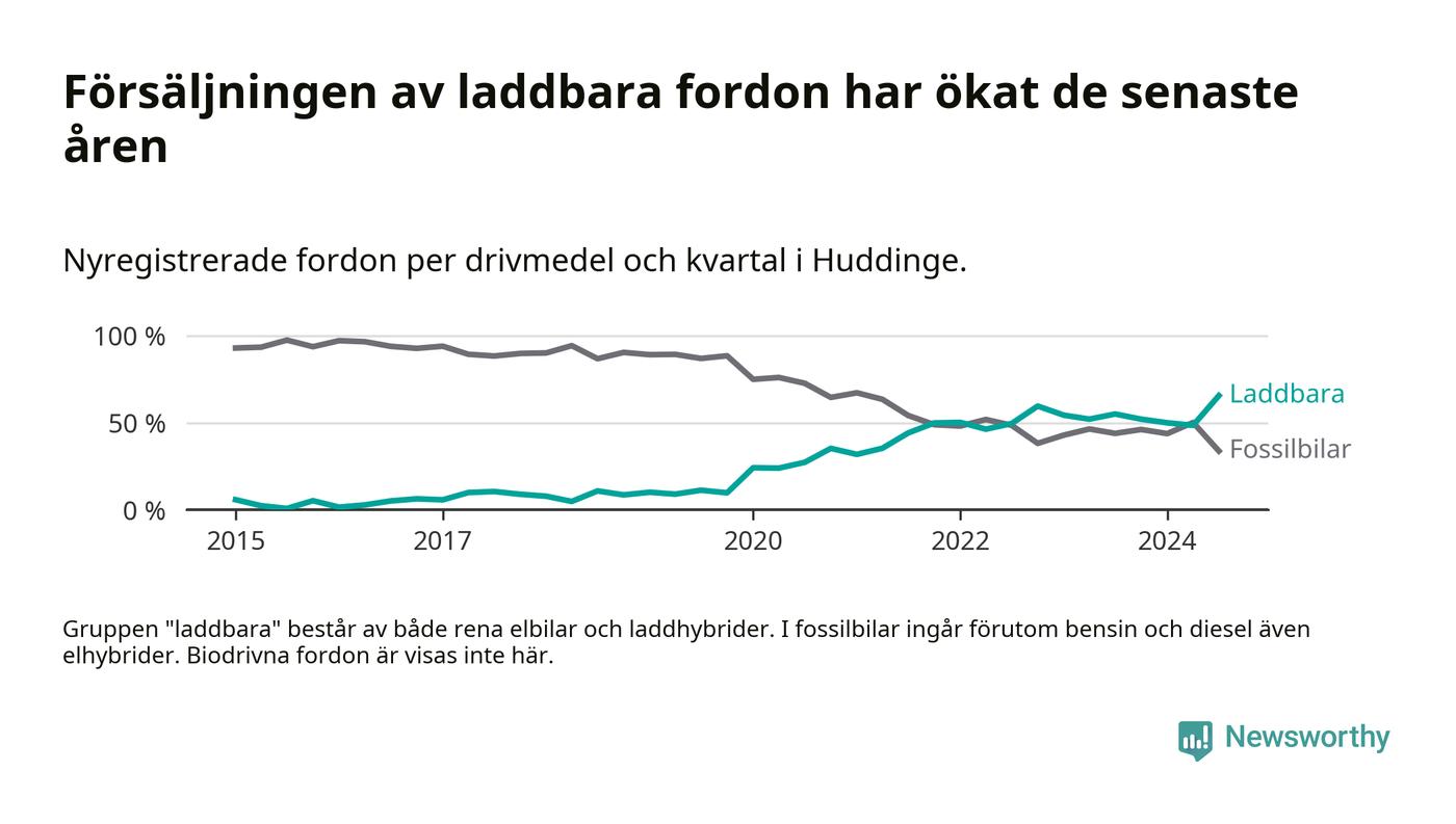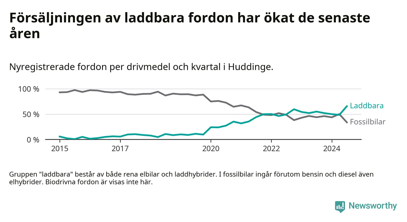 De senaste åren har vi sett en kraftig ökning i försäljning av laddbilar i Sverige. Under slutet av 2023 och början av 2024 har utvecklingen stannat av. Men i Huddinge noterades ett nytt rekord under tredje kvartalet. Aldrig tidigare har laddbara bilar utgjort en så stor del av alla nya bilar.