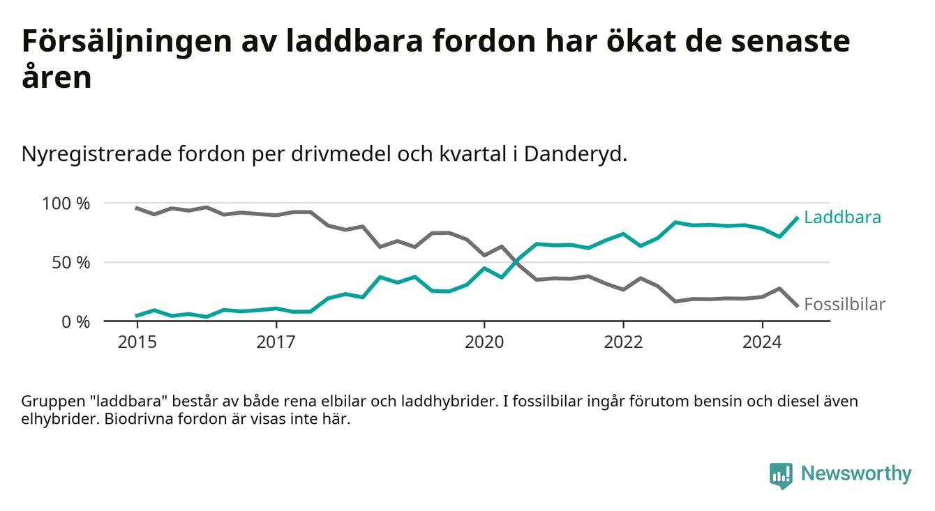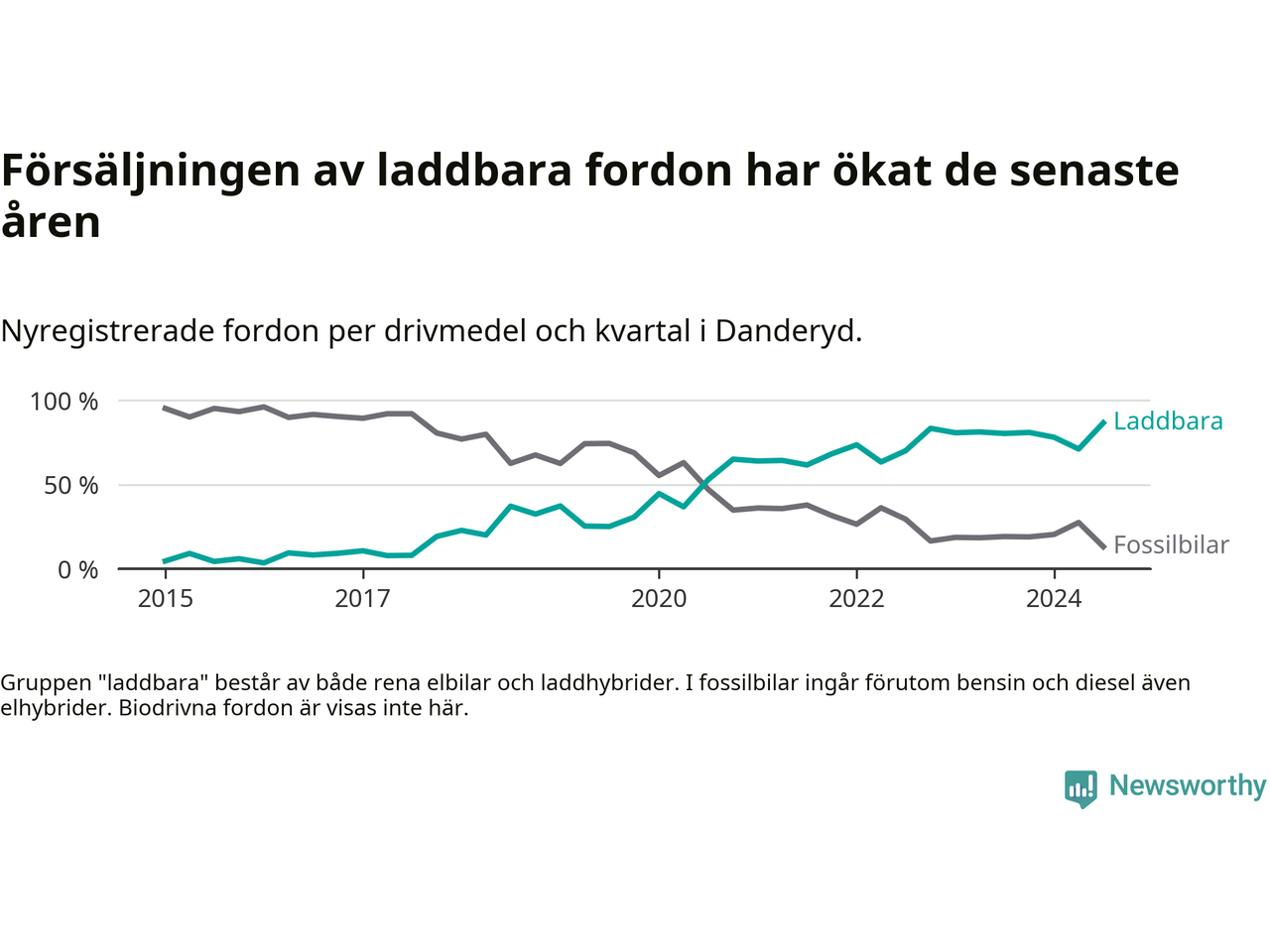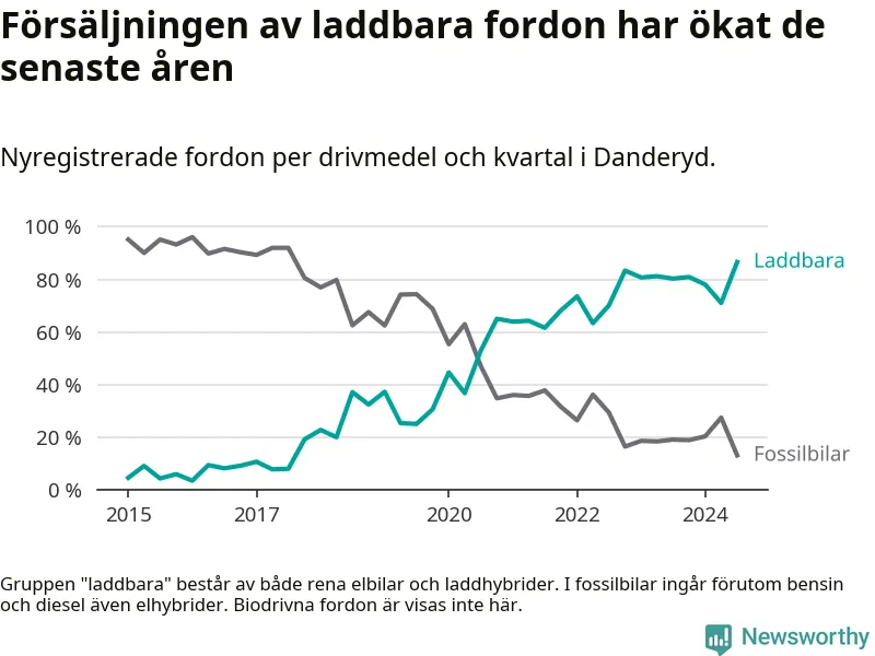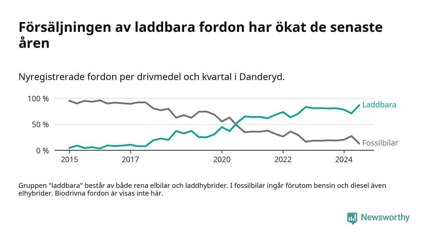 Under tredje kvartalet 2024 var 87 procent av alla nyregistrerade personbilar i Danderyd laddbara (sammanlagt registrerades 343 nya bilar). Merparten av de laddbara bilarna var rena elbilar (62 procent av alla).