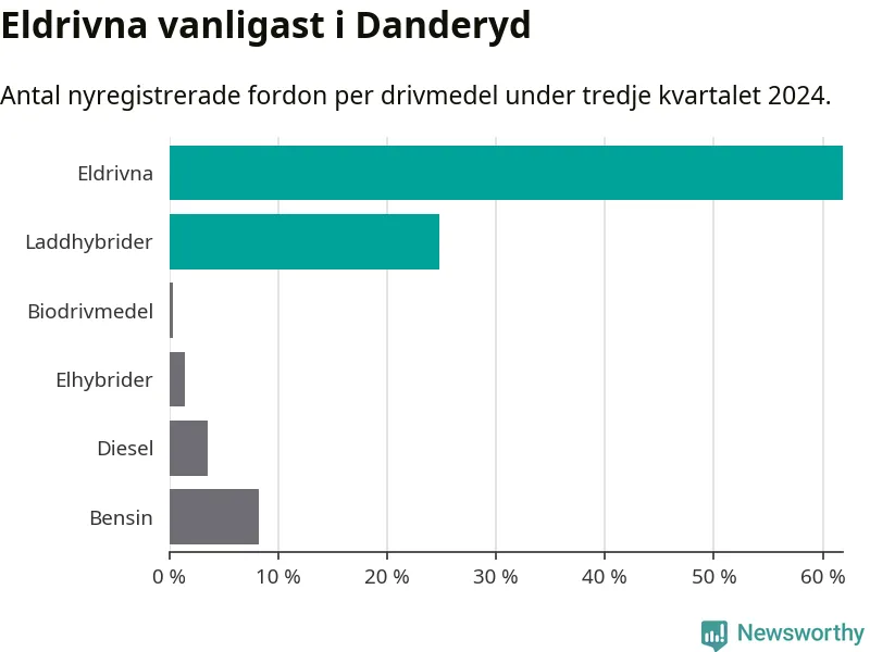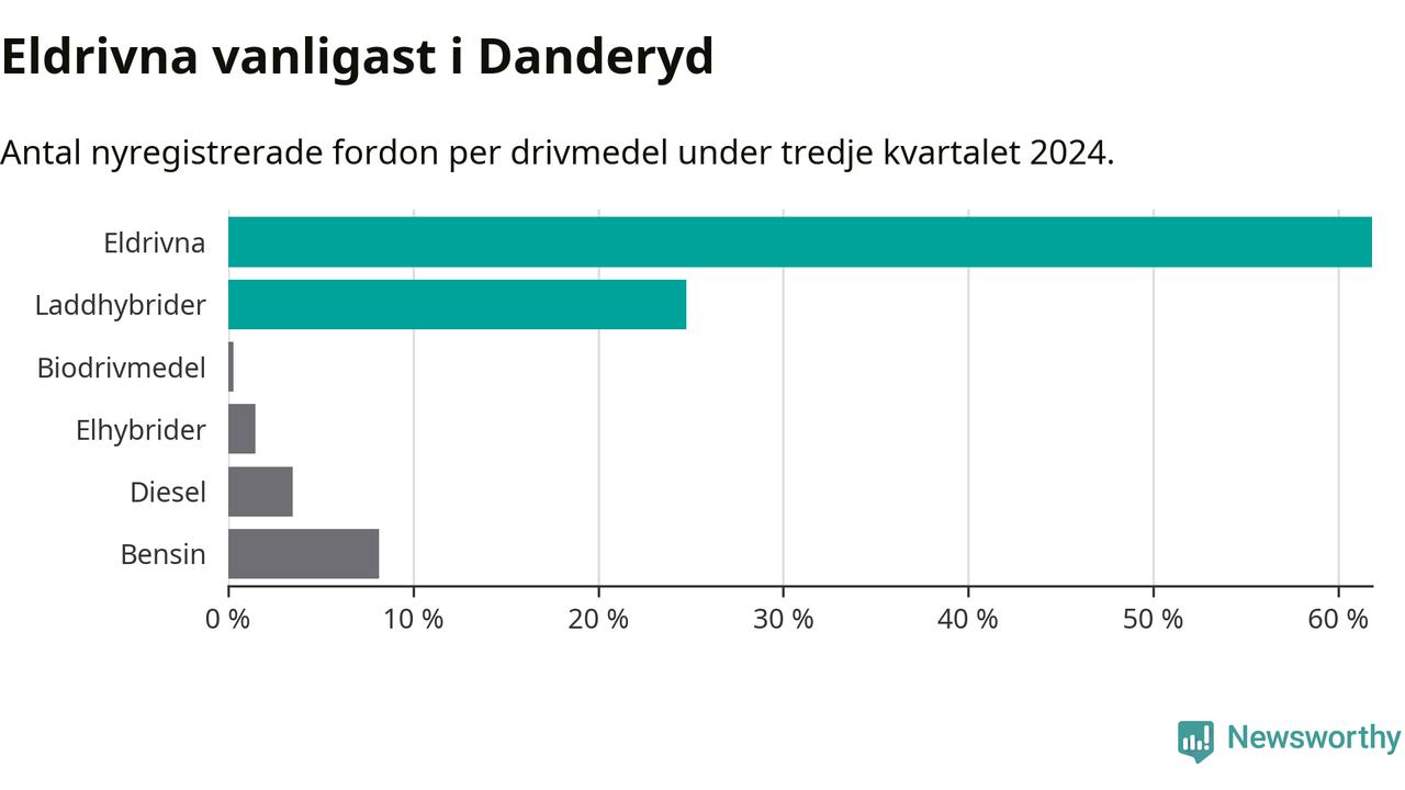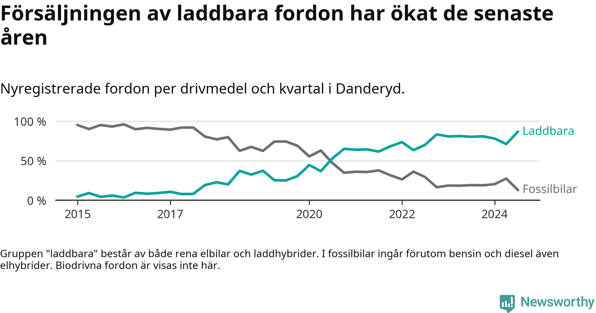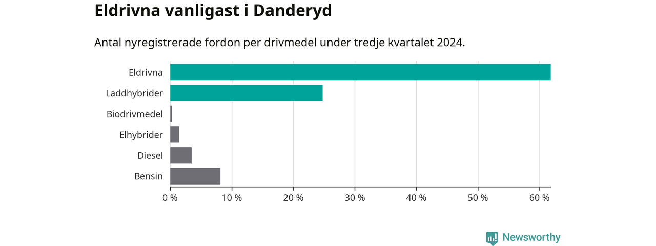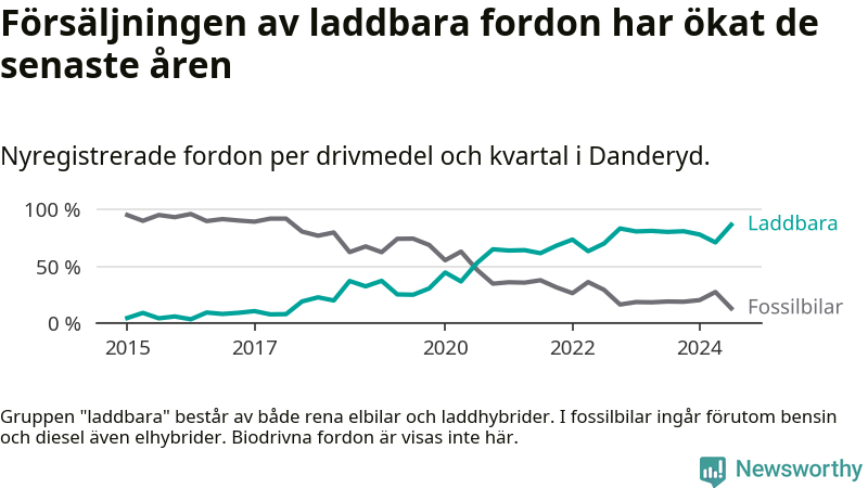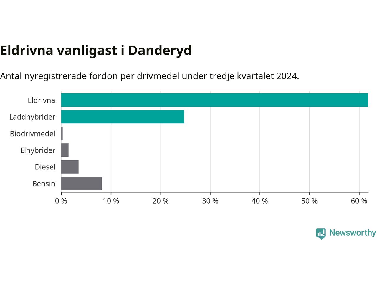Under tredje kvartalet 2024 var 87 procent av alla nyregistrerade personbilar i Danderyd laddbara (sammanlagt registrerades 343 nya bilar). Merparten av de laddbara bilarna var rena elbilar (62 procent av alla).