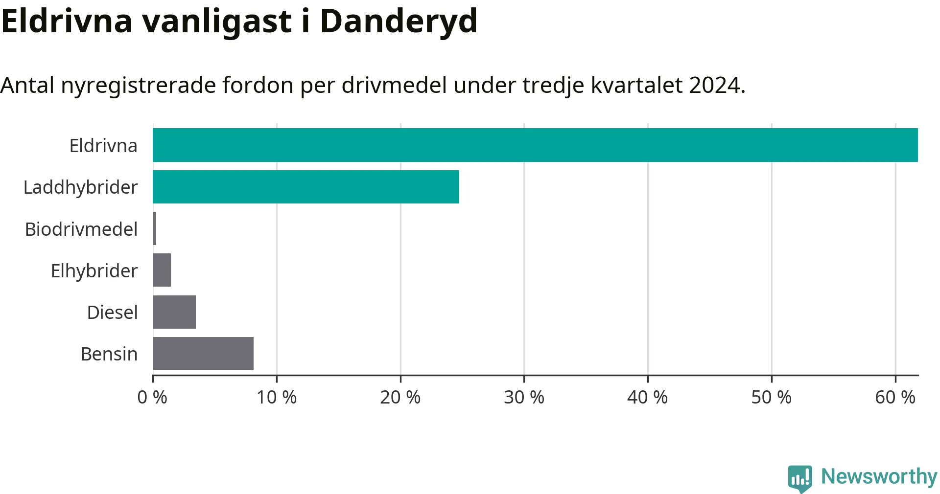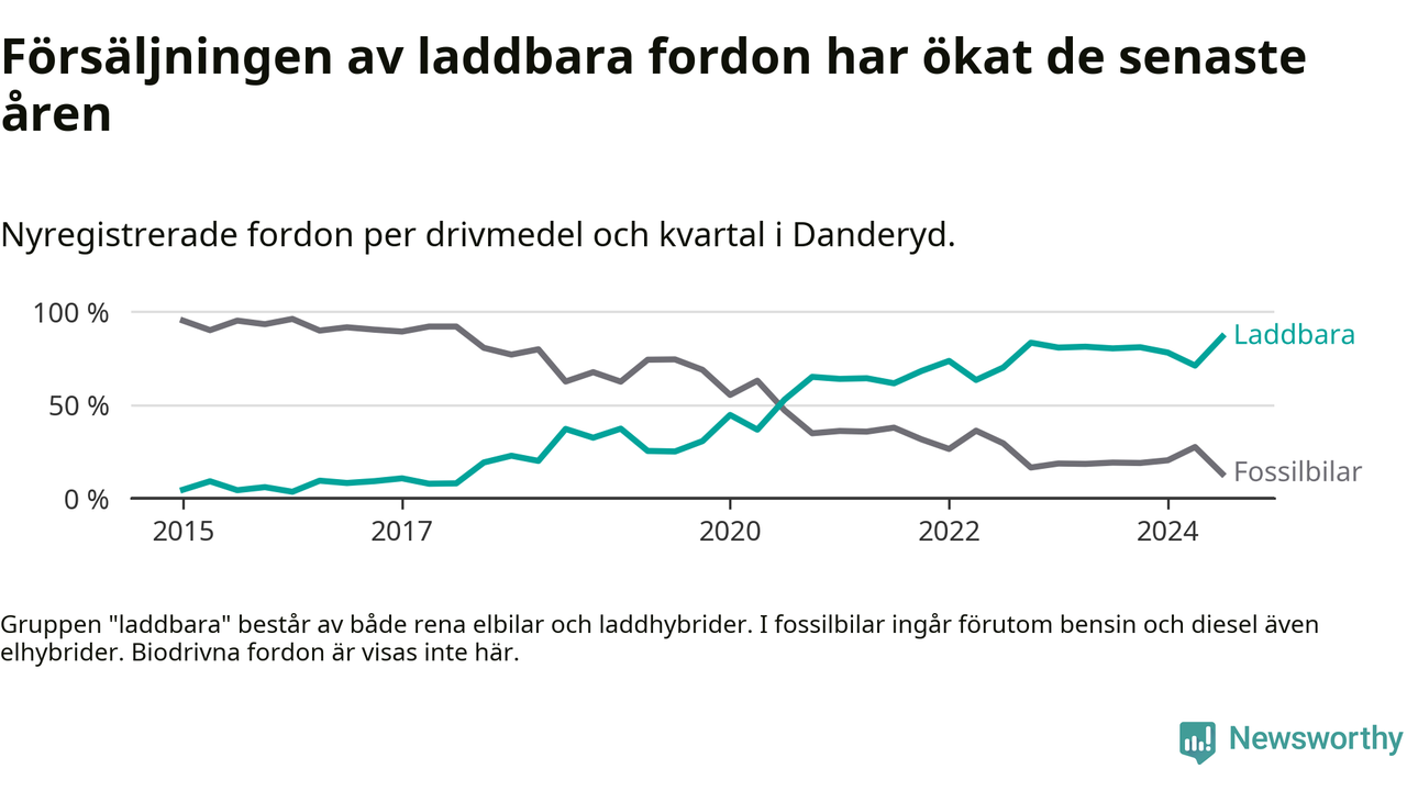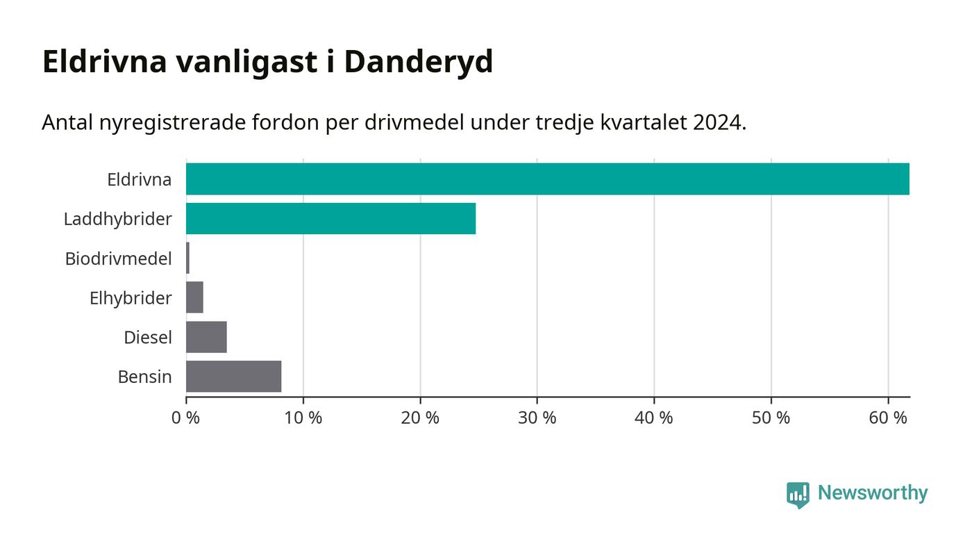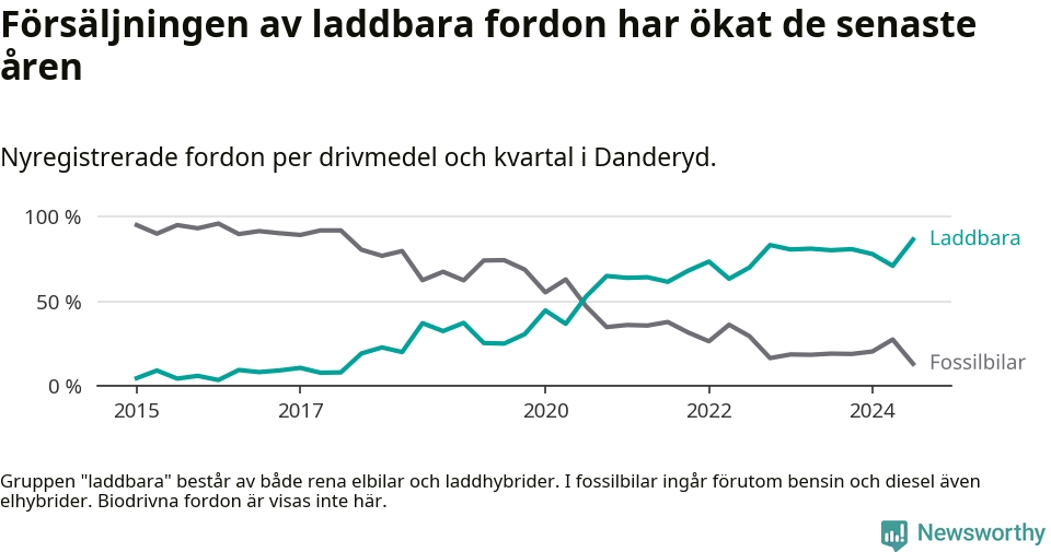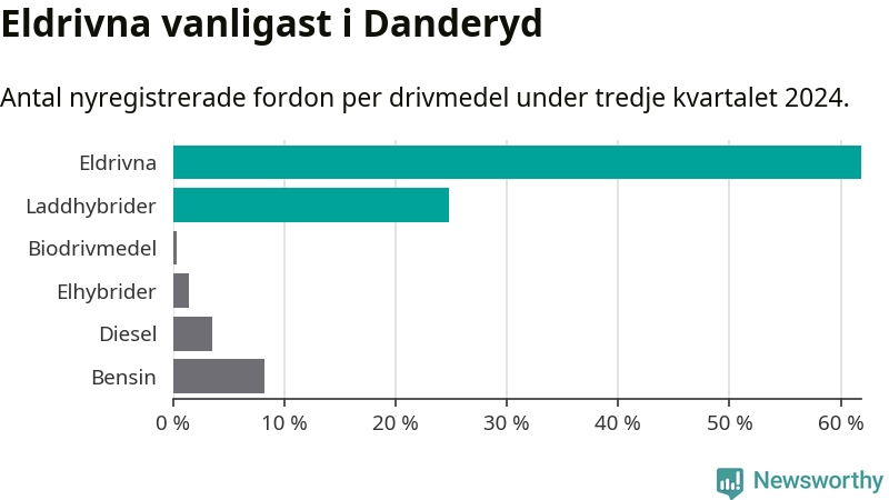 Under tredje kvartalet 2024 var 87 procent av alla nyregistrerade personbilar i Danderyd laddbara (sammanlagt registrerades 343 nya bilar). Merparten av de laddbara bilarna var rena elbilar (62 procent av alla).