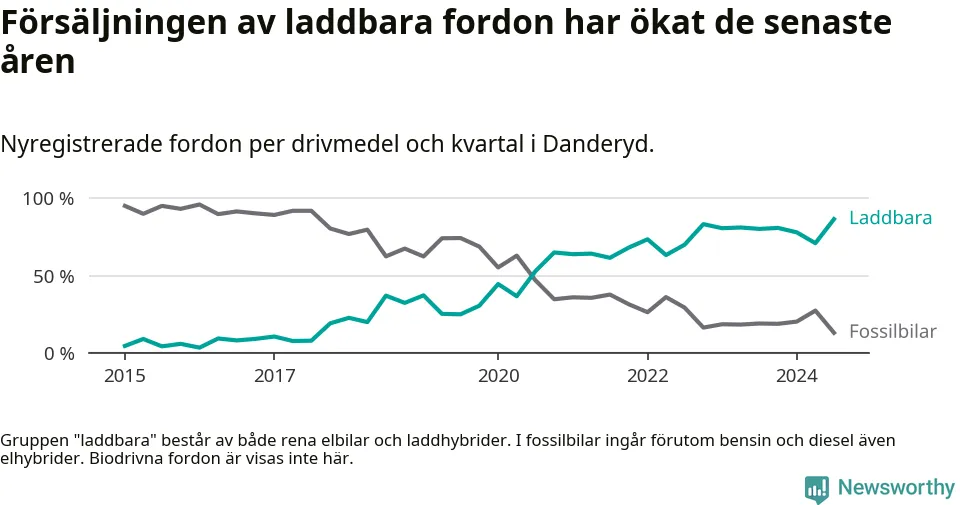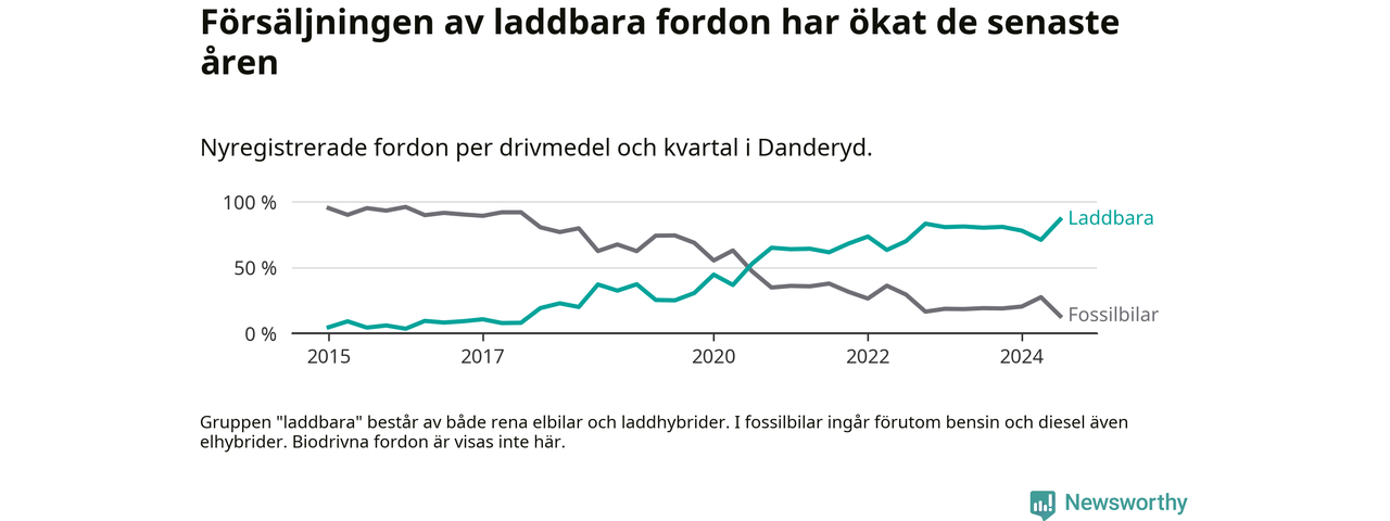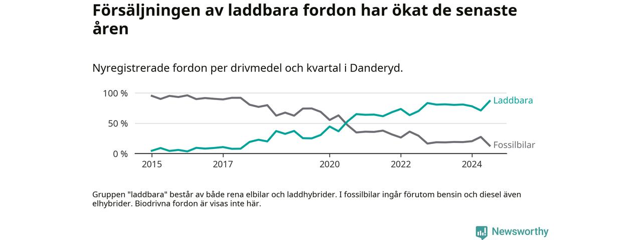De senaste åren har vi sett en kraftig ökning i försäljning av laddbilar i Sverige. Under slutet av 2023 och början av 2024 har utvecklingen stannat av. Men i Danderyd noterades ett nytt rekord under tredje kvartalet. Aldrig tidigare har laddbara bilar utgjort en så stor del av alla nya bilar.