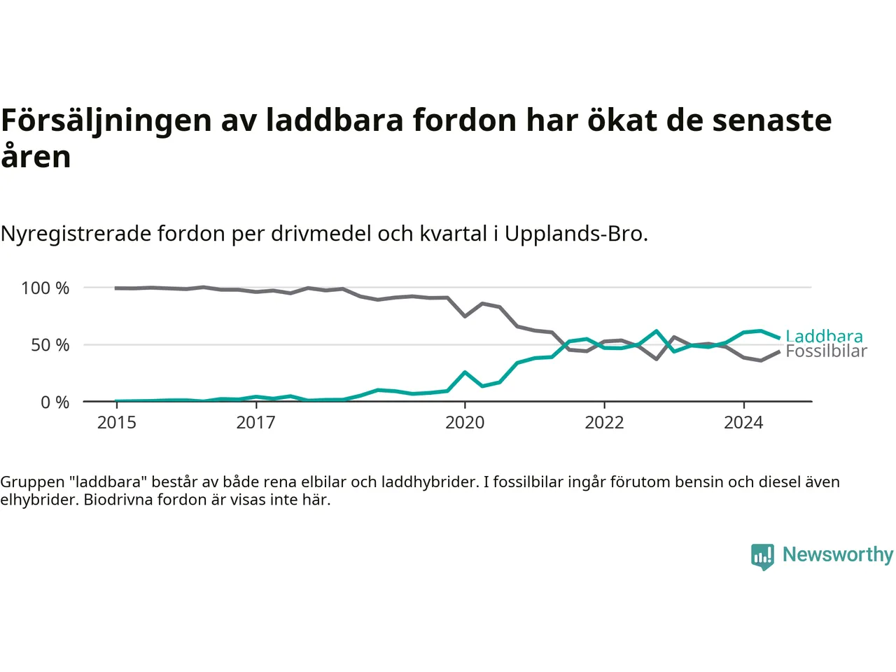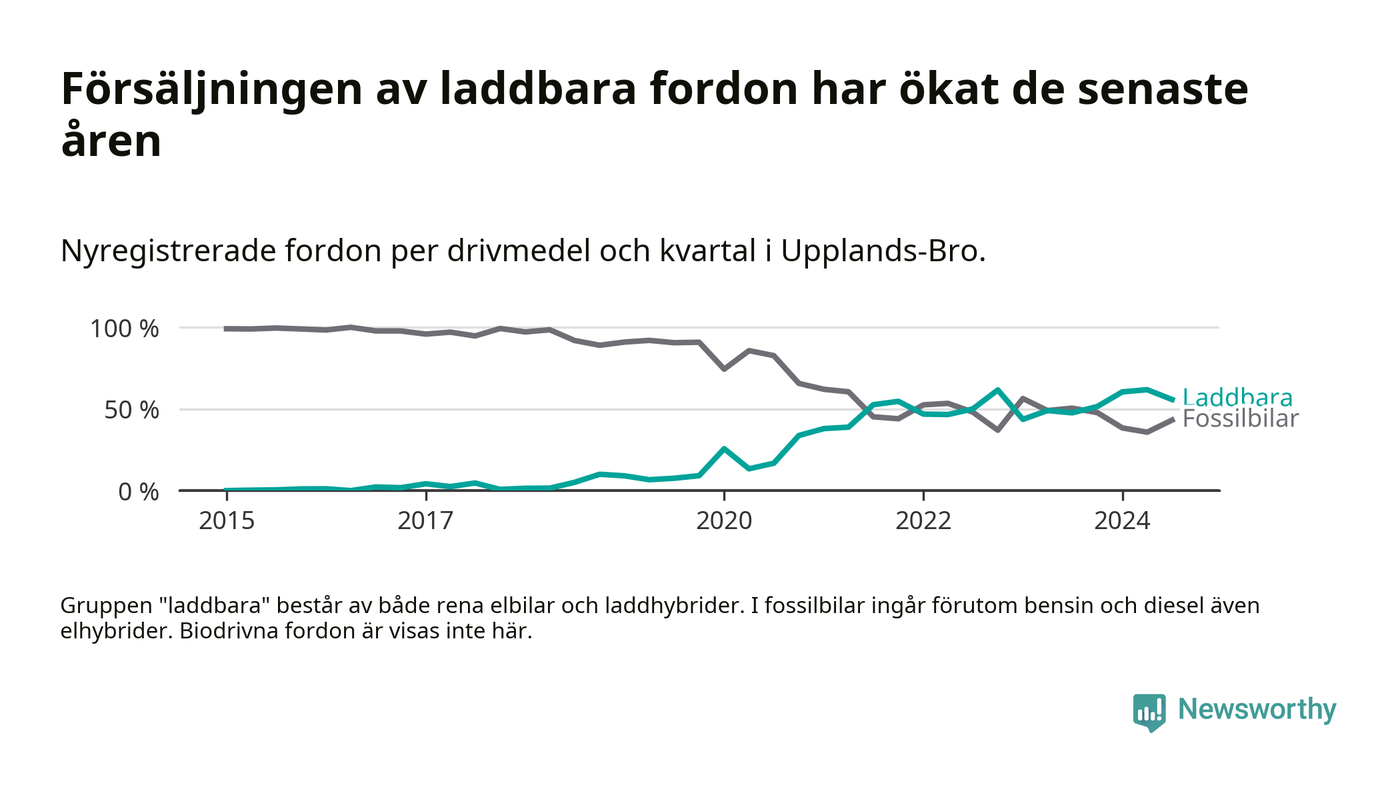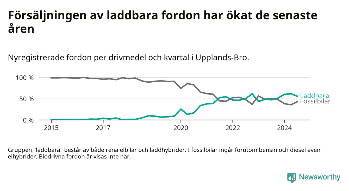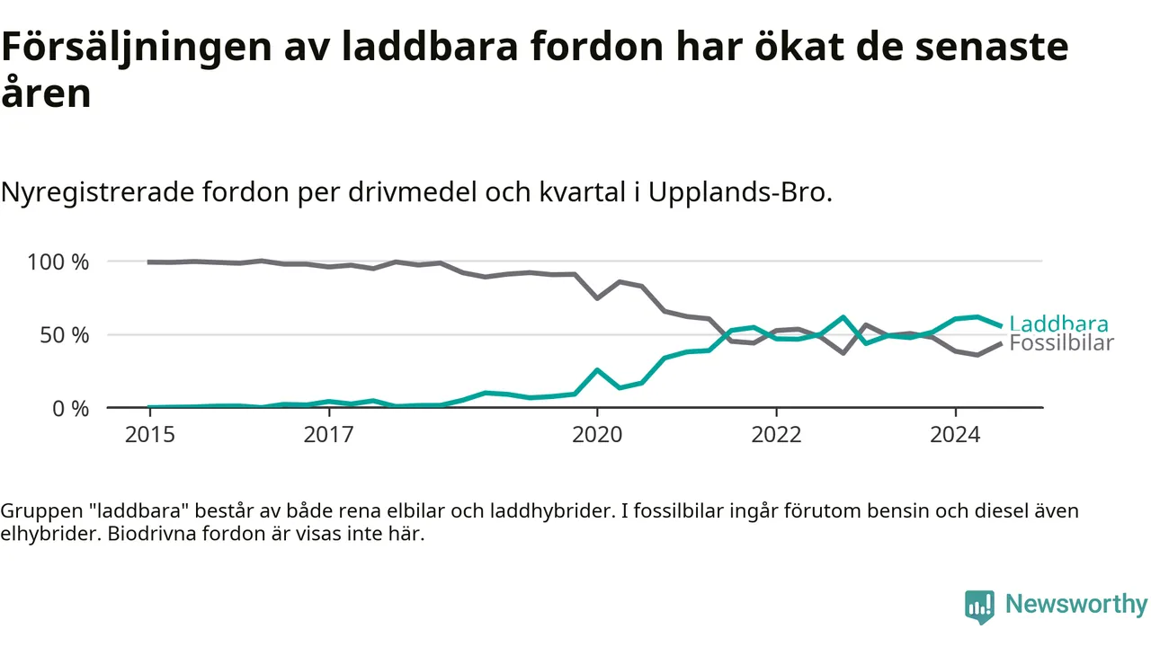 De senaste åren har vi sett en kraftig ökning i försäljning av laddbilar i Sverige. Under slutet av 2023 och början av 2024 har utvecklingen stannat av. I Upplands-Bro peakade andelen laddbara under andra kvartalet 2024 (62 procent).