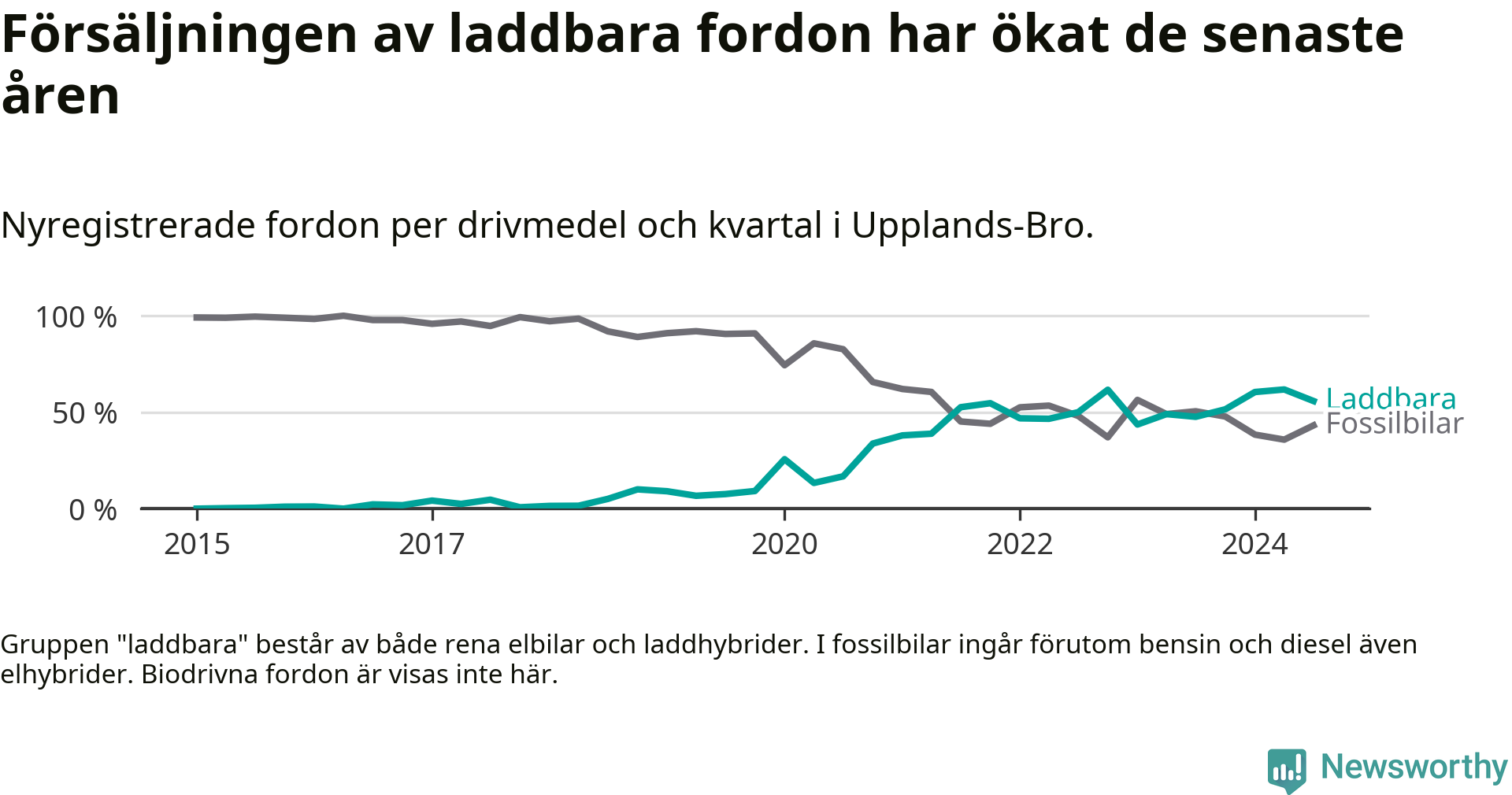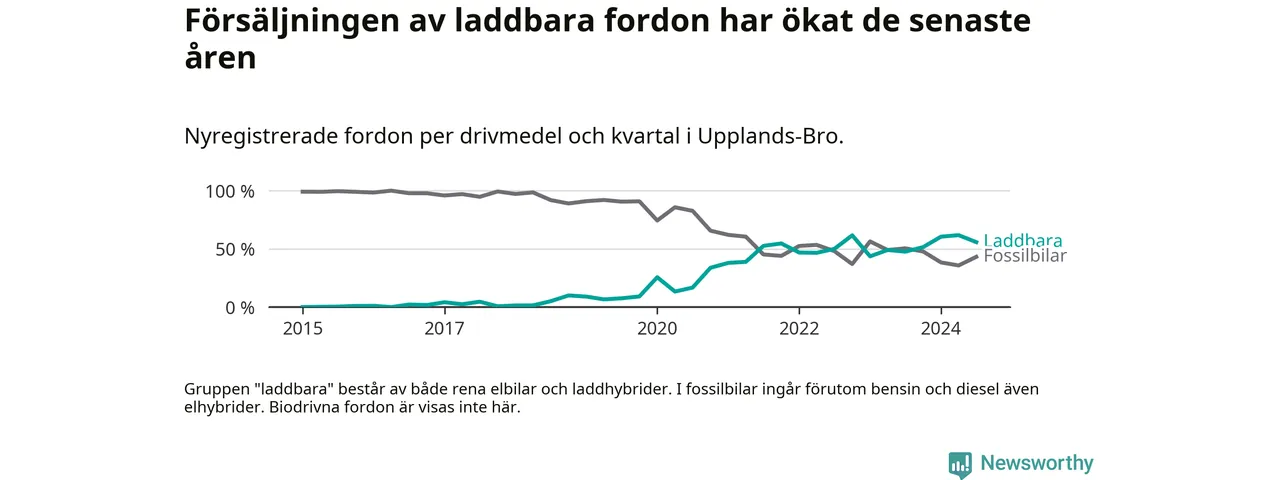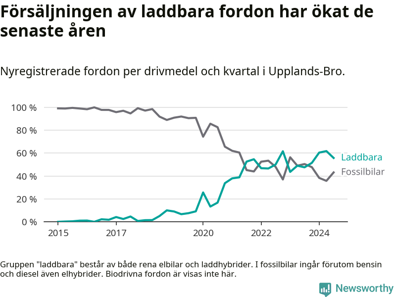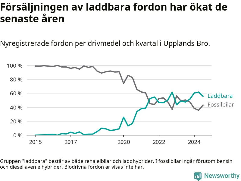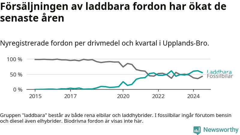 De senaste åren har vi sett en kraftig ökning i försäljning av laddbilar i Sverige. Under slutet av 2023 och början av 2024 har utvecklingen stannat av. I Upplands-Bro peakade andelen laddbara under andra kvartalet 2024 (62 procent).