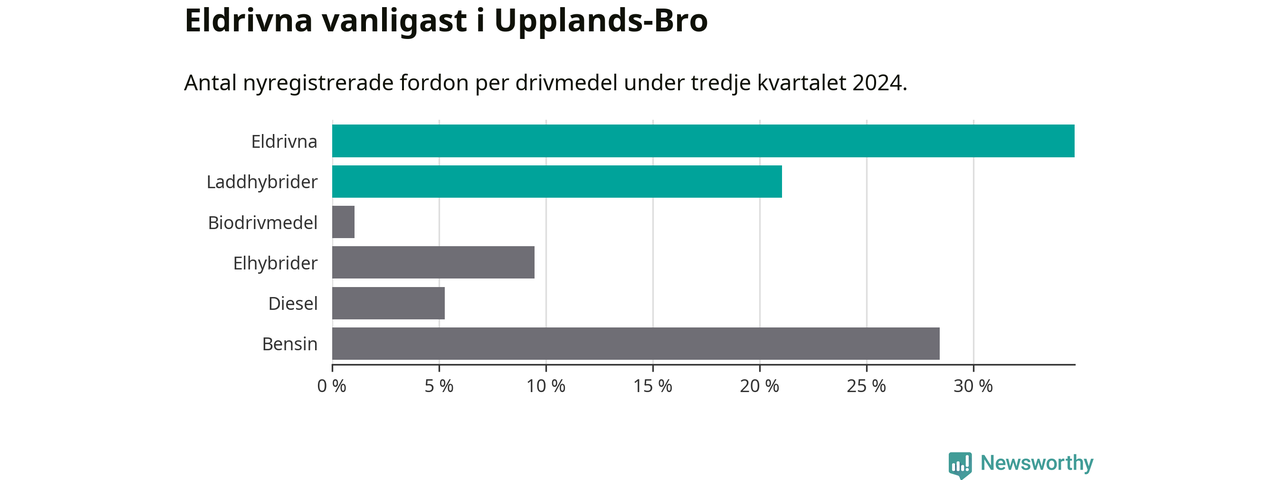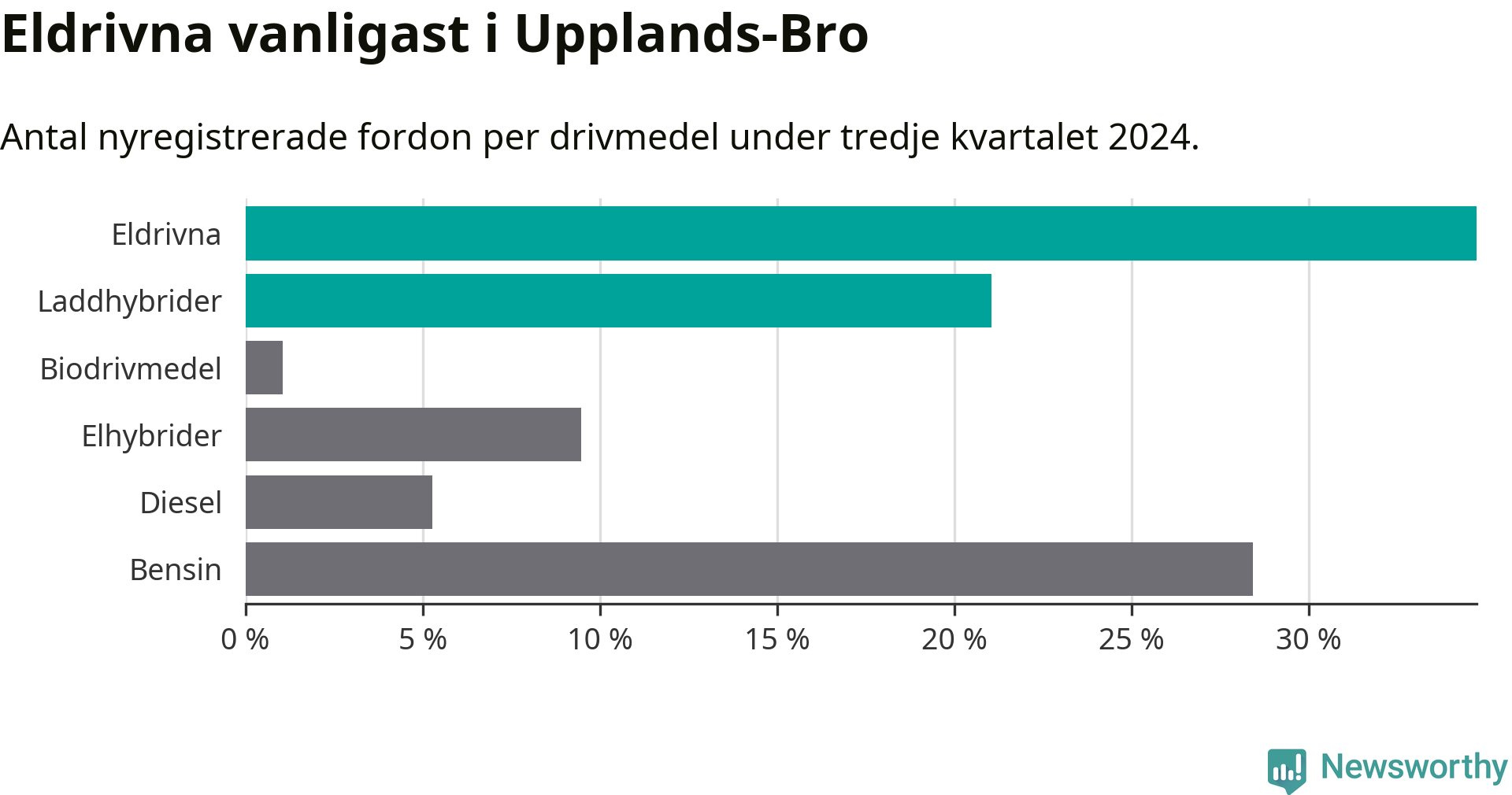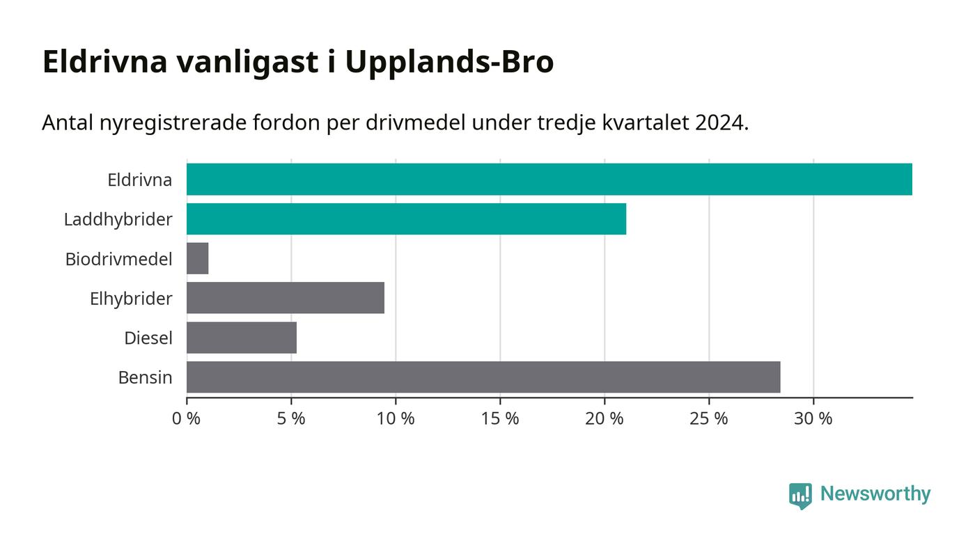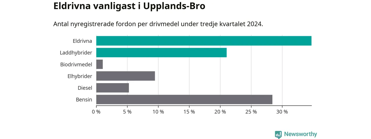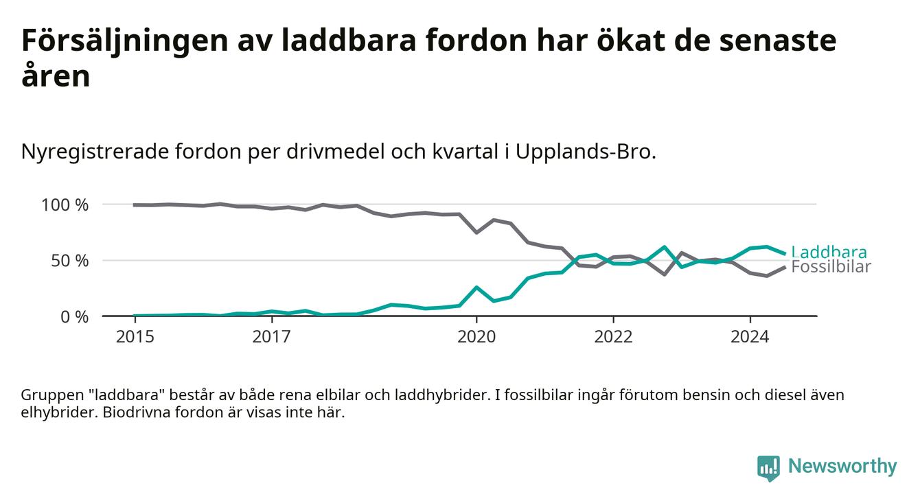 Under tredje kvartalet 2024 var 56 procent av alla nyregistrerade personbilar i Upplands-Bro laddbara (sammanlagt registrerades 95 nya bilar). Merparten av de laddbara bilarna var rena elbilar (35 procent av alla).