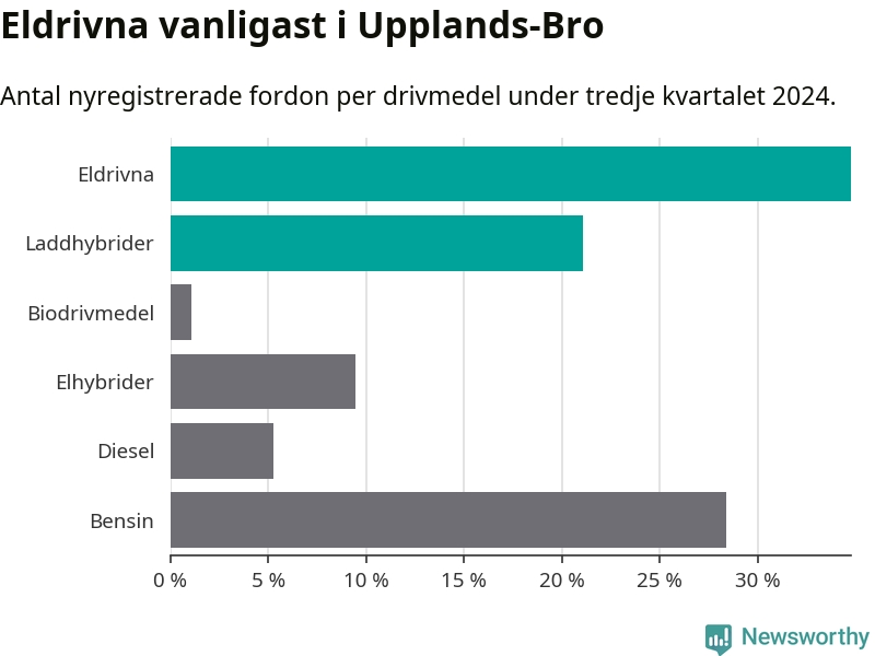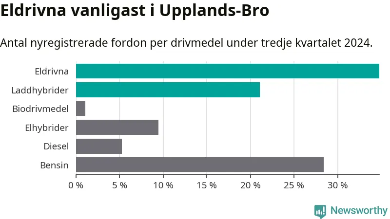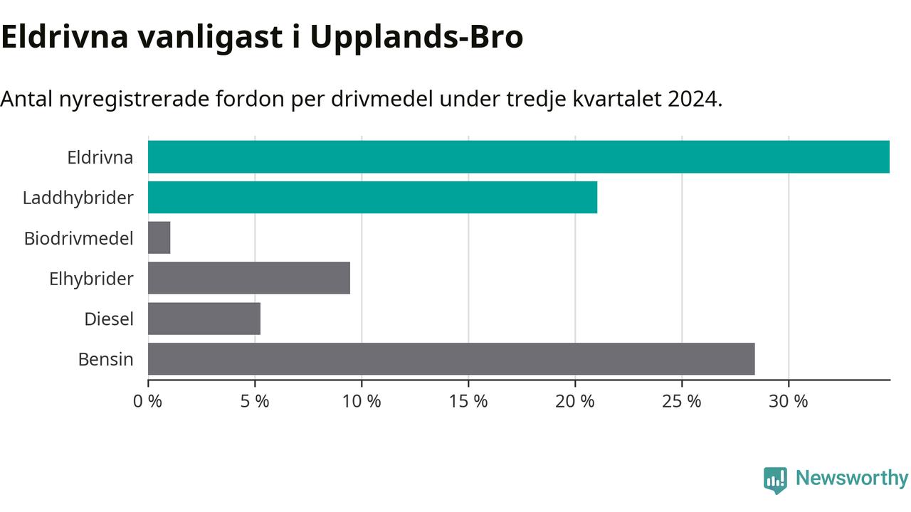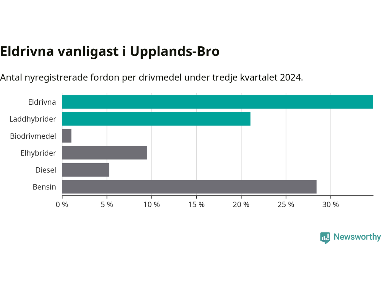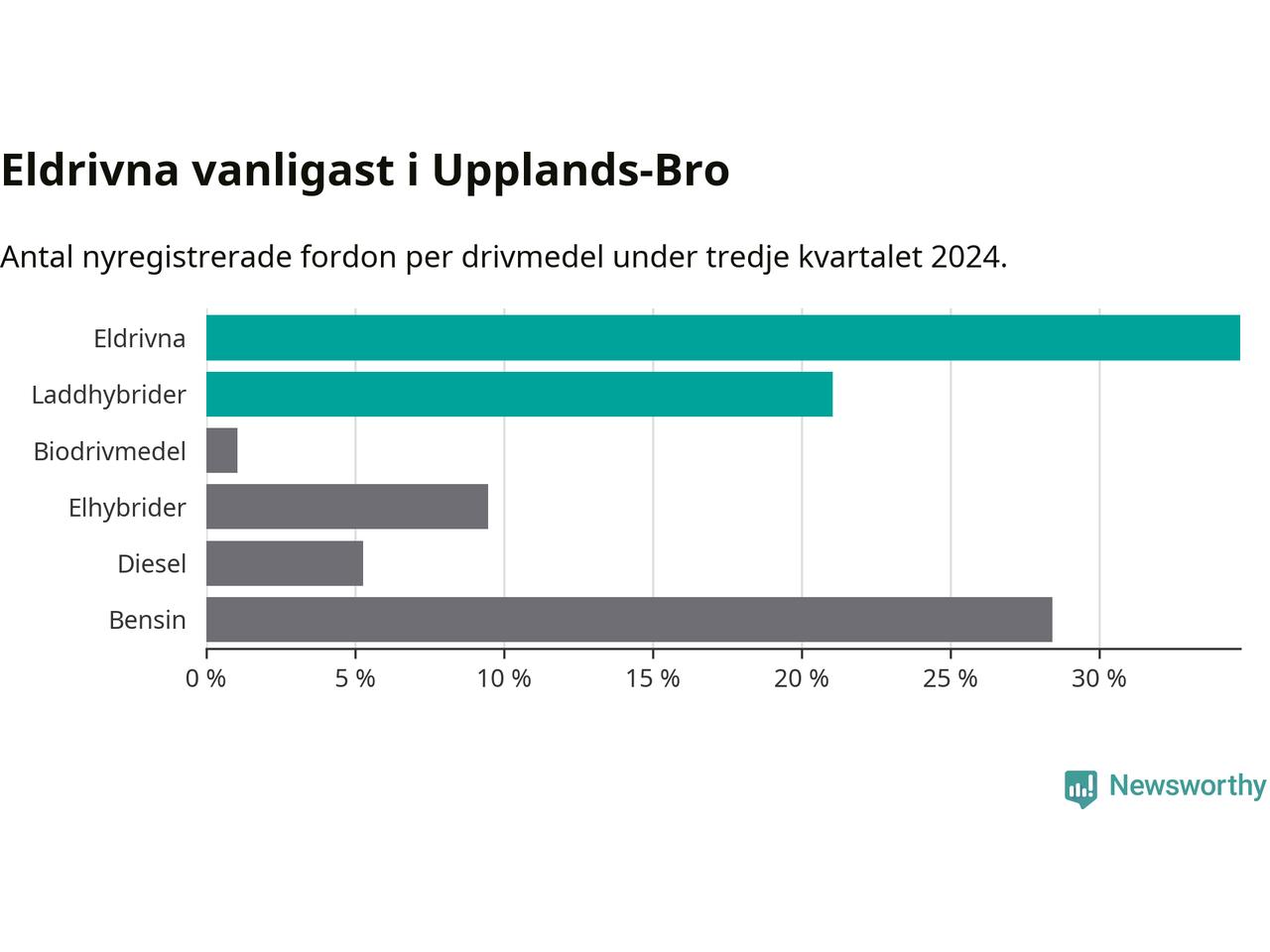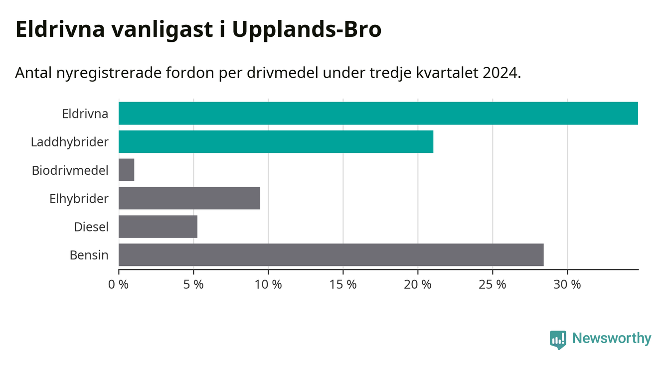 Under tredje kvartalet 2024 var 56 procent av alla nyregistrerade personbilar i Upplands-Bro laddbara (sammanlagt registrerades 95 nya bilar). Merparten av de laddbara bilarna var rena elbilar (35 procent av alla).
