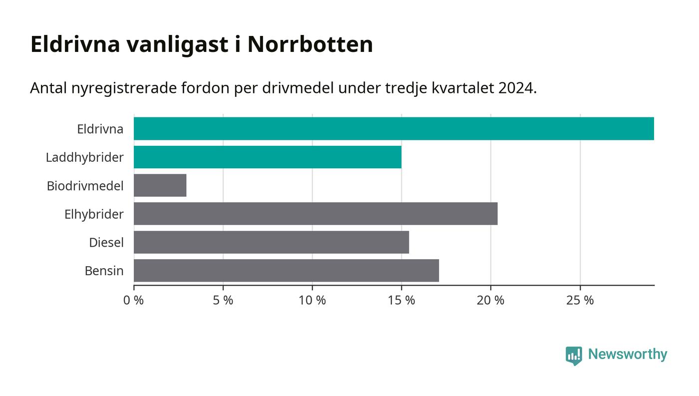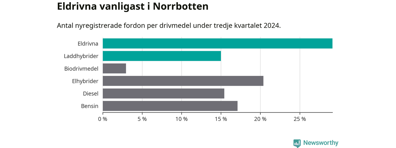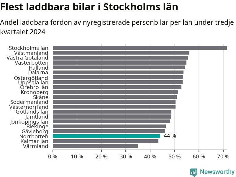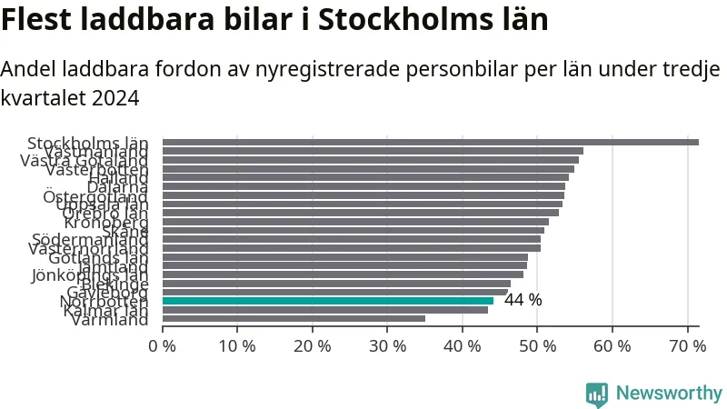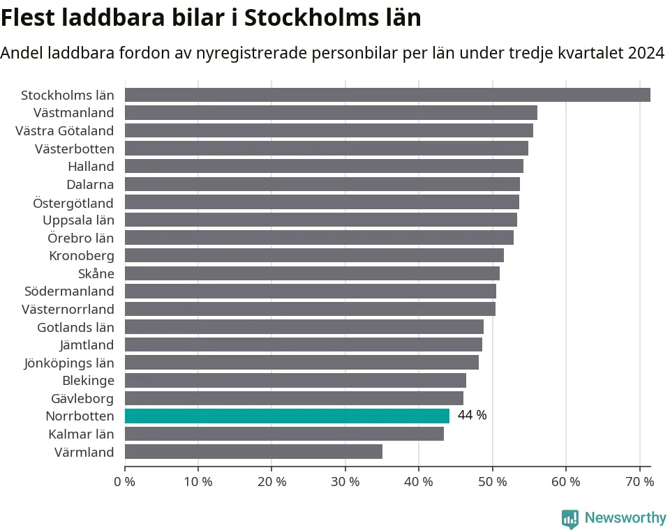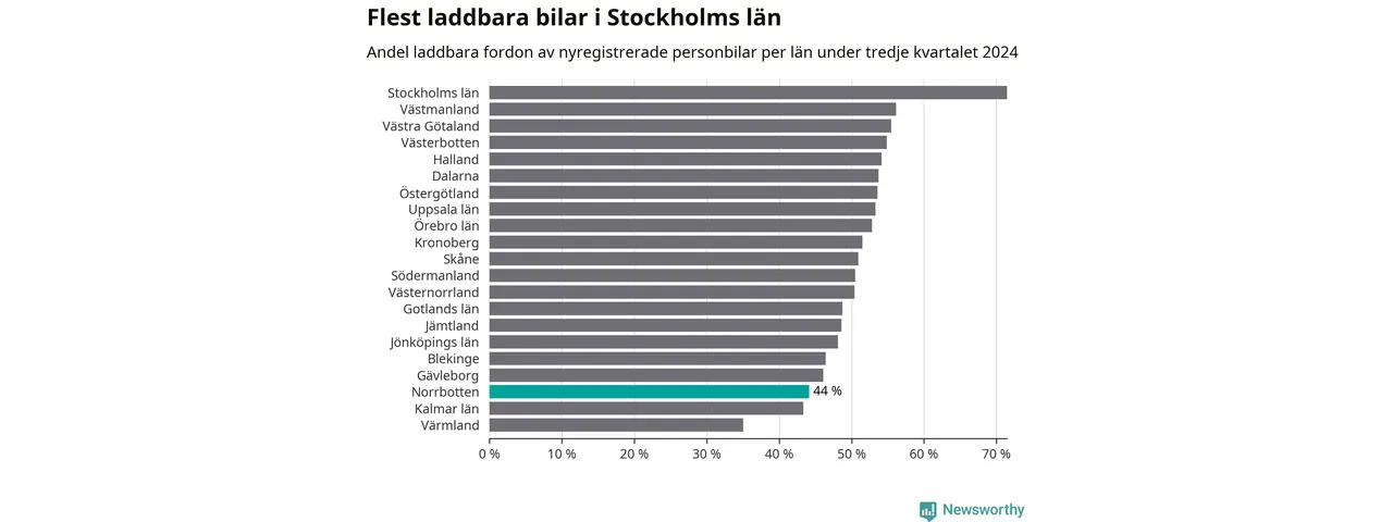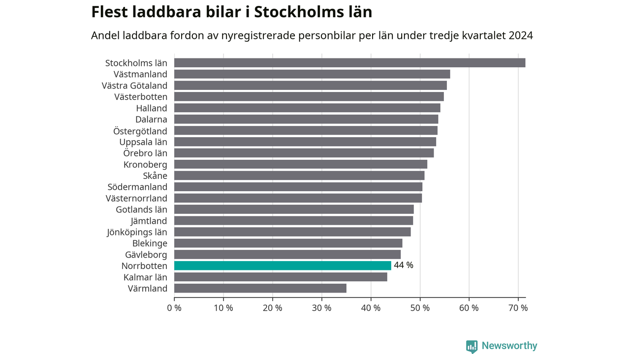 Under tredje kvartalet 2024 var 44 procent av alla nyregistrerade personbilar i Norrbotten laddbara (sammanlagt registrerades 947 nya bilar). Merparten av de laddbara bilarna var rena elbilar (29 procent av alla).