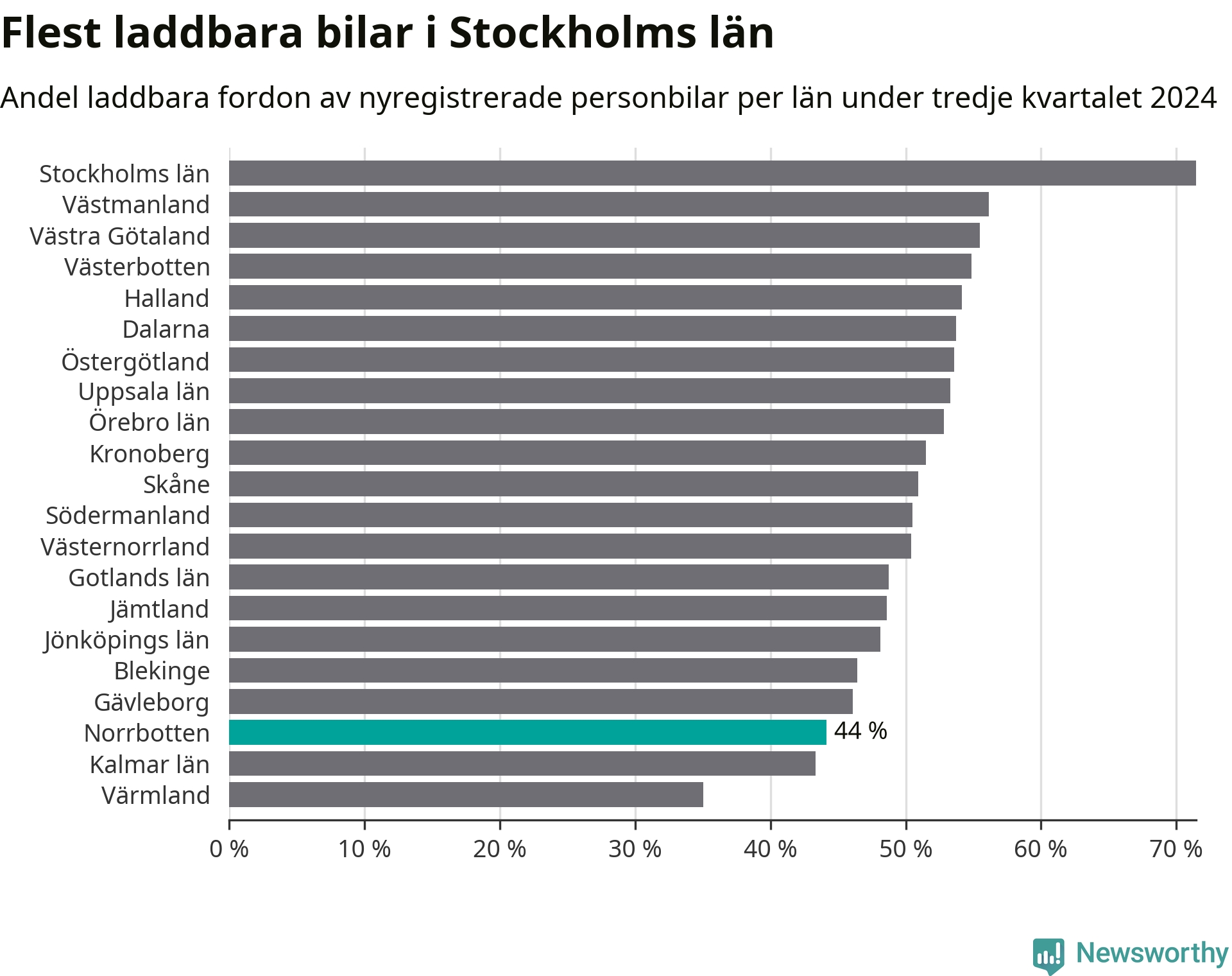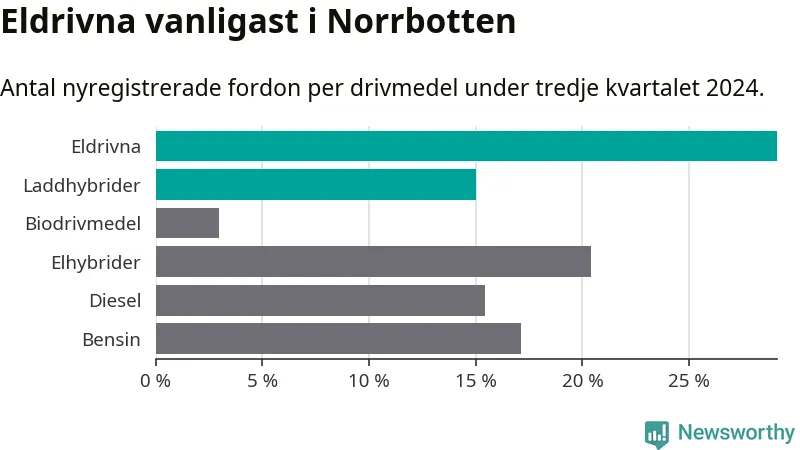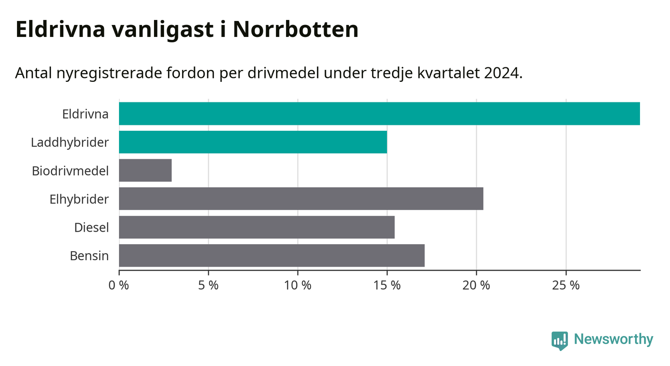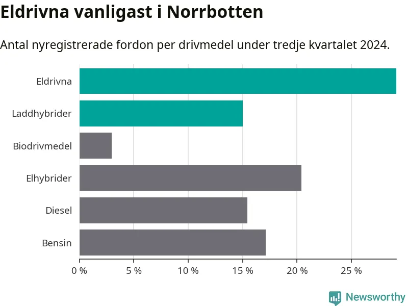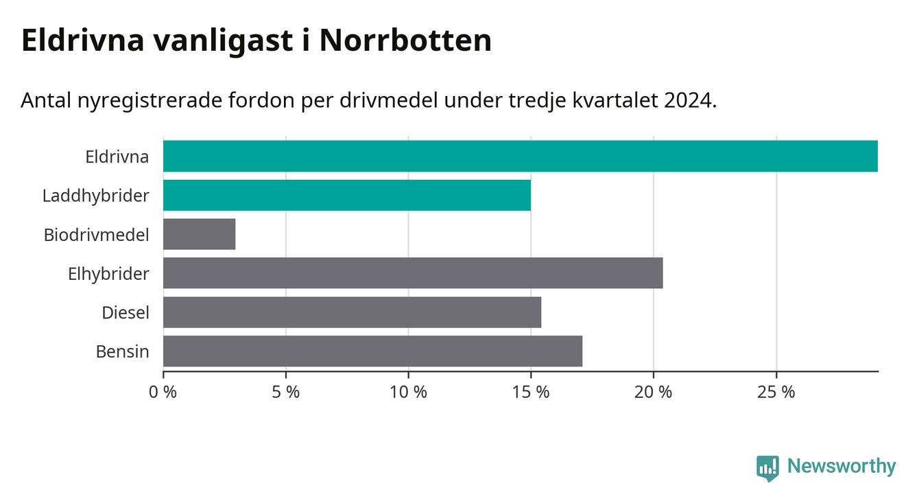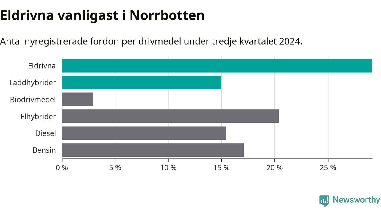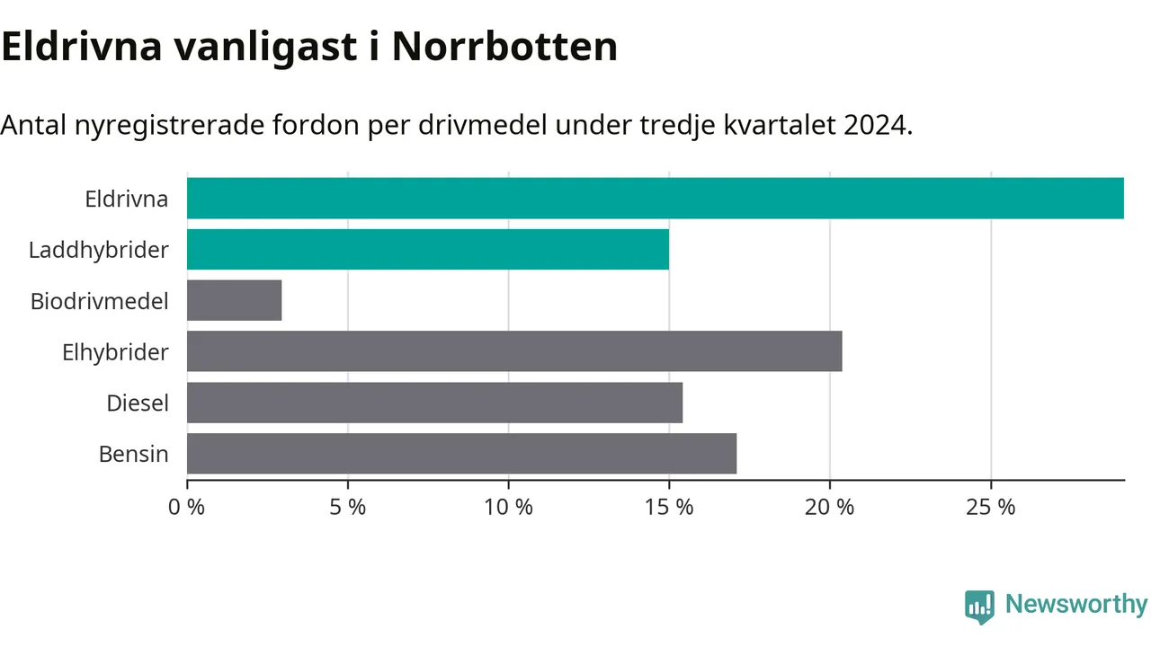 Under tredje kvartalet 2024 var 44 procent av alla nyregistrerade personbilar i Norrbotten laddbara (sammanlagt registrerades 947 nya bilar). Merparten av de laddbara bilarna var rena elbilar (29 procent av alla).