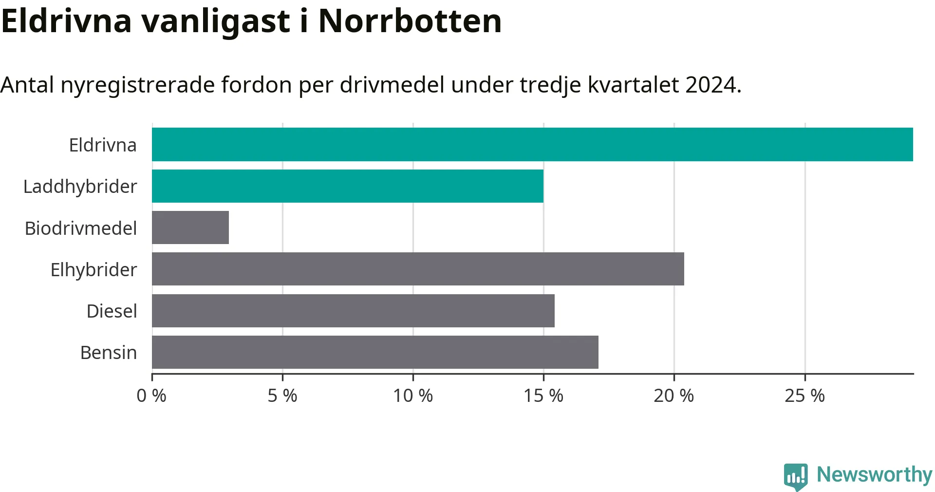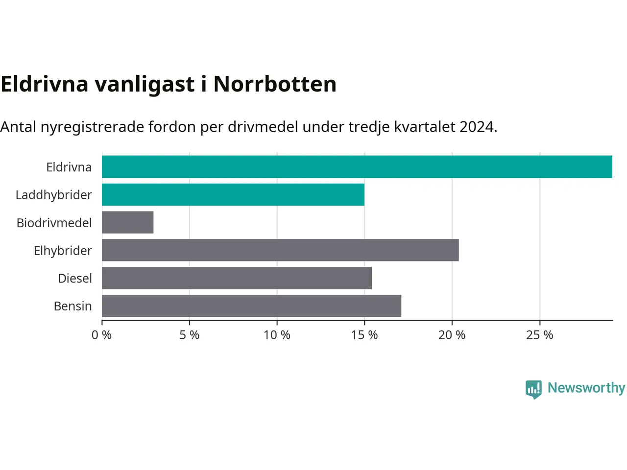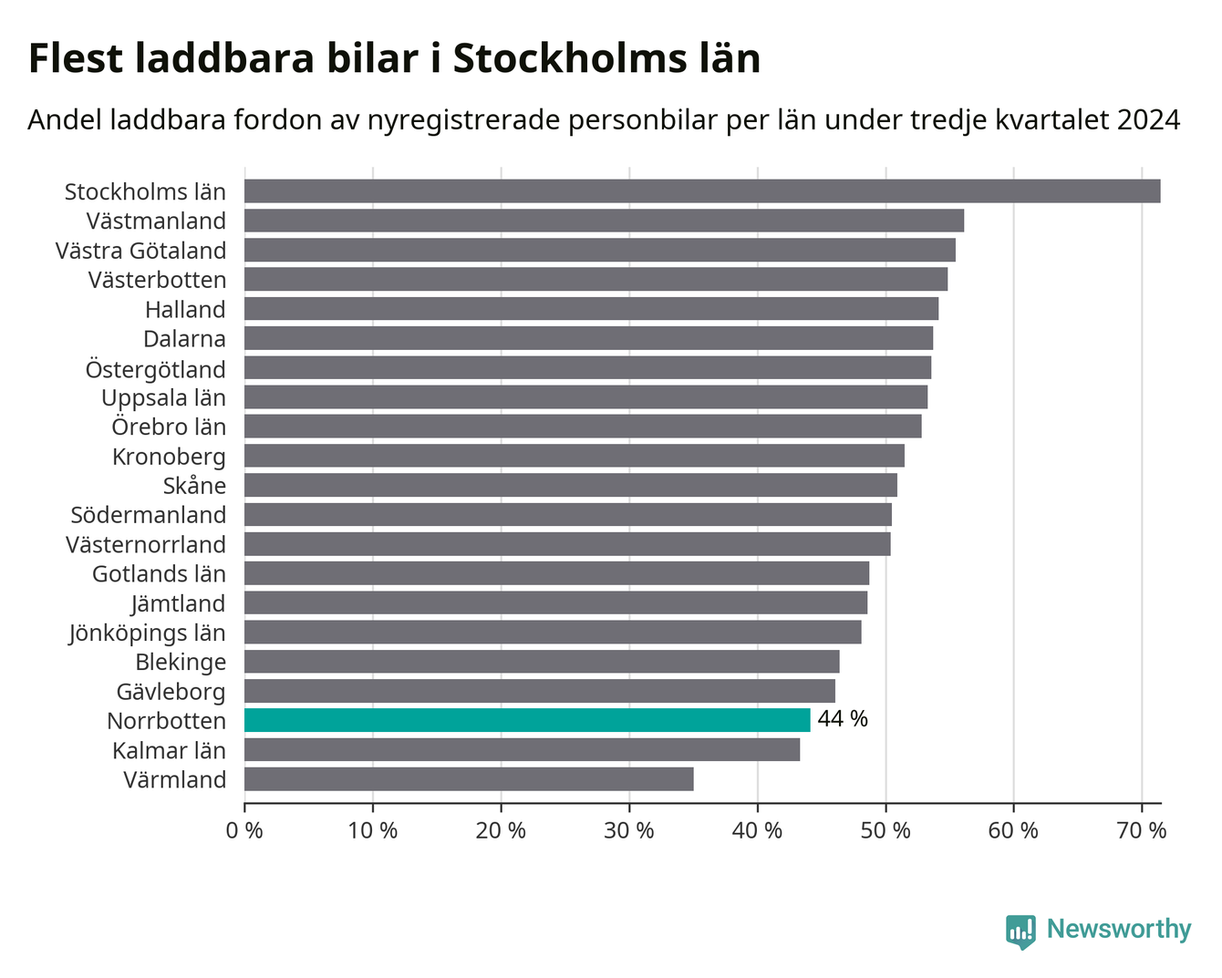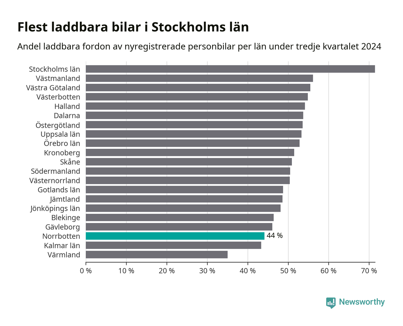 Under tredje kvartalet 2024 var 44 procent av alla nyregistrerade personbilar i Norrbotten laddbara (sammanlagt registrerades 947 nya bilar). Merparten av de laddbara bilarna var rena elbilar (29 procent av alla).