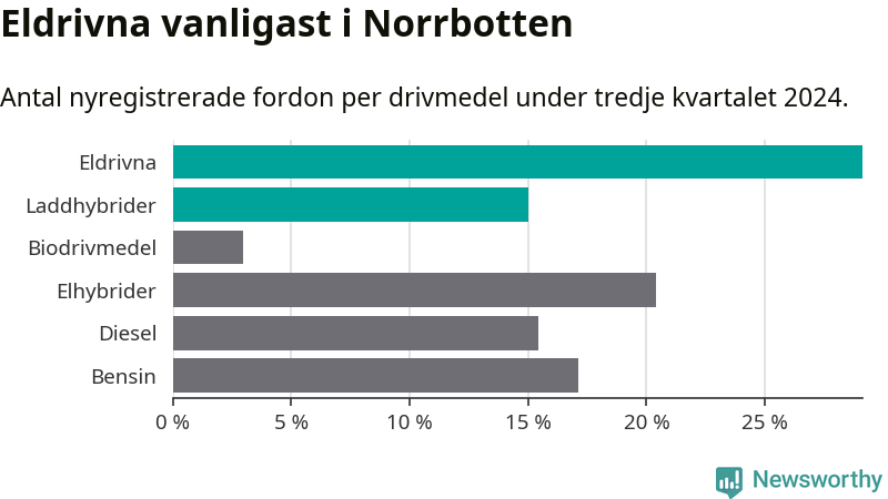 Jämfört med andra län säljs det förhållandevis få elbilar och laddhybrider i Norrbotten. Under tredje kvartalet var nyregistreringen tredje lägst i hela landet (bland 21 län).